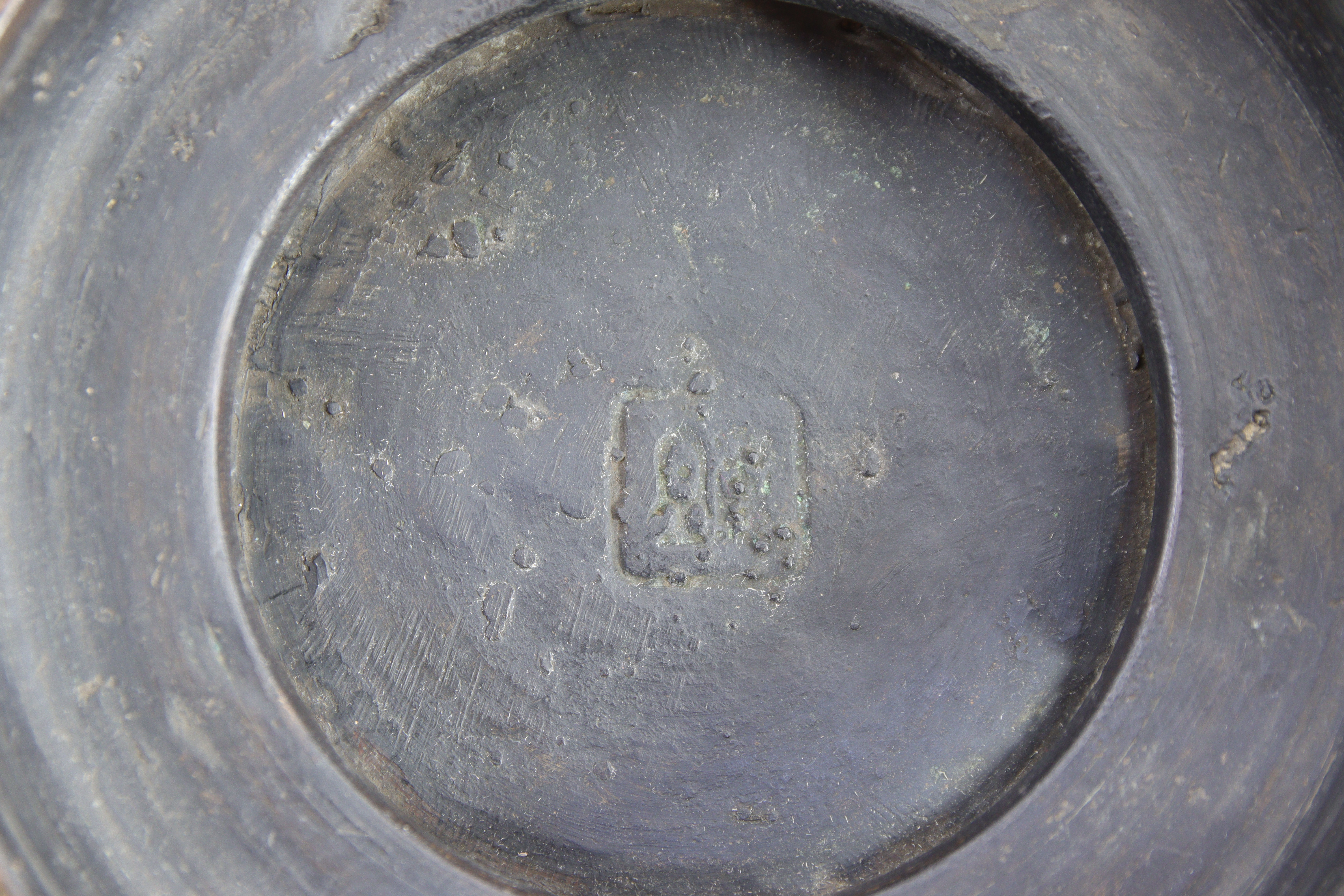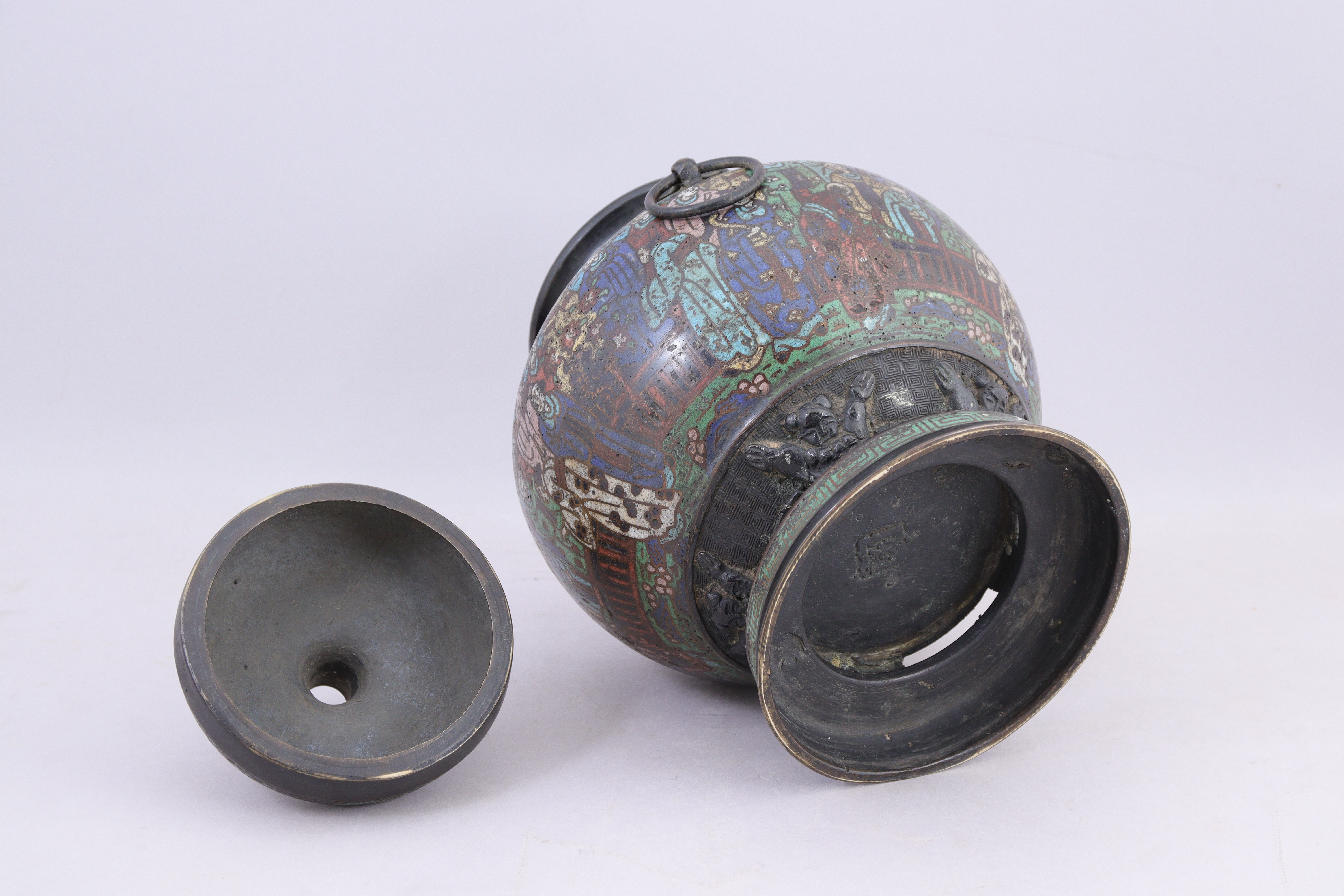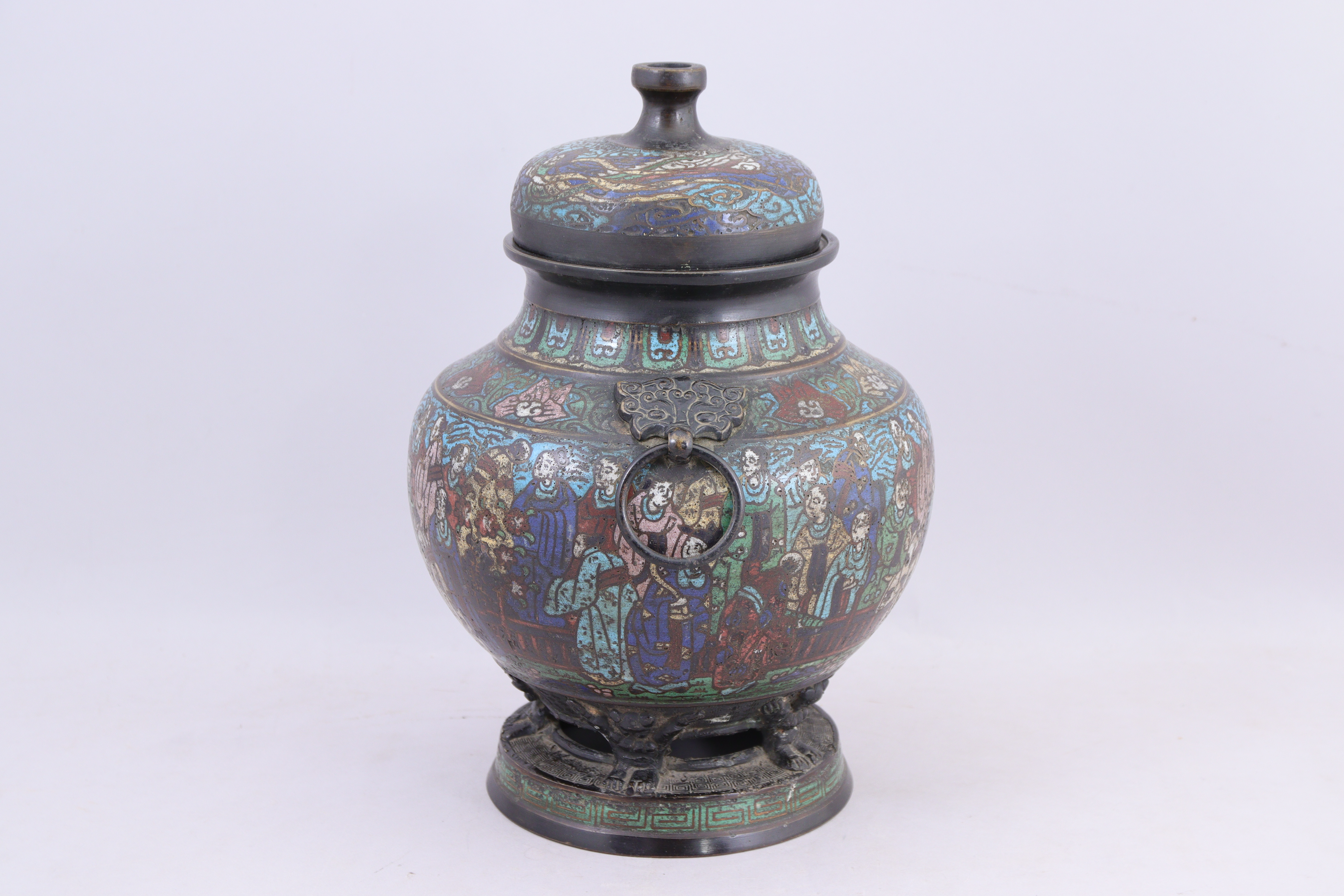 en émaux cloisonnés polychromes à décor de personnages, frises et fleurs, sur cinq pieds et anses en forme de têtes d'animaux.