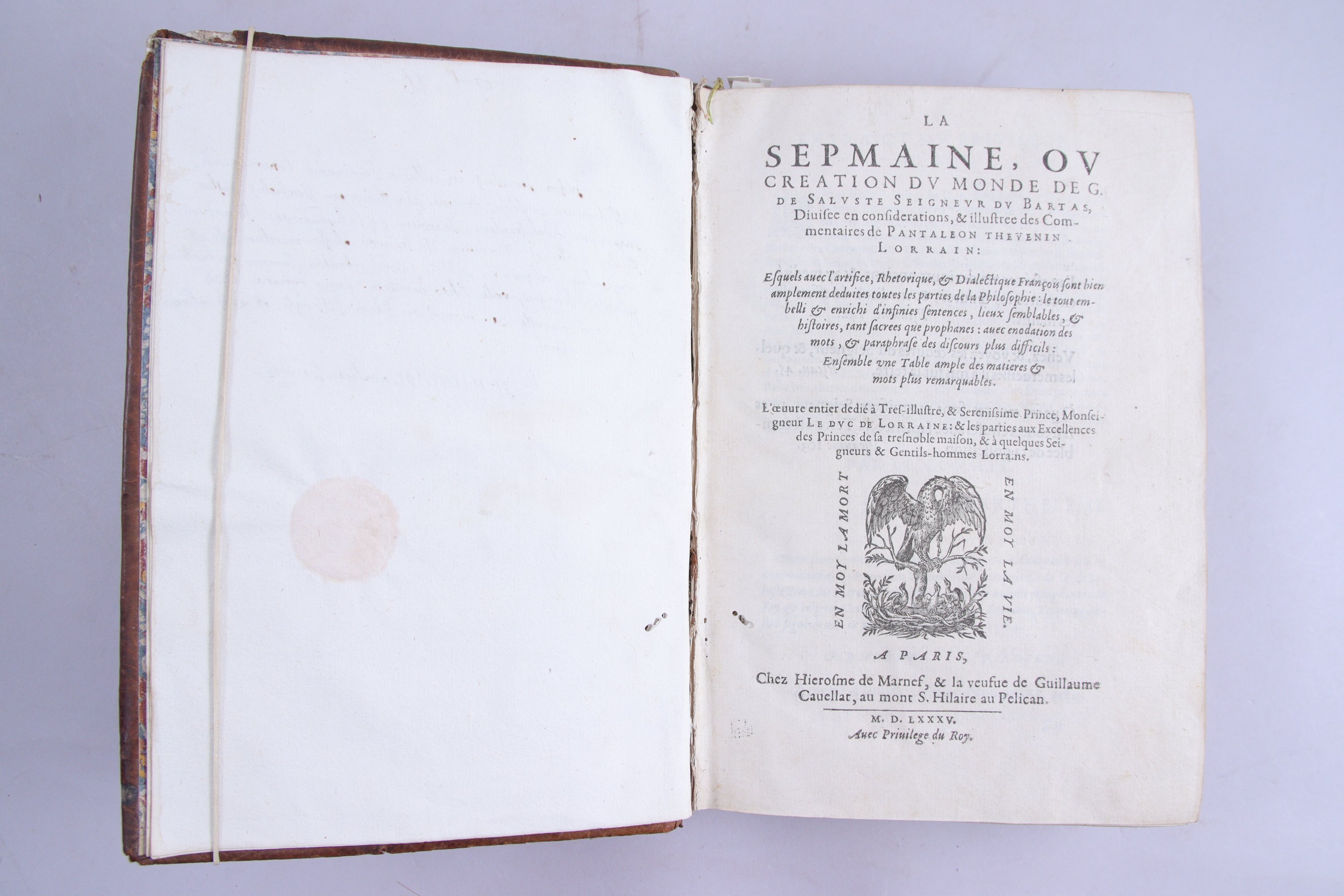 La Sepmaine, ou création du monde de G. de Saluste Seigneur du Bartas, divisée en considérations et illustrées des Commentaires de Pantaleon Thevenin, Lorrain. Esquels avec l'artifice, Rhetorique et Dialectique François sont bien amplement déduites touts les parties de la Philosophie : le tout embelli et enrichi d'infinies sentences, lieux semblables et histoires tant sacrées que prophanes : avec enodation des mots et paraphrase des discours plus difficils.