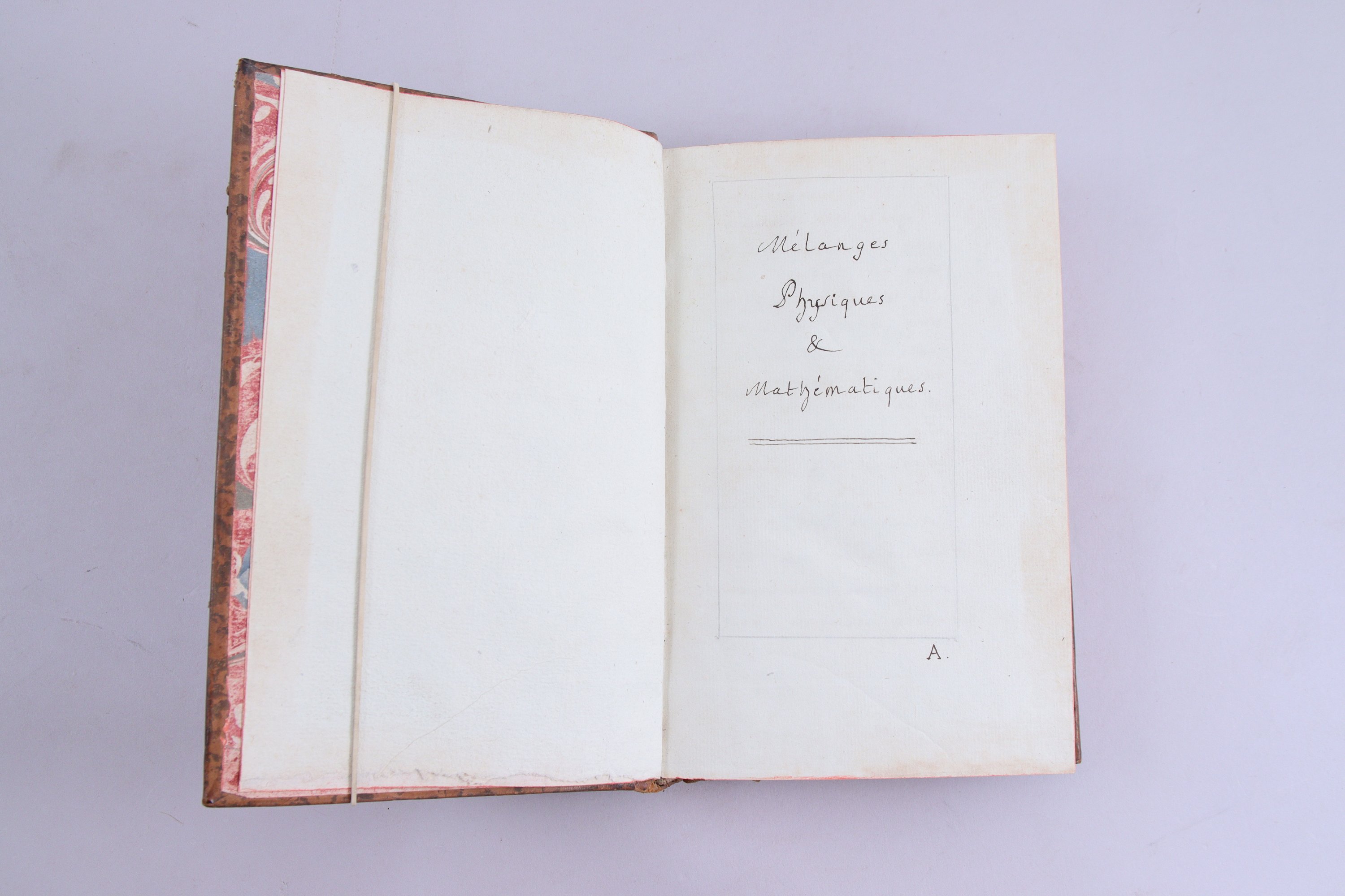 Table manuscrite en fin d'ouvrage indiquant quelques sujets de mathématiques, de géographie, d'optique, de mécanique ou de géométrie, mais aussi d'autres assez curieux : "Singularité dans la nature : canards-chats" (Un chat couve trois oeufs de cane - d'où sortent des monstres canards-chats...)..."Boeufs hermaphrodites", etc...