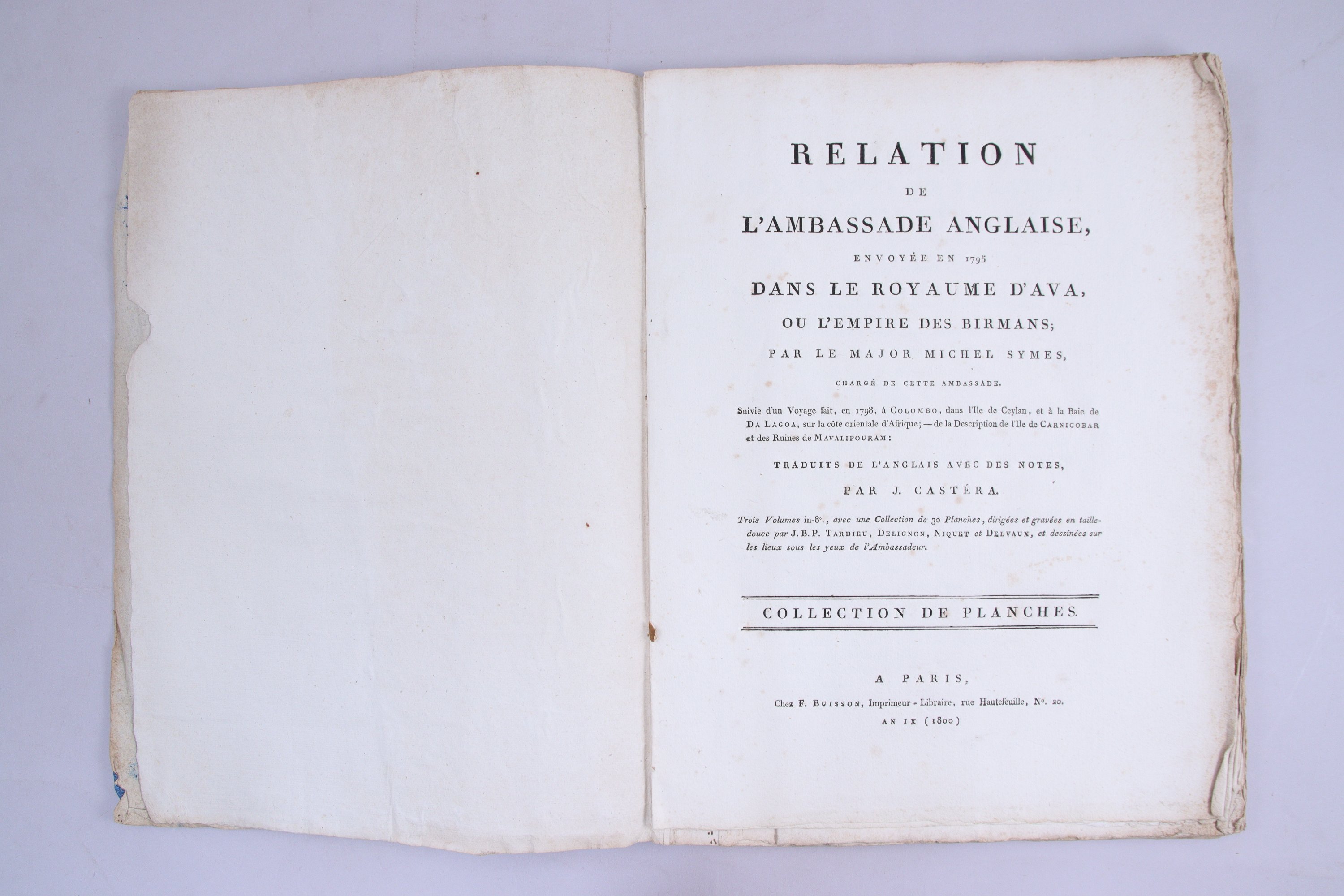 Relation de l'Ambassade anglaise envoyée en 1795 dans la Royaume d'Ava ou l'Empire des Birmans, par la Major Michel Symes chargé de cette ambassade. Suivie d'un voyage fait en 1798 à Colombo, dans l'île de Ceylan, et à la Baie de Da Lagoa sur la côte orientale d'Afrique, de la description de l'Ile de Carnicobar et des ruine de Mavalipouram. Collection de planches.