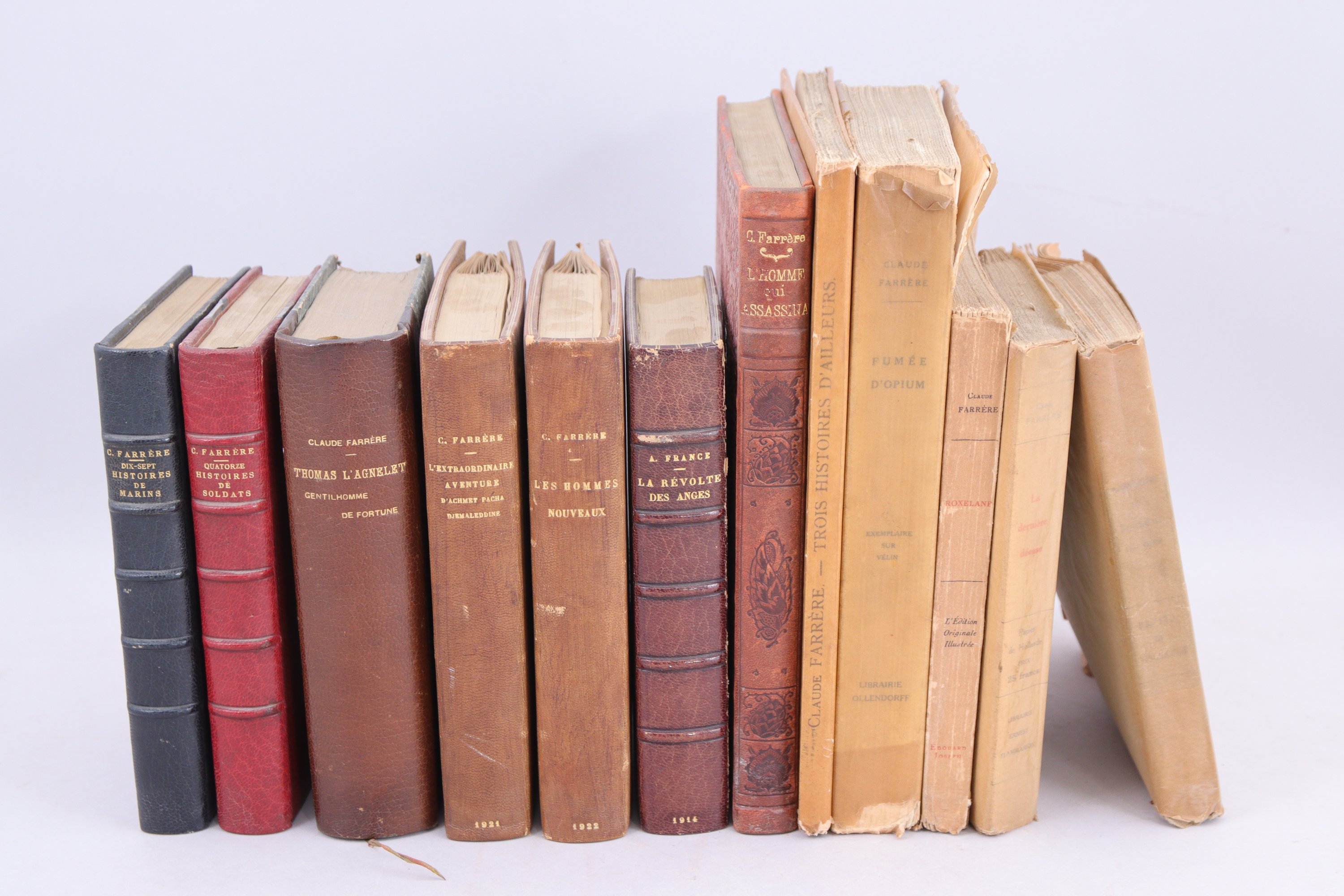 Ensemble de 11 ouvrages de Claude Farrère en édition originale (5 reliés, avec couvertures conservées, et 6 brochés), Et 1 ouvrage d'Anatole France. Soit 12 volumes. Tous avec envoi au Comte de Montrichard.
