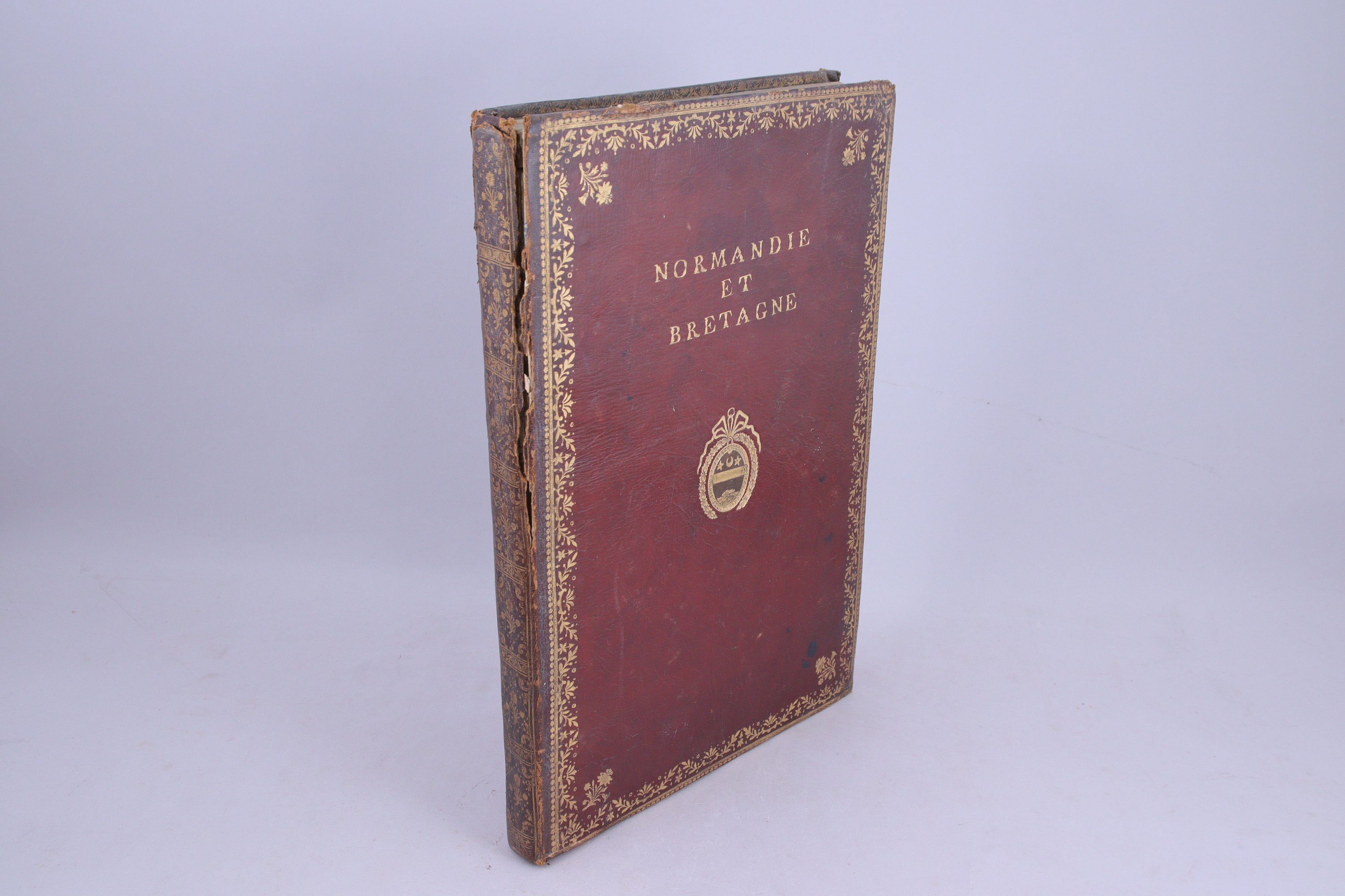 Dans un album en maroquin rouge in-folio, portant la mention :"Normandie et Bretagne" (Milieu du XVIIIème siècle). Ont été poussées au centre des armoiries du XIXème siècle. Le corps d'ouvrage a été remplacé par quelques photographies industrielles italiennes de la fin XIXème.
