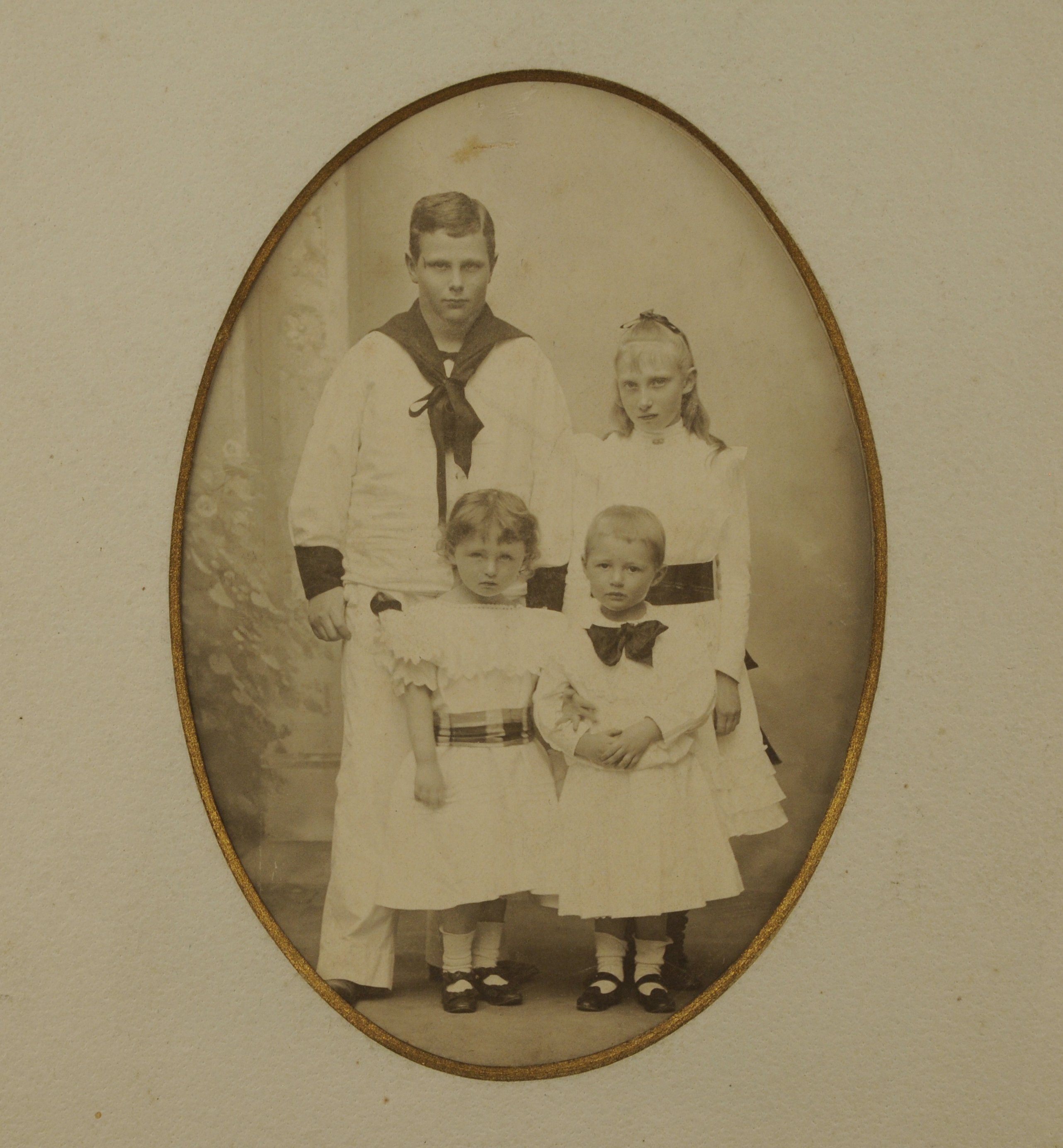 - Le Prince Gustave de Danemark enfant et ses trois soeurs. Vers 1900. Format ovale, 14 x 9,5 cm.