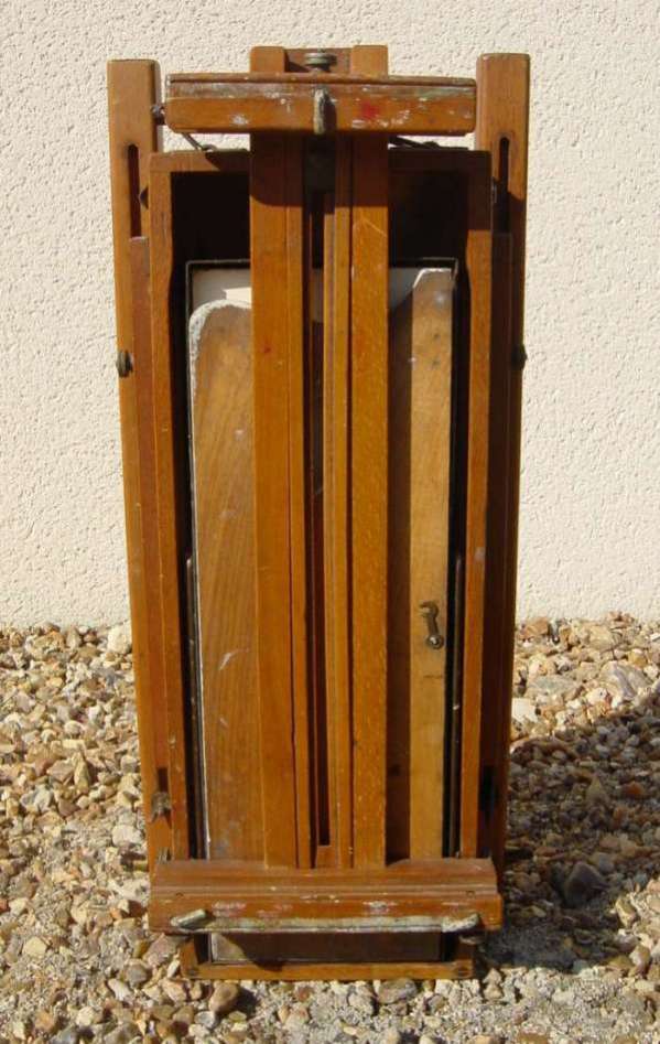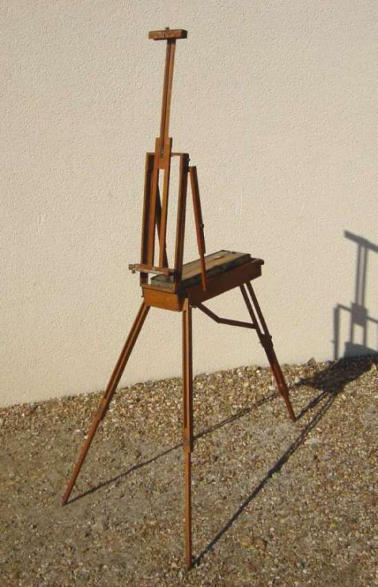 BOÎTE CHEVALET en bois naturel, pliant en plan. Contient une boîte de peinture en tôle et une palette pliante en bois. Marque "INNOVA".