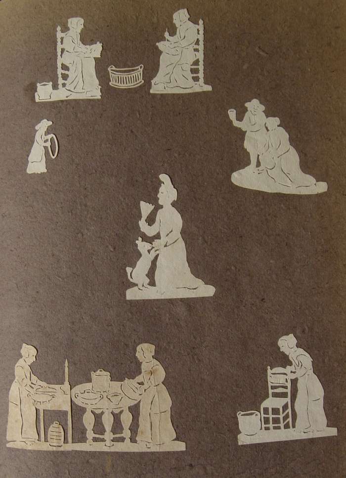 RECUEIL de silhouettes découpés sur canivets, environ 75 pages : personnages, animaux, fleurs, végétaux, scènes de la vie quotidienne... Album in-4, pleine reliure en vélin. Hollande, XVIIème-XVIIIème.