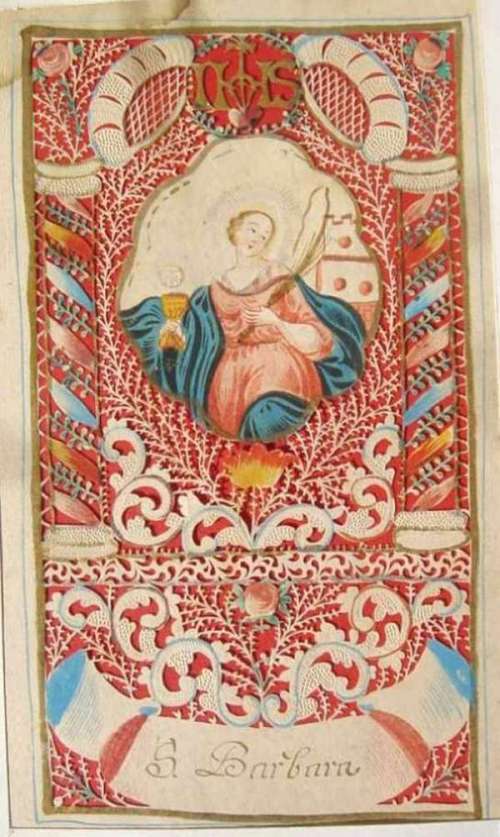 CANIVET. Sainte Barbe tenant d'une main un rameau et de l'autre un calice. Inscription "S Barbara". Papier (mouillure dans le coin supérieur gauche). XVIIIème. 26 x 15 cm.