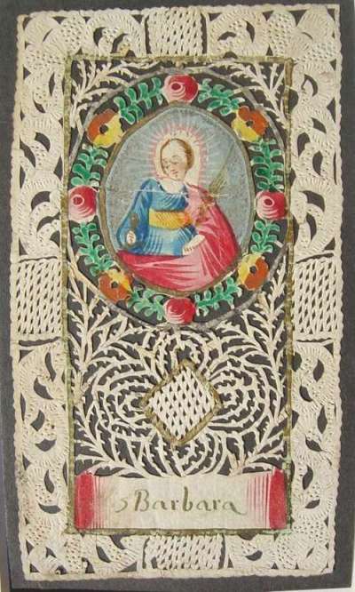 Sainte Barbe, format classique. Inscription "S Barbara". Papier. XVIIIème. 11 x 6,5 cm.