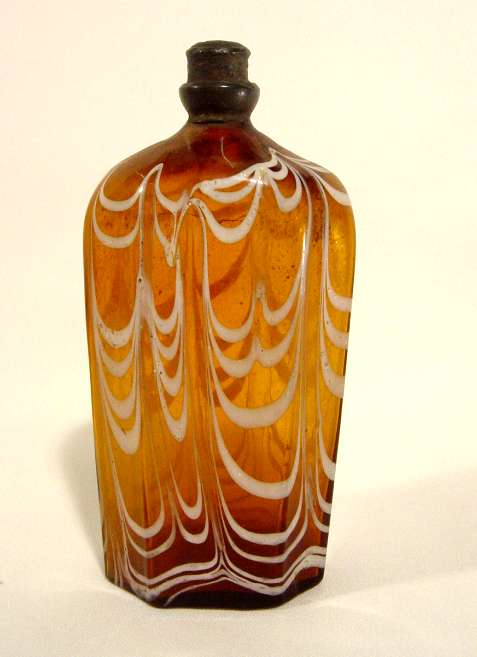 FLACON en verre ambré émaillé à décor de motifs blanc. Bouchon d'étain. Allemagne, XVIIIème. Haut. 14 cm.