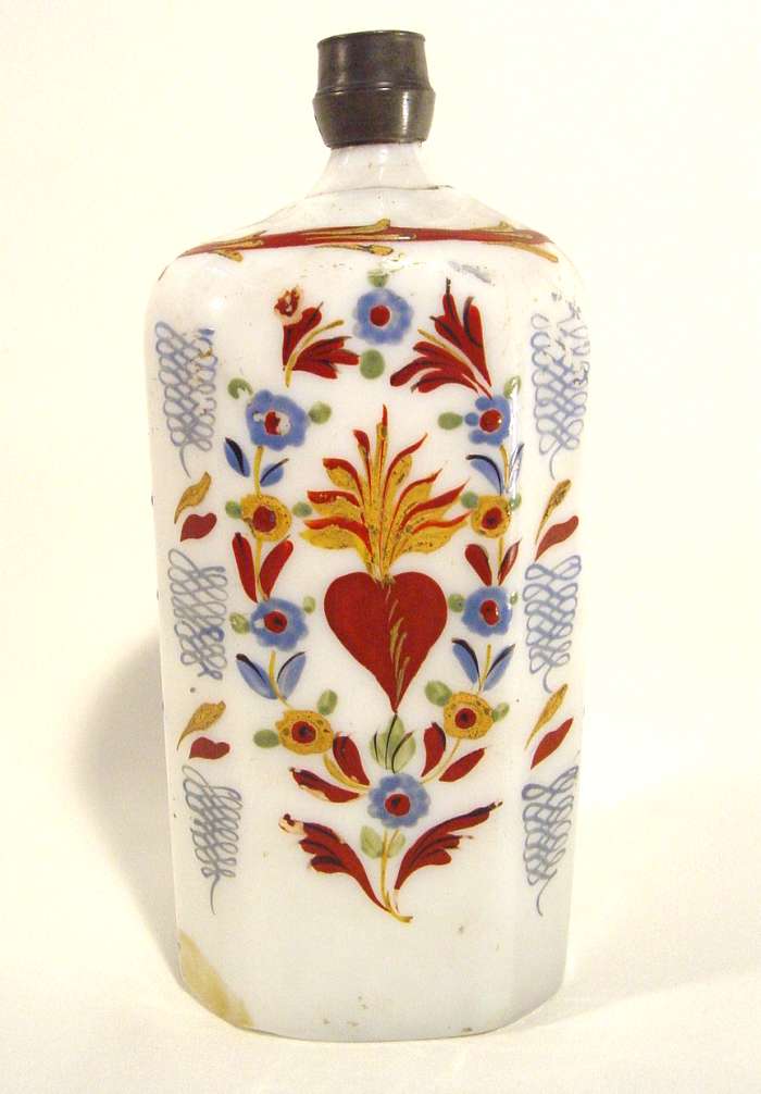 Grand FLACON en opaline blanche émaillée à décor polychrome de motifs floraux. Bouchon d'étain. Allemagne, XVIIIème. Haut. 20 cm.