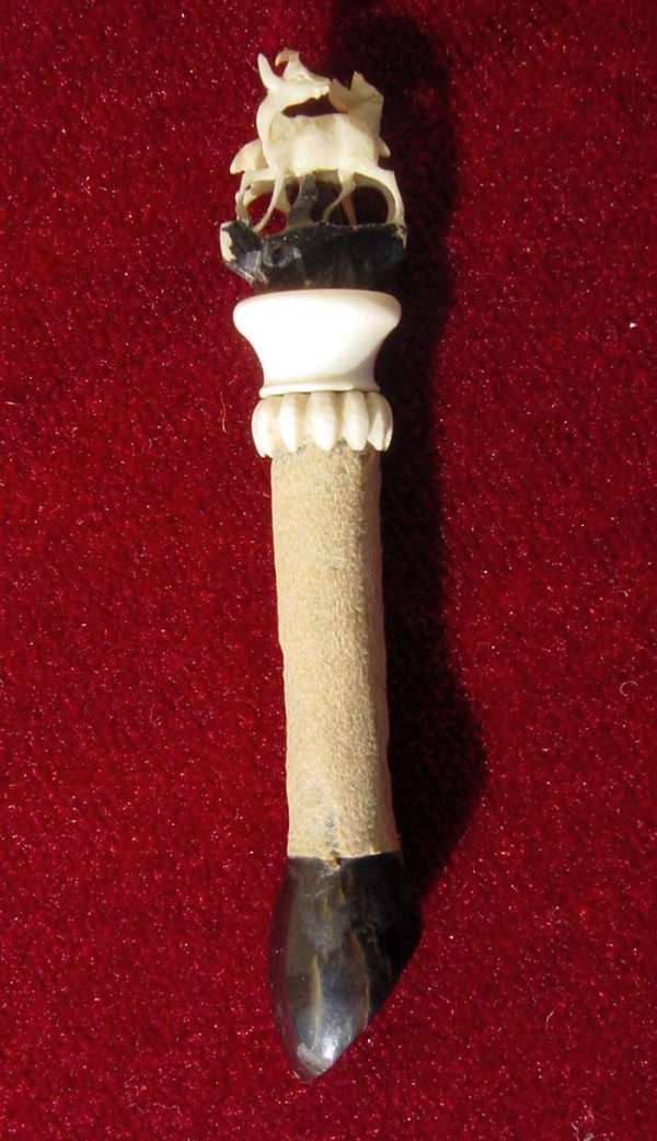 ÉTUI à aiguilles en forme de patte de cervidé, couvercle à vis en ivoire à décor sculpté de deux cervidés. (mque). Long. 10 cm.