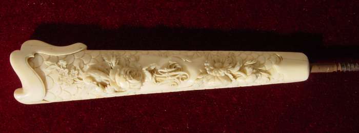 MANCHE d'ombrelle à décor sculpté d'oiseau, fleurs et écailles. Long. 18 cm.