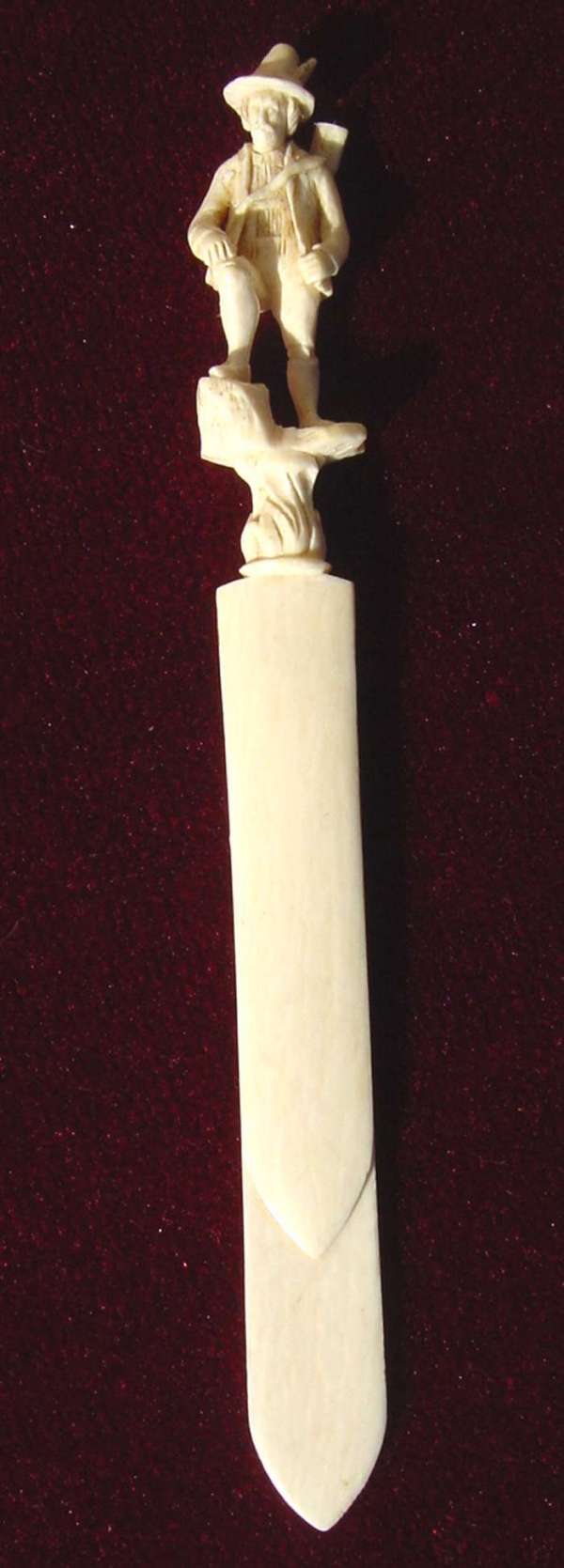 OUVRE-LETTRE. Manche à décor sculpté d'un chasseur bavarois. Long. 15 cm.