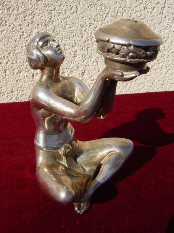 STATUETTE en métal argenté. Femme assise, jambes croisées, présentant une offrande. Début XXème. Haut. 19 cm.