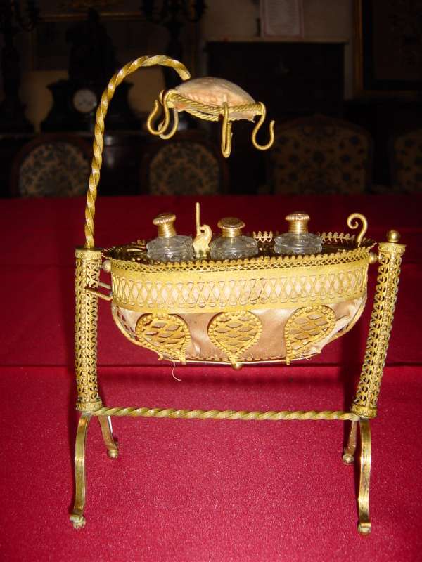 3 FLACONS À SELS en verre taillé, bouchons dorés. Monture en laiton et tissus, en forme de berceau. Fin XIXème. Haut. 20, Long. 15 cm.
