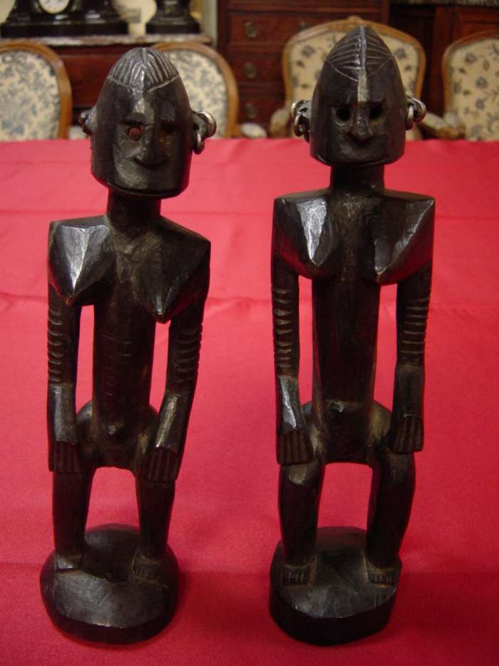 Paire de STATUETTES féminines en bois à patine noire, anneaux (mques). Afrique. Haut. 26 cm.