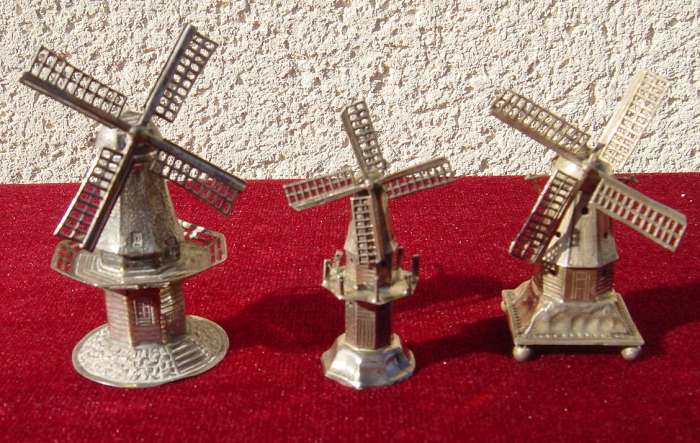 3 SUJETS en métal argenté : 3 moulins. Haut. 9 cm.