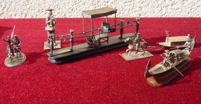 5 SUJETS en métal argenté : joueur de flûte, gondole vénitienne, cheval tirant une barge, Don Quichotte et Sancho Pança, chaise à 4 porteurs. Haut. 5,5 cm.