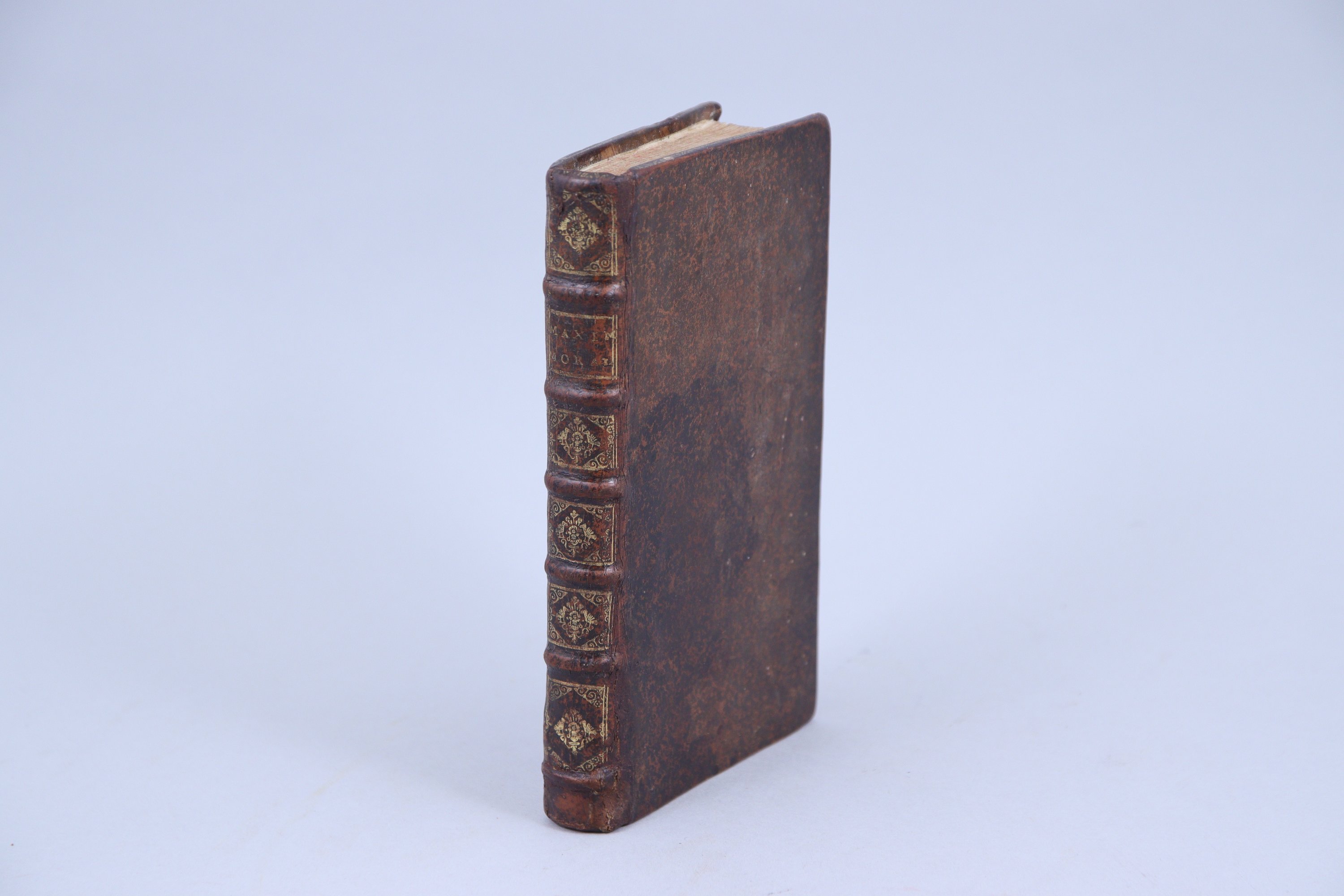In-12, (1 f. blanc), (3 ff), 195 pages et (6 ff). Veau du temps. (Restaurations aux coiffes ; marges de gouttière des 2 premiers et 2 derniers feuillets partiellement doublées. Cachet gras "Collection Henri Debard" au recto du premier feuillet blanc).