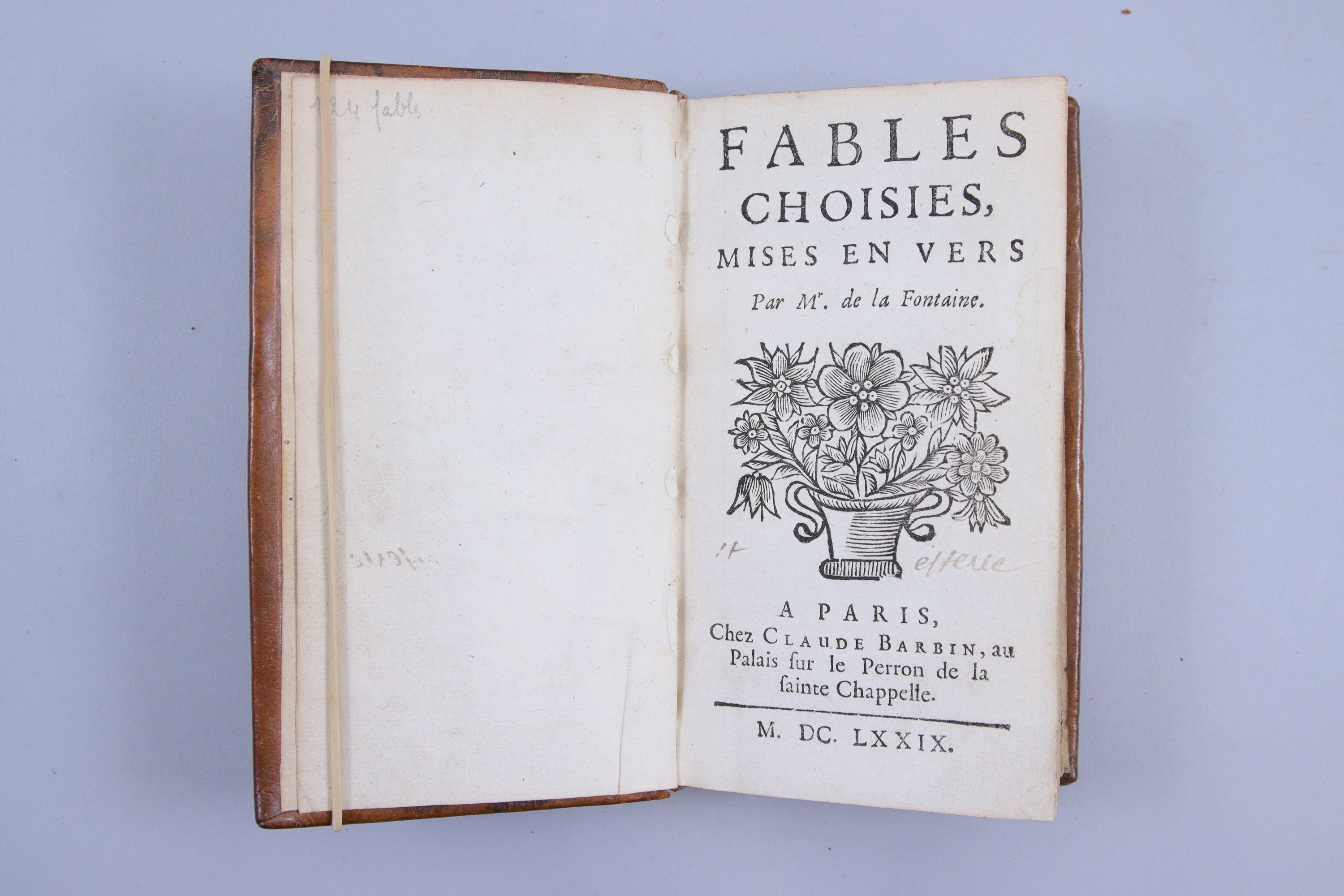Nous joignons, dans une reliure différente et émoussée du temps, les "Fables choisies mises en vers par Mr de La Fontaine, tome premier", Claude Barbin, 1682, avec la même collation que le volume de 1679. La coquille du titre courant de l'Epistre est corrigée, et le titre porte "tome premier". La "Table des Fables " est devenue "Table des Fables contenues en cette Première partie". Le bois "au panier fleuri" qui figure sur le titre en 1679, est remplacé sur le titre daté 1682 par un bouquet de tulipes et d'artichauts ; le bois "au panier fleuri" est placé à la fin de La Vie d'Esope.