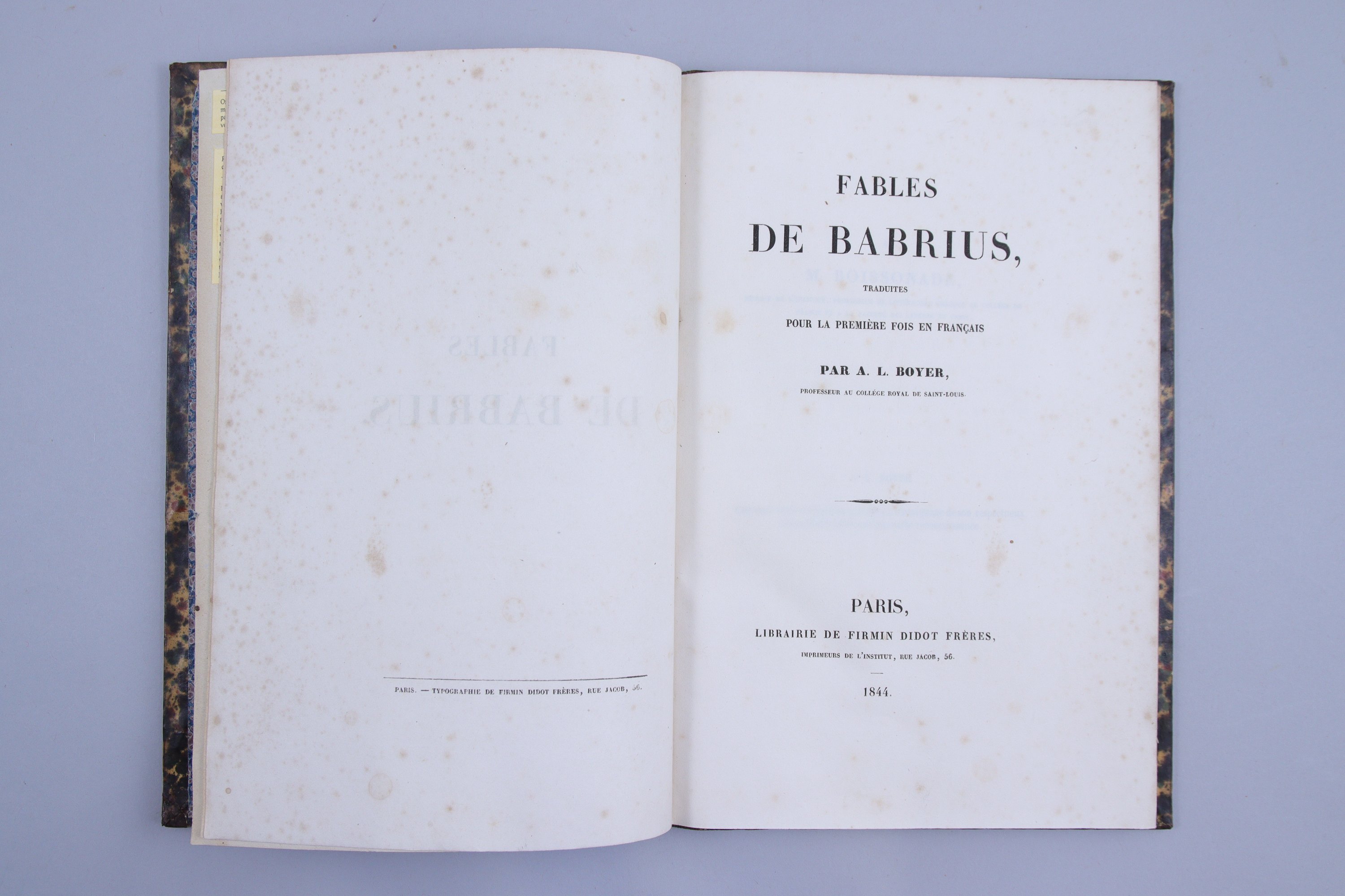 - Babrius : Fables traduites pour la première fois en français par A.L. Boyer. Paris, Firmin-Didot, 1844. Grand in-8, 1/2 veau du temps.