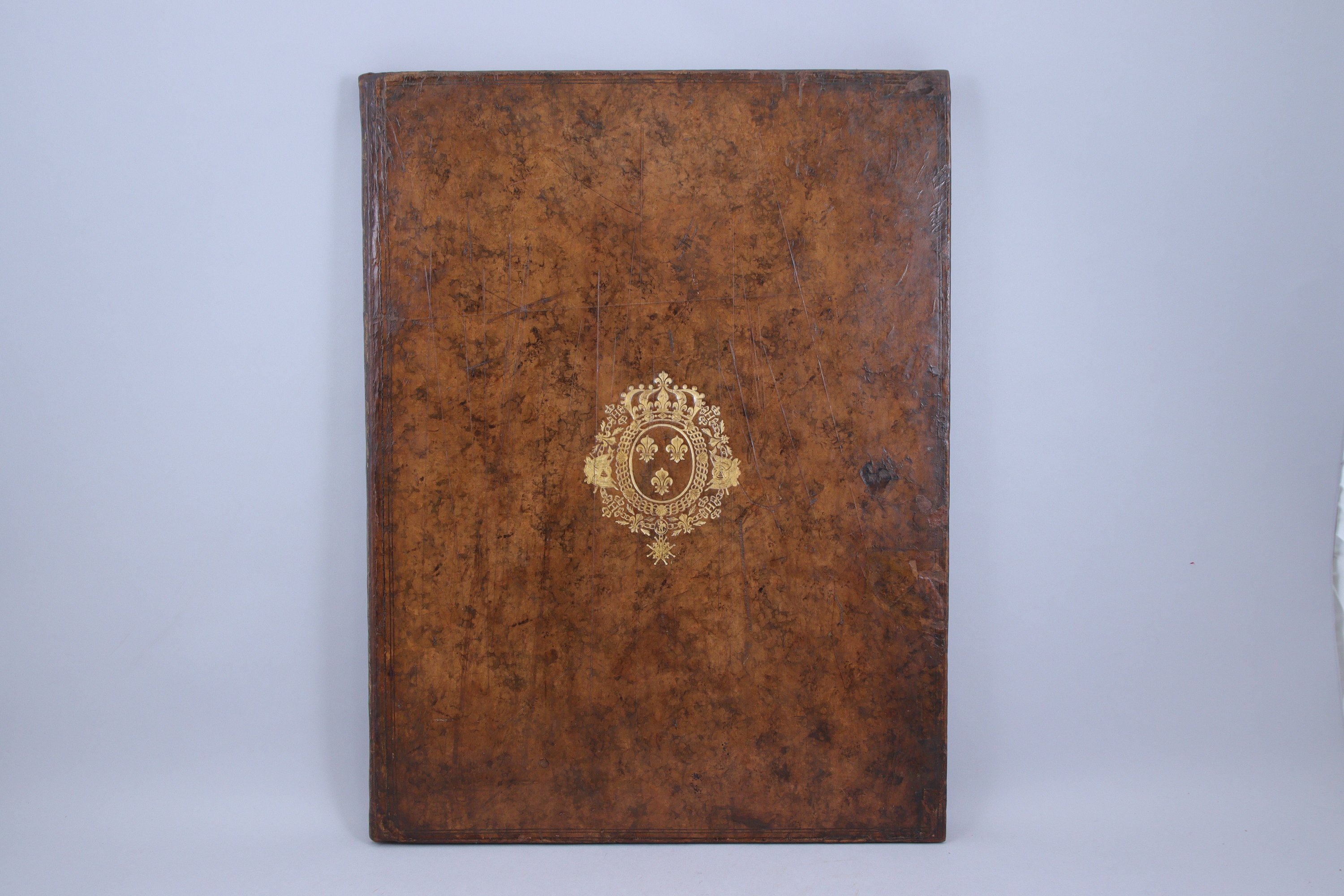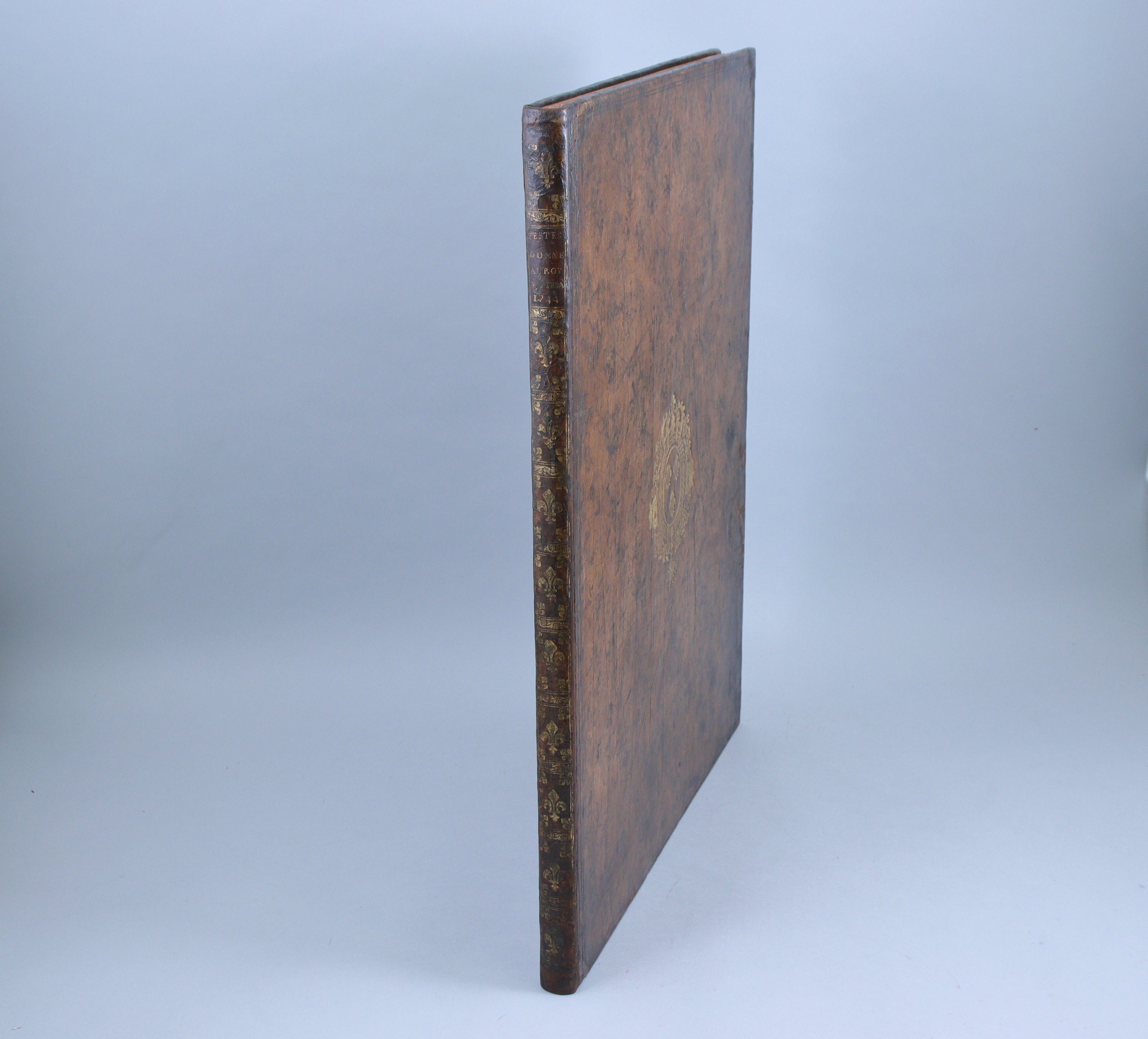 Grand in-folio; Dimensions intérieures : 622 X 476 mm. Plein veau raciné, triple flet d'encadrement à froid. Grandes armes royales au centre des plats. Dos sans nerf orné de fleurs de lys. Reliure du temps portant au bas du titre l'étiquette de "Padeloup, relieur du Roy, place Sorbonne à Paris".