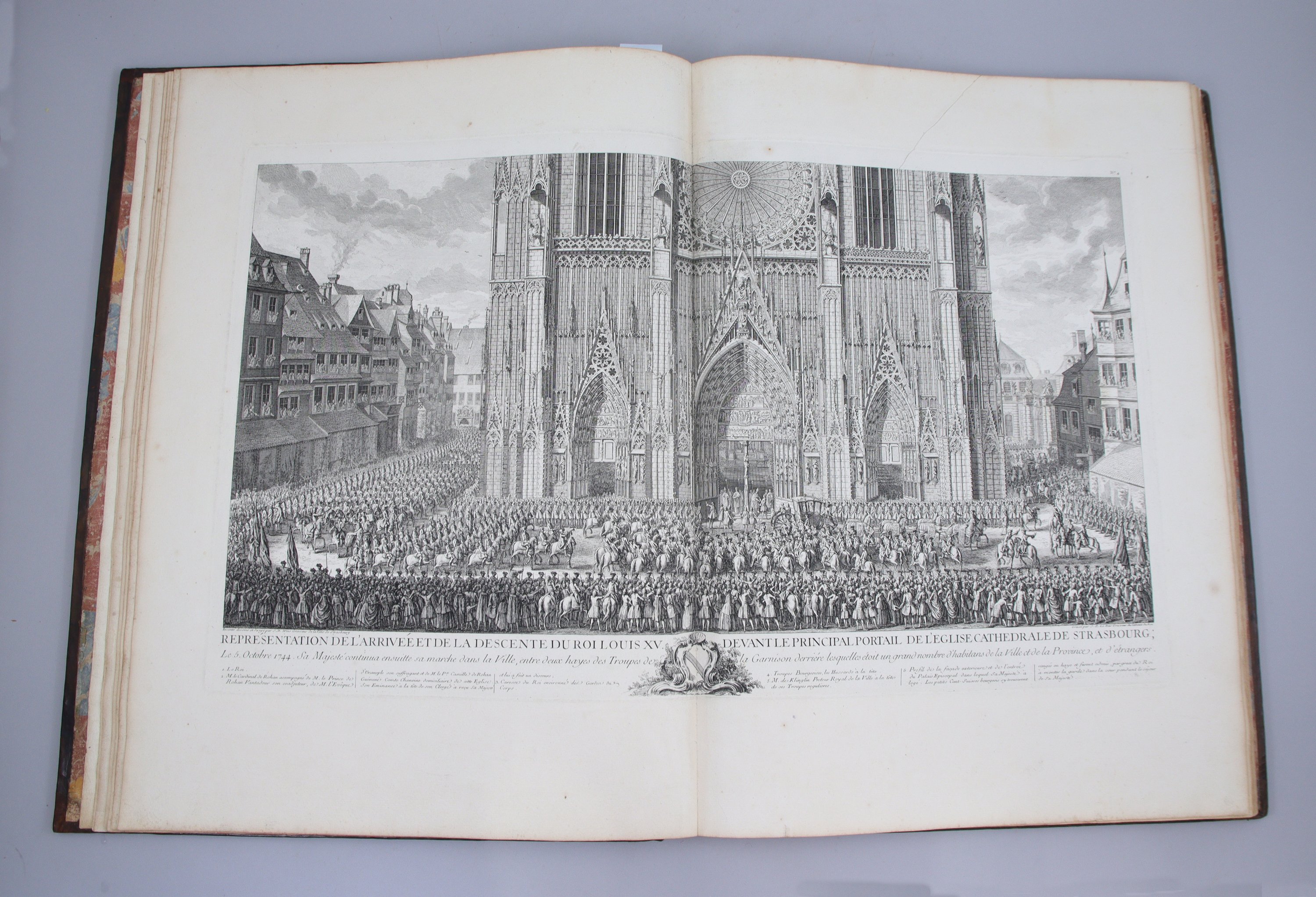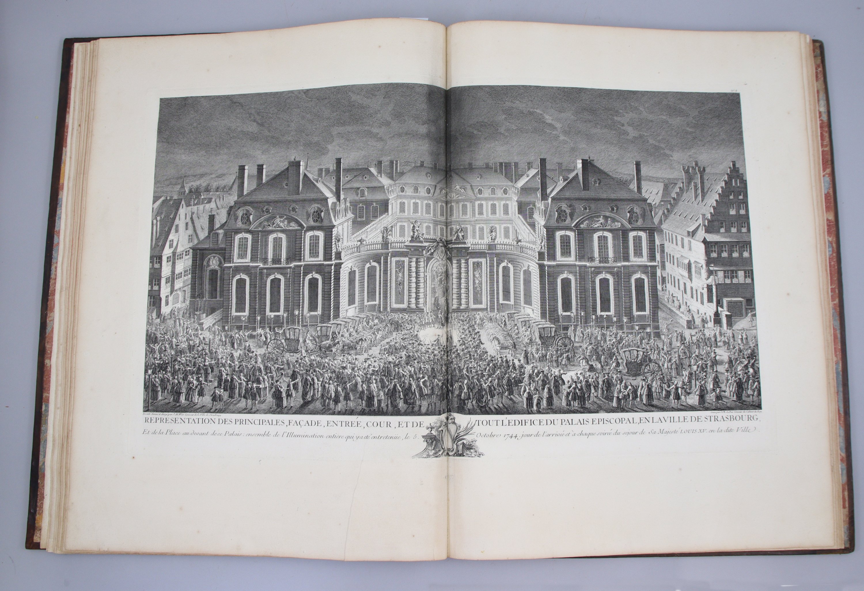 Encadrement du titre gravé par Marvy, et texte du titre gravé par Le Parmentier. 11 planches doubles dessinées par Weis et gravées par Le Bas (la 10ème est gravée par Weis) ; 20 pages de texte gravé, dans un riche encadrement de rinceaux peuplés de trophées et des armes de France et de Strasbourg, avec deux grandes vignettes, à mi-page, dessinées et gravées par Weis et Marvye