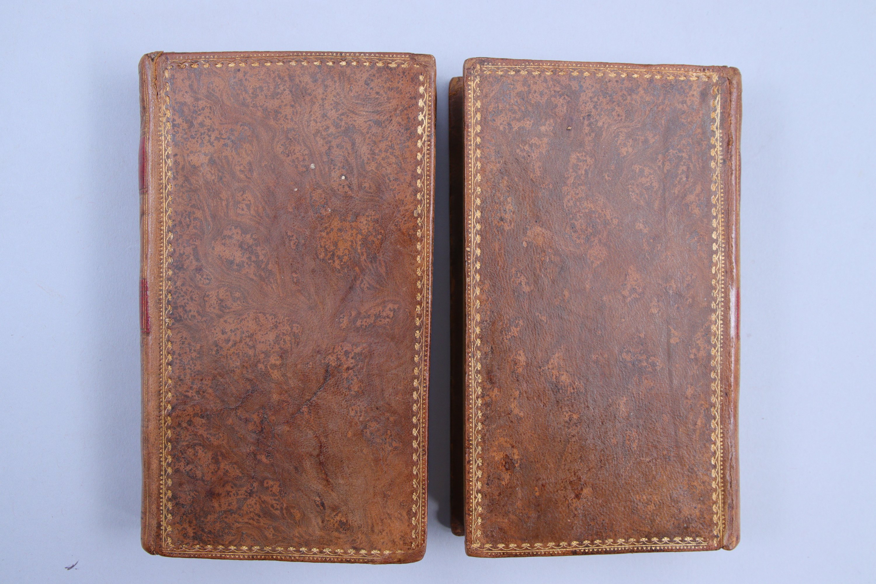 5 volumes in-12. Pleine basane flammée, encadrement d'un filet aux pointillés, d'un filet droit et d'une fine roulette à motif floral ; dos sans nerf, orné d'un fer réticulé et d'un fer à la grappe de raisins, pièces de titre et de tomaison de maroquin rouge.. Charmante reliure établie vers 1800. (Habile restauration à la coiffe supérieure des tomes I et V).