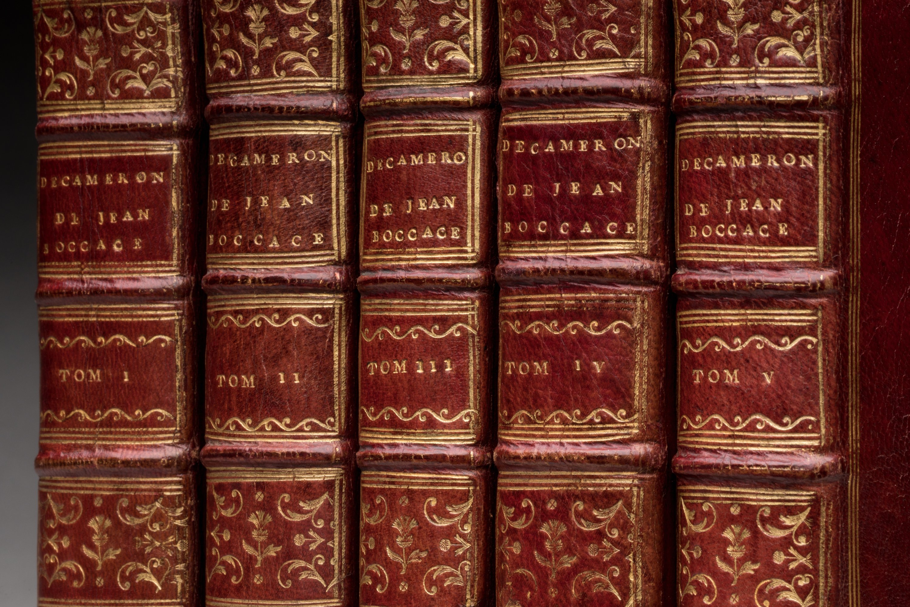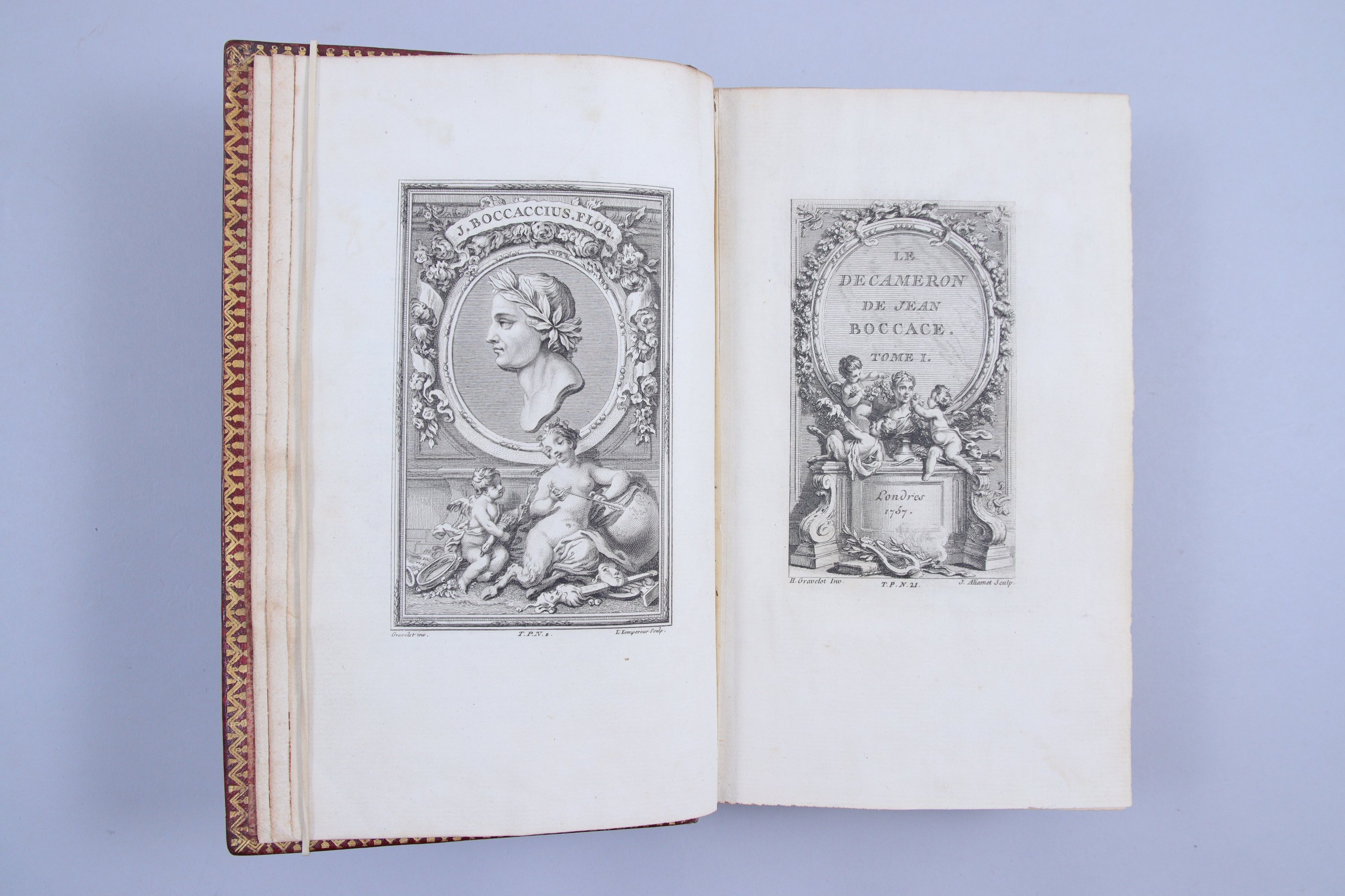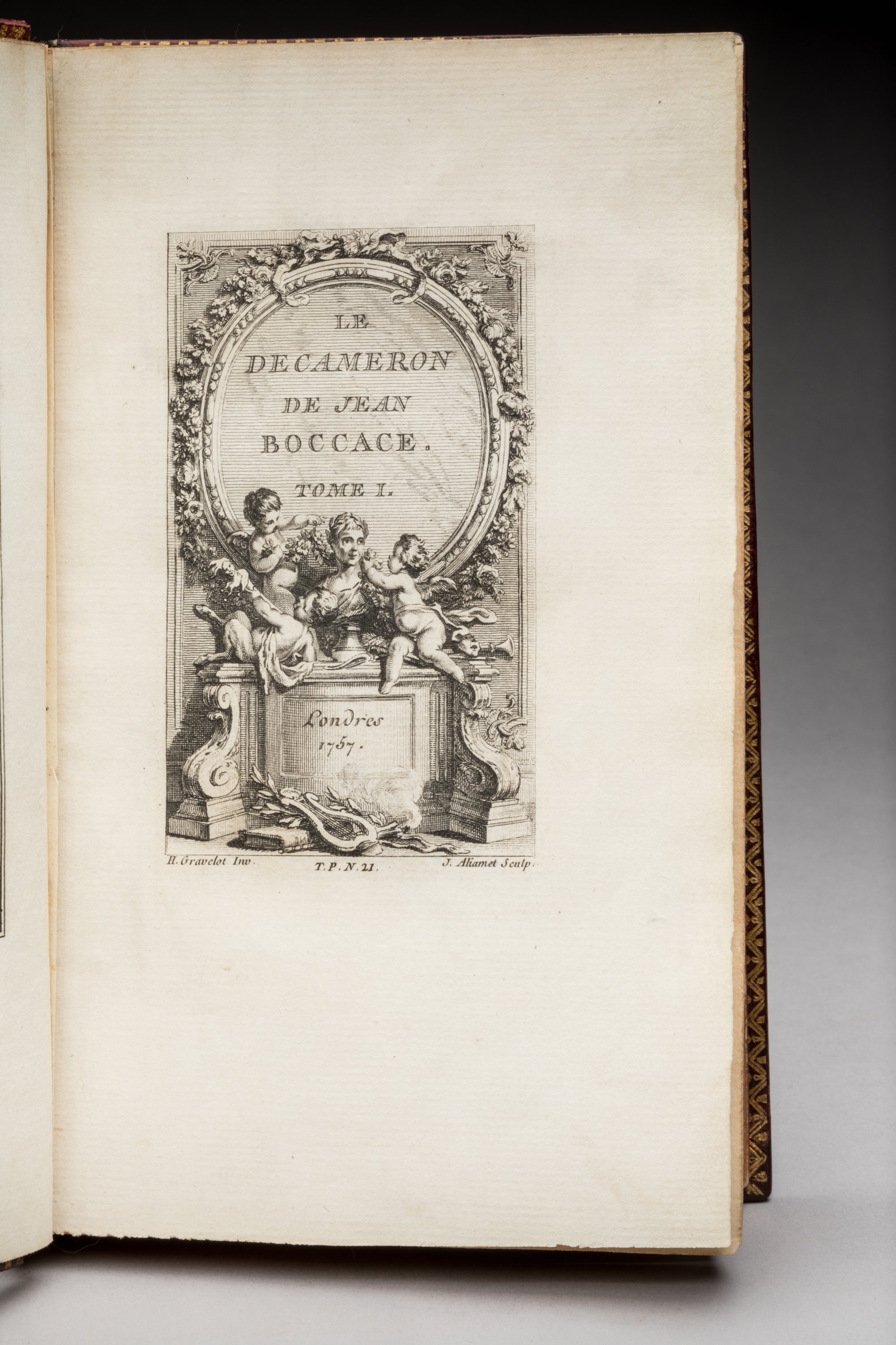 Très bel exemplaire, dans un élégant et sobre maroquin parfaitement établi. A grandes marges, imprimé sur vergé de Hollande, il est bien complet du portrait de Boccace, des 110 figures hors-texte et des 97 culs-de-lampe de Gravelot, Boucher, Cochin et Eisen.
