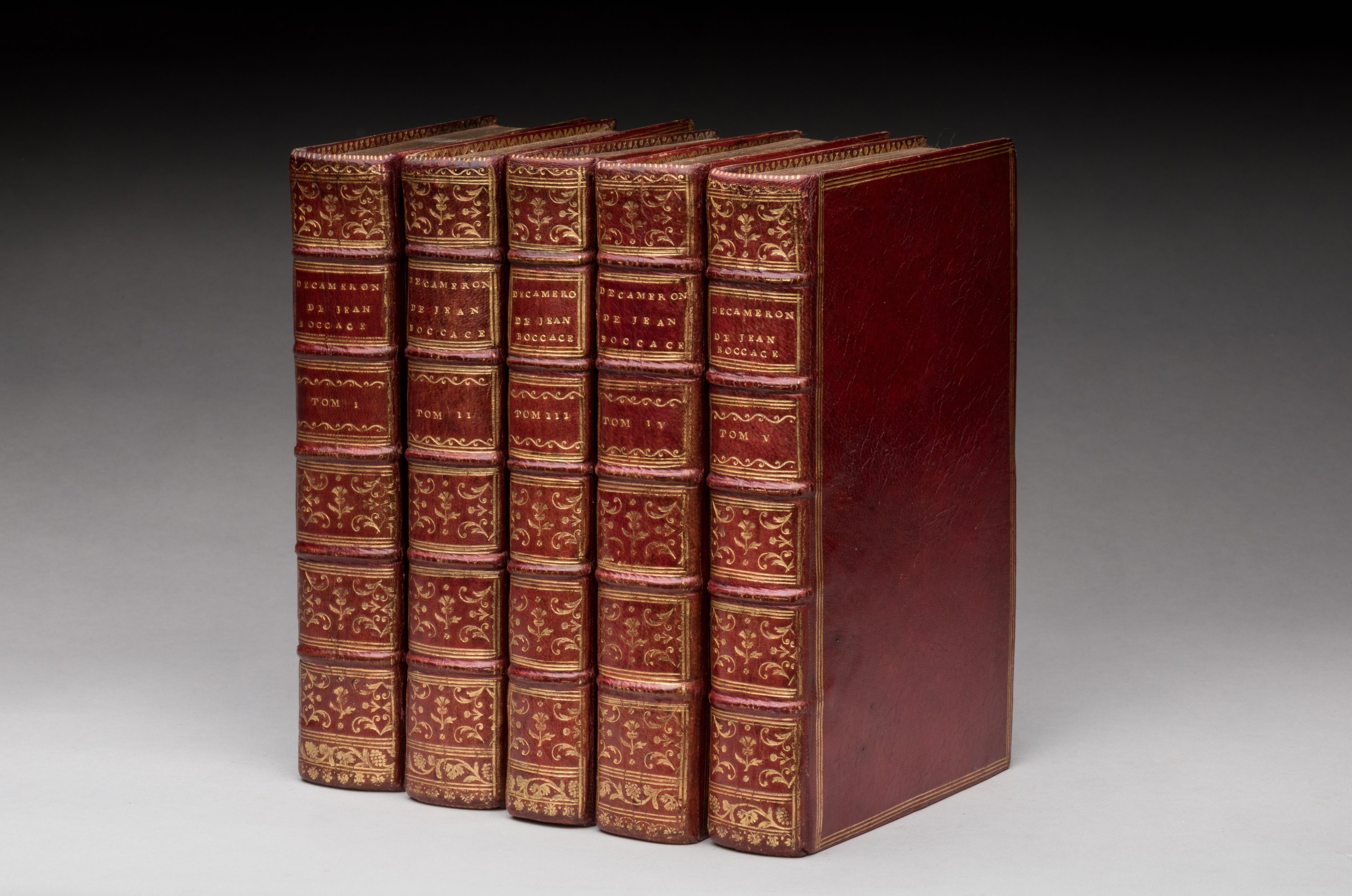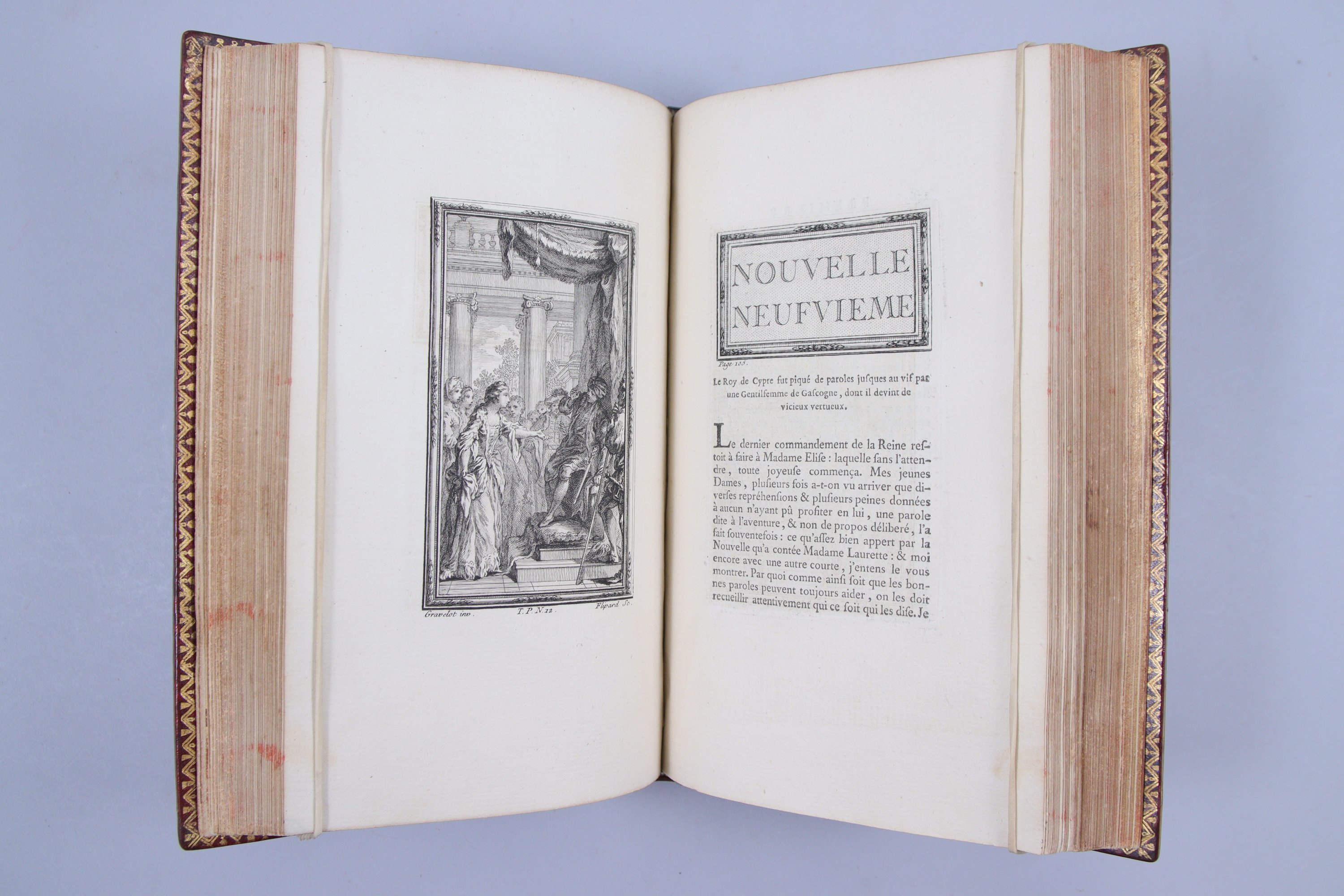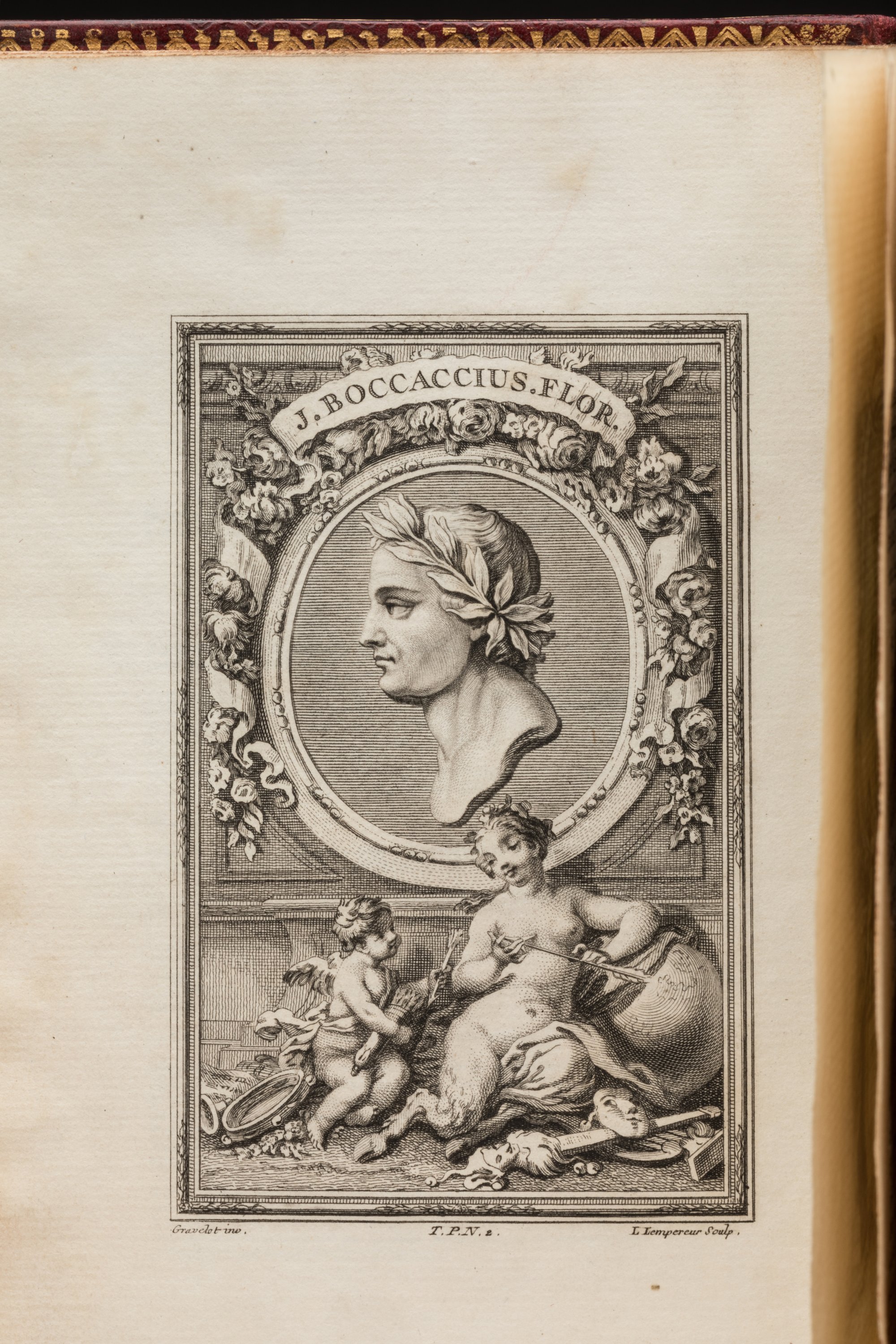 Très bel exemplaire, dans un élégant et sobre maroquin parfaitement établi. A grandes marges, imprimé sur vergé de Hollande, il est bien complet du portrait de Boccace, des 110 figures hors-texte et des 97 culs-de-lampe de Gravelot, Boucher, Cochin et Eisen.