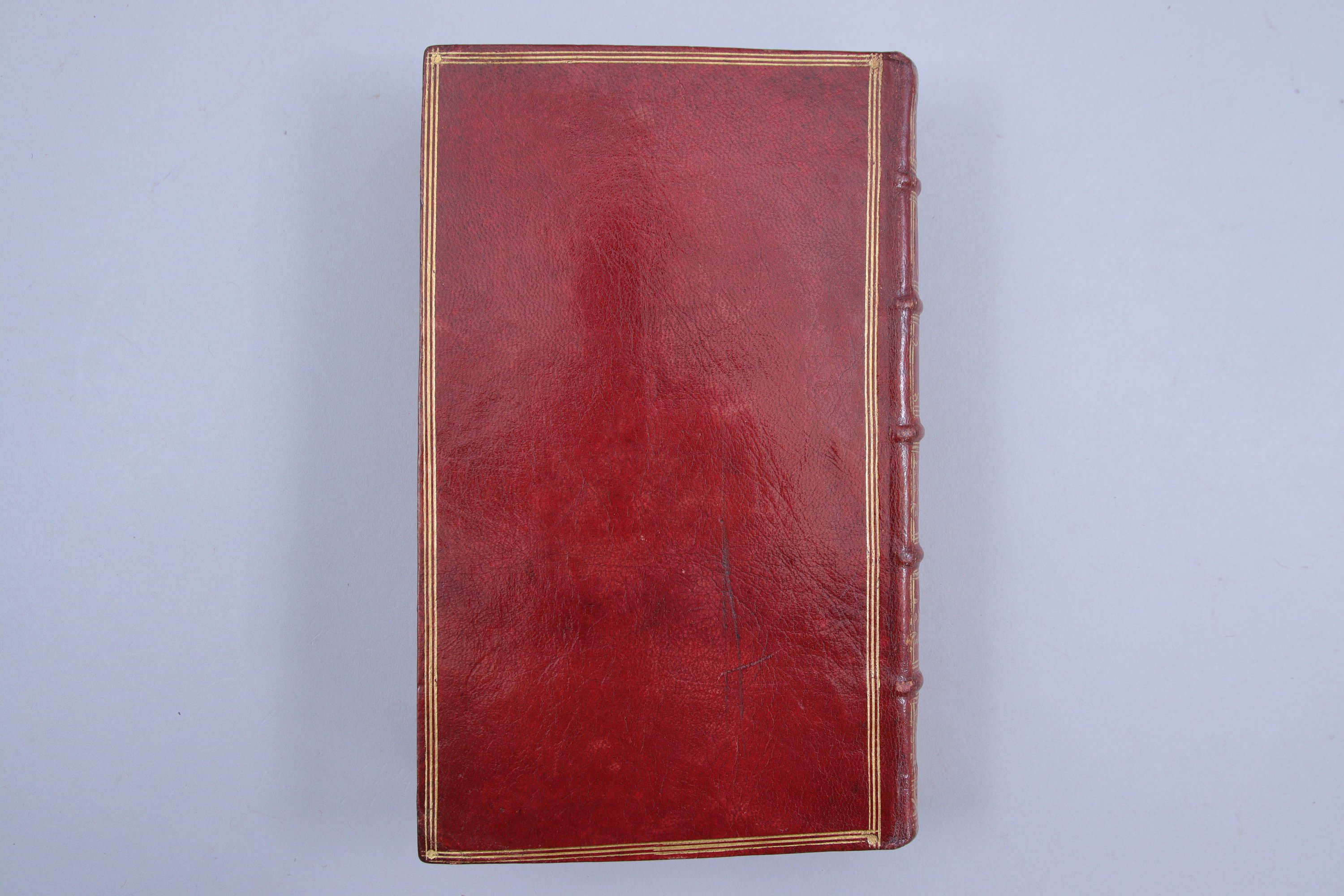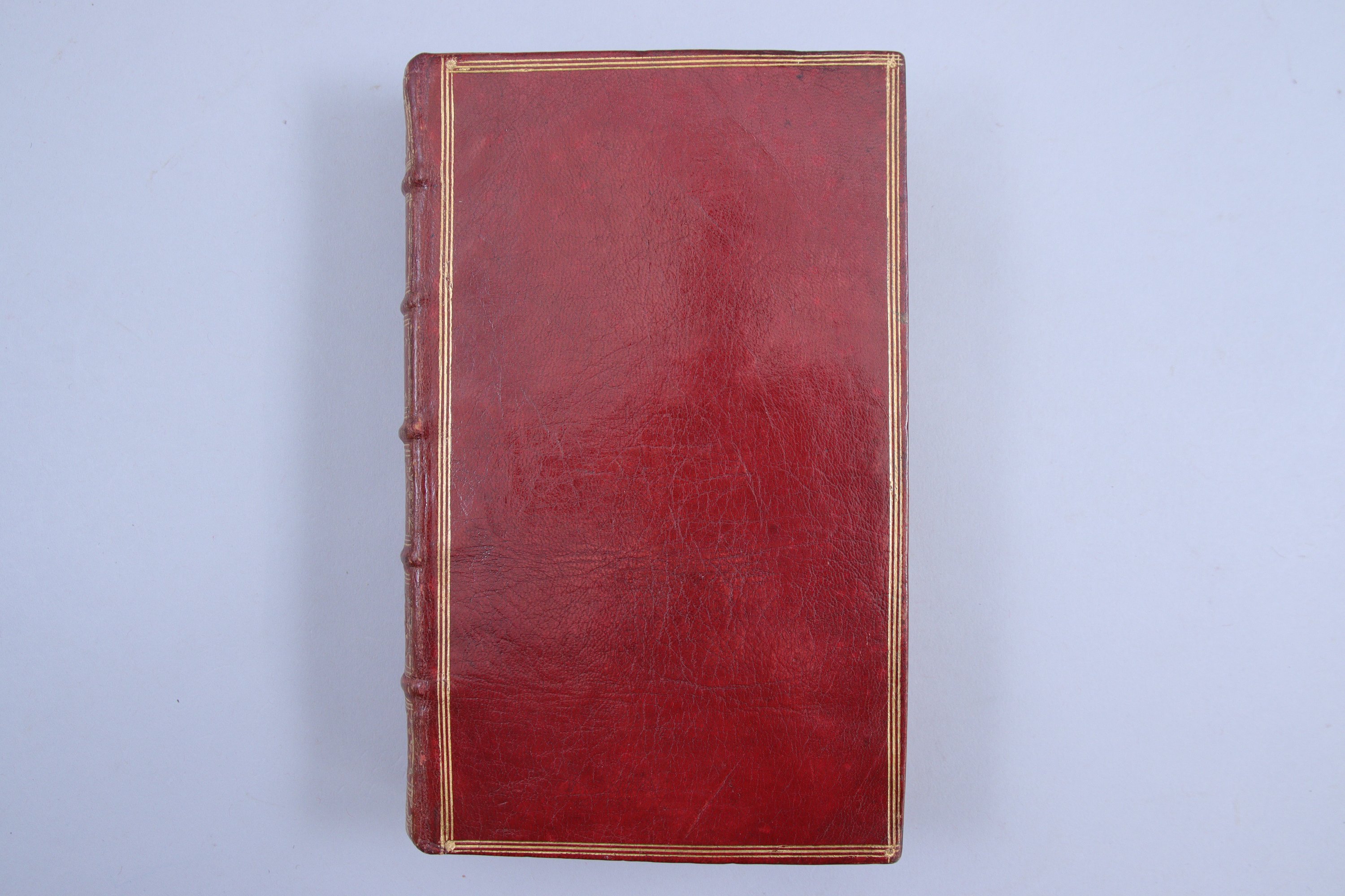 5 volumes in-8. Dimensions intérieures : 196 x 115 mm. Portrait, titre gravé, viij et 320 pp., 22 planches ; titre gravé, 292 pp., 22 planches ; titre gravé, 203 pp., 22 planches ; titre gravé, 280 pp., 22 planches ; titre gravé, 269 pp., 22 planches. Plein maroquin rouge, triple encadrement de filets dorés ; dos à 5 nerfs ; titre et tomaison frappés dans les caissons. Filet droit sur les coupes. Roulette intérieure. Toutes tranches dorées. Reliure du temps.