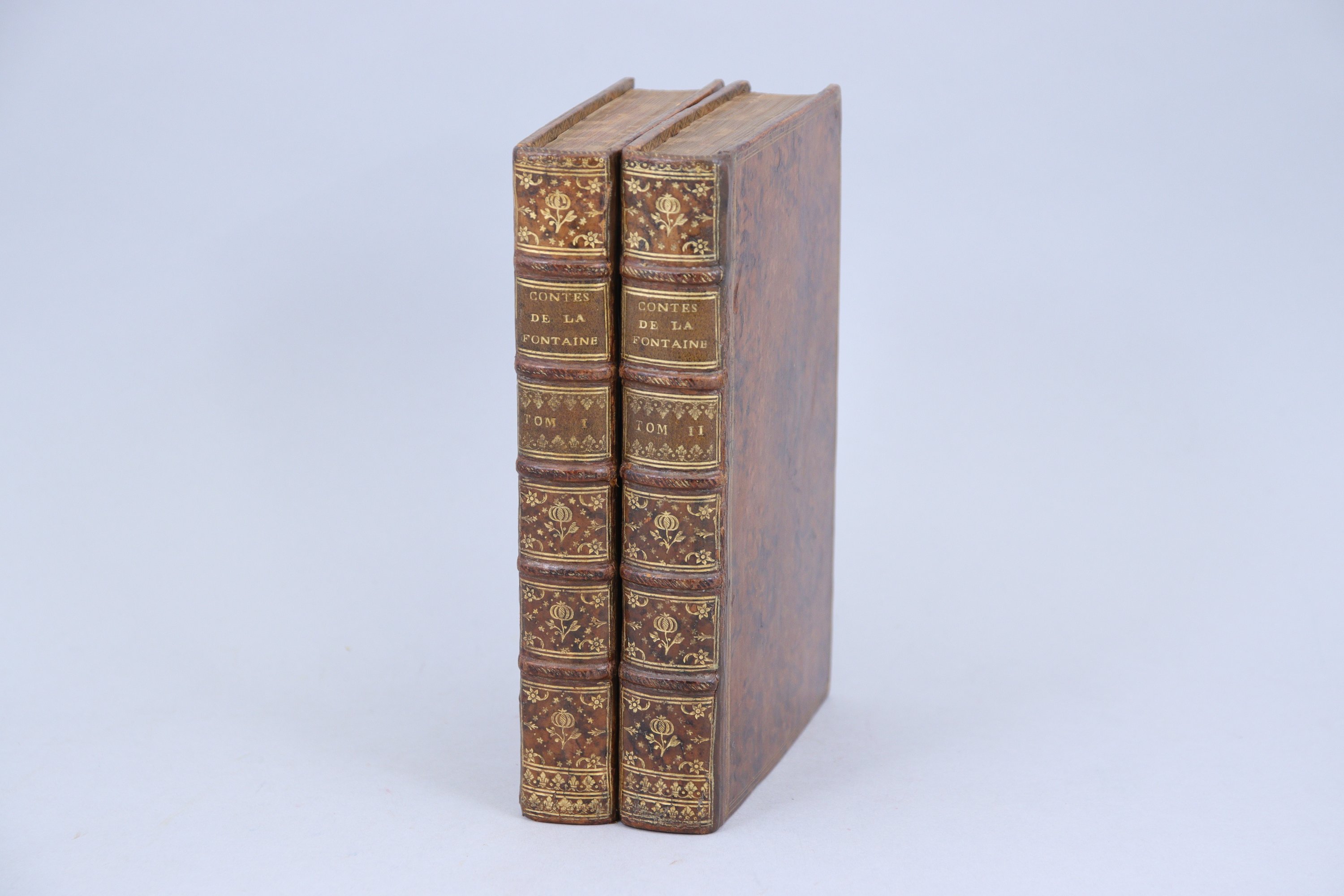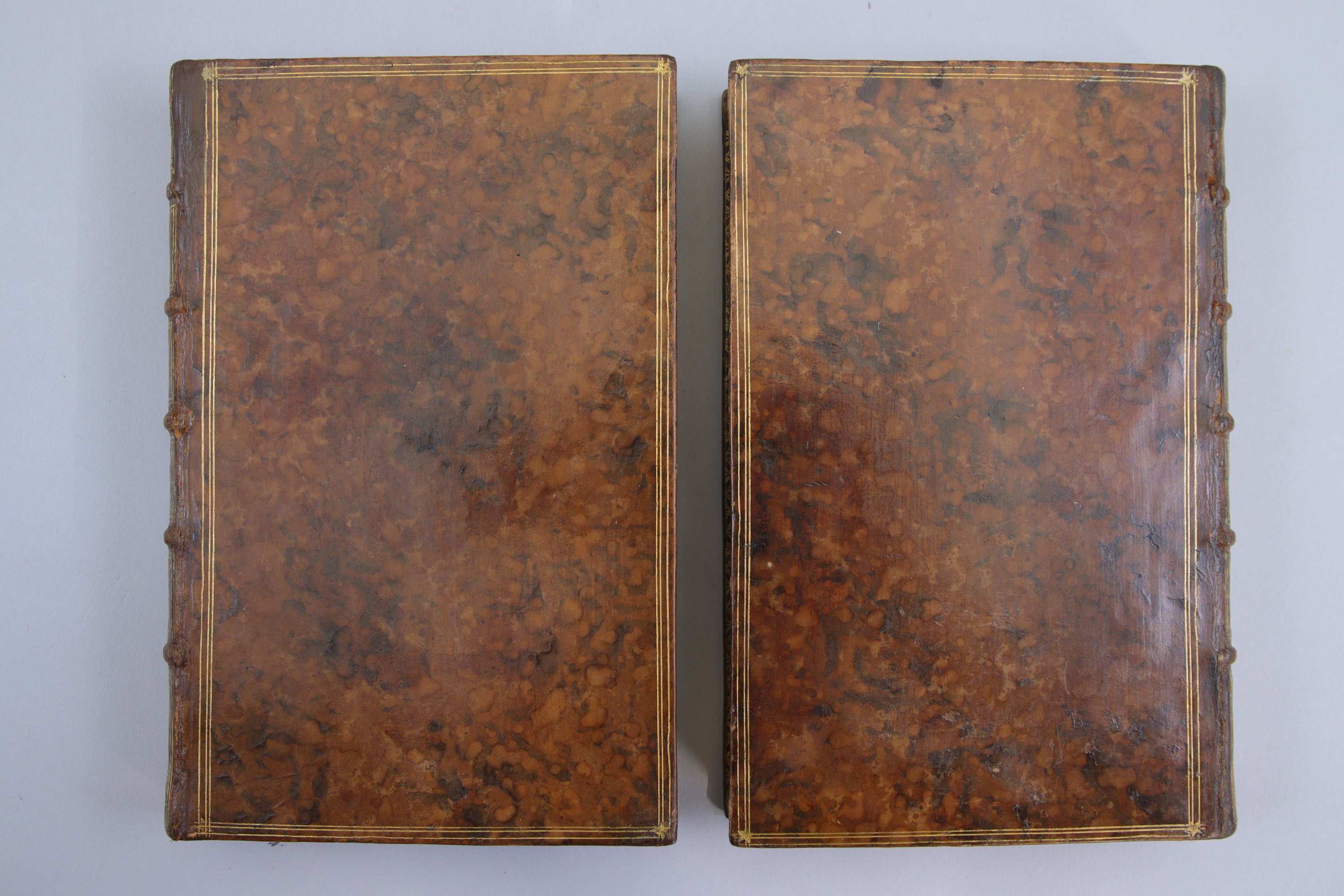 Plein veau raciné. Triple encadrement de filets droits. Dos à 5 nerfs soulignés d'un fer hachuré ; décor à la grenade dans les caissons ; filet sur les coupes ; roulettes intérieures. Toutes tranches dorées. Reliure du temps. (Habiles restaurations aux mors. Notes au crayon sur la première garde blanche. Rousseurs sur les faux-titres et les gardes blanches. )