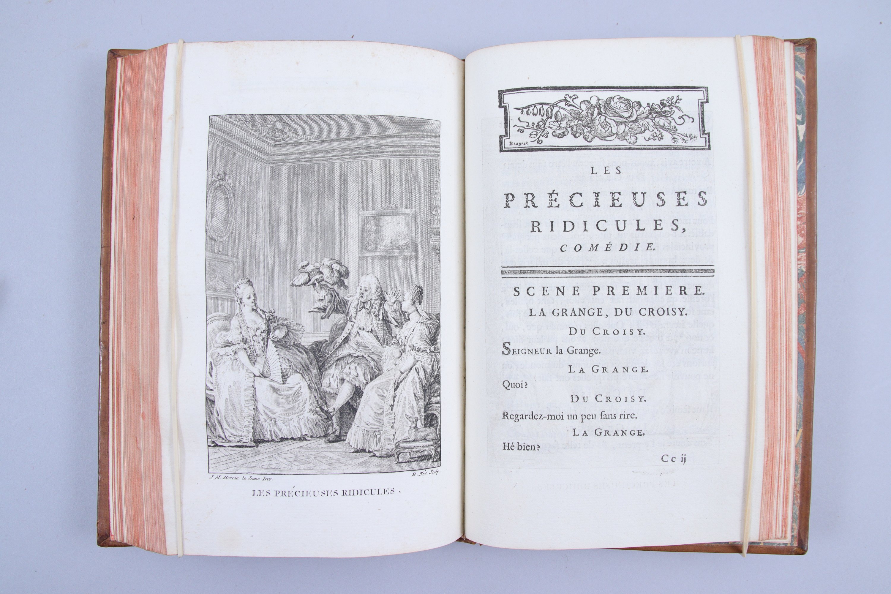 Bel exemplaire en premier tirage de cette célèbre édition, l'une des plus belles de Molière. Elle est illustrée d'un portrait de Molière par Mignard, gravé par Cathelin, de 6 fleurons de titre et de 33 figures de Moreau le Jeune, gravées par Moreau lui-même, ou par Bagnon, Delaunay, Duclos, de Ghendt, Masquelier, etc...