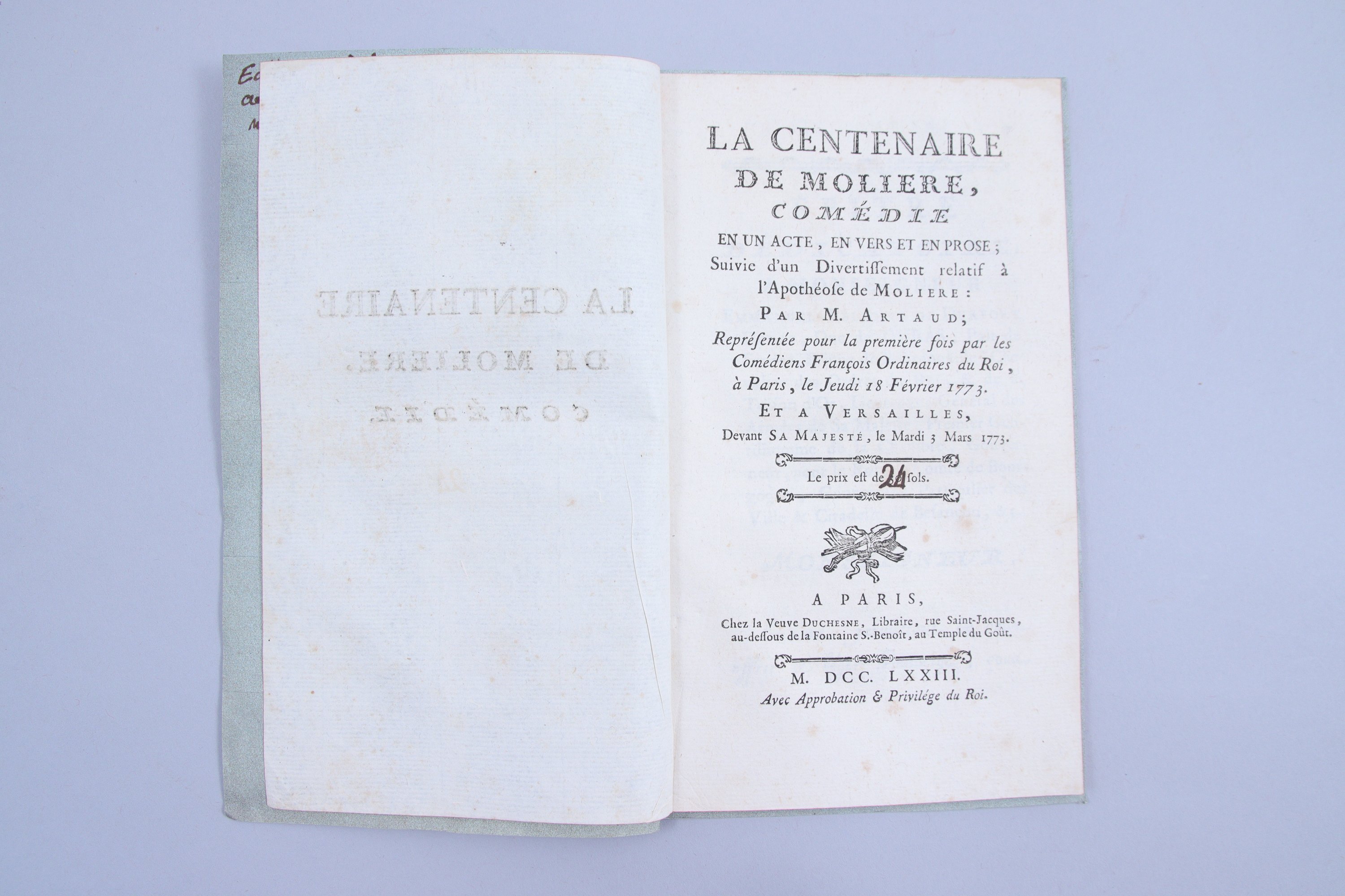 La centenaire de Molière. Comédie en un acte en vers et en prose, suivie d'un divertissement relatif à l'apothéose de Molière. Représentée pour la première fois par les Comédiens François Ordinaires du Roi, à Paris, le jeudi 28 février 1773 ; et à Versailles, devant Sa Majesté, e mardi 3 mars 1773.