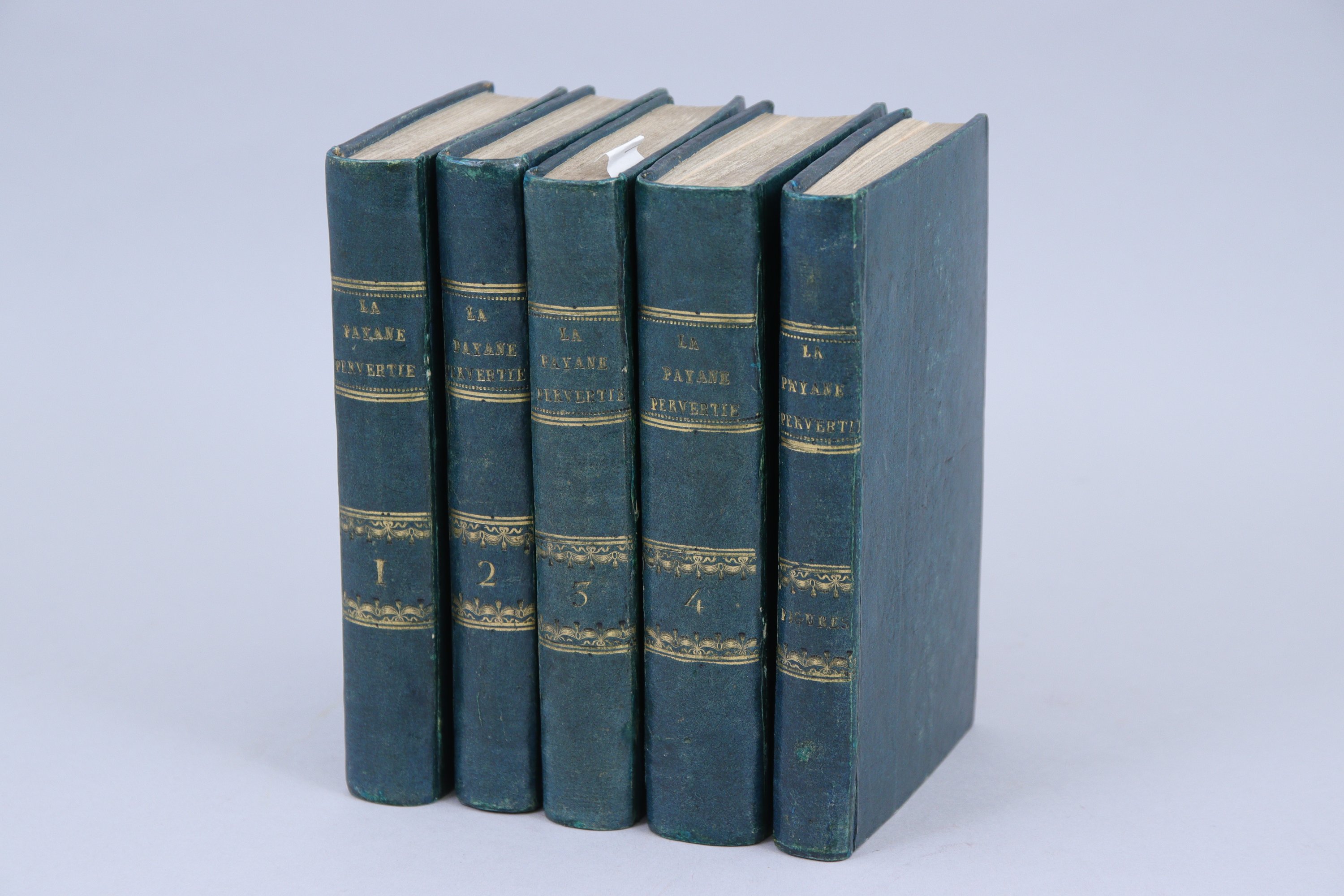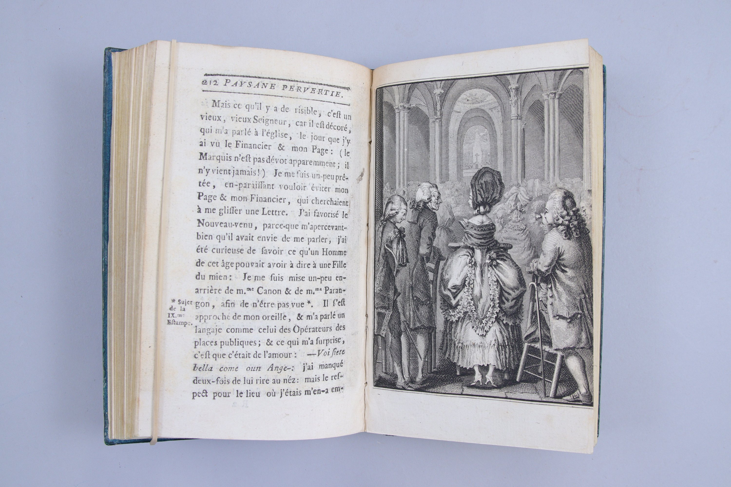 Bel exemplaire de l'édition originale de La Paysane Pervertie, bien complet des 38 figures de Binet (alors que seules 36 sont indiquée sur la table), dont les figures supplémentaires III bis et VIII bis, destinées à remplacer les figures III et VIII, jugées trop libres, et bien présentes dans l’exemplaire. Deux feuillets, numérotés XV à XVIII, expliquant ces deux nouvelles figures, sont intercalés entre la page VI et la page VII des figures de la Paysane pervertie.