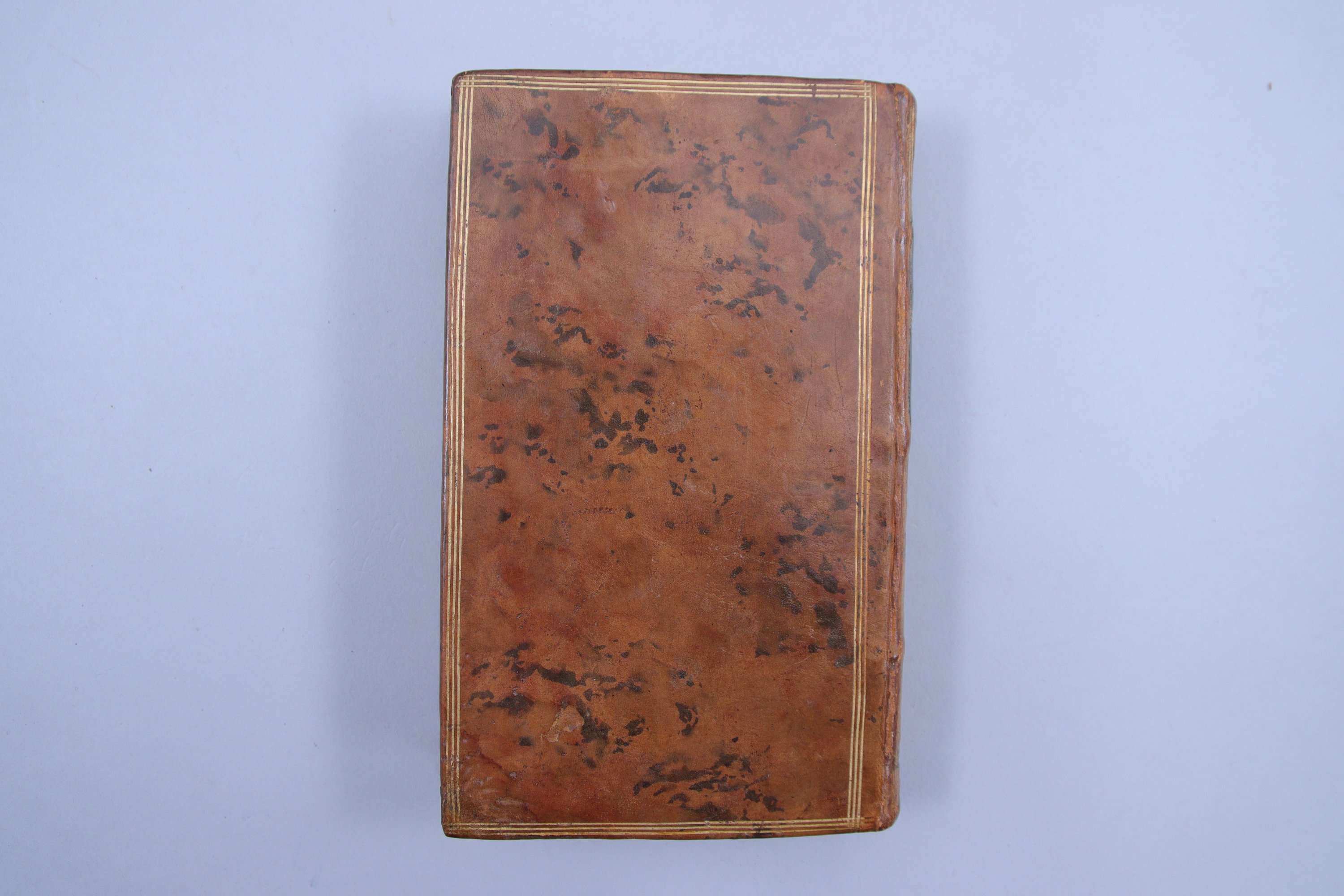 4 tomes en 2 vol. in-12 (dimensions intérieures 170 X 95 mm). Frontispice, 5 pp, (1 f), 144 pp ; (titre), 196 pp ; titre, 158 pp ; titre, 157 pp. et (2 ff) de table. Plein veau raciné, triple encadrement de filets droits, pièces de titre et de tomaison de maroquin vert. Toutes tranches dorées.