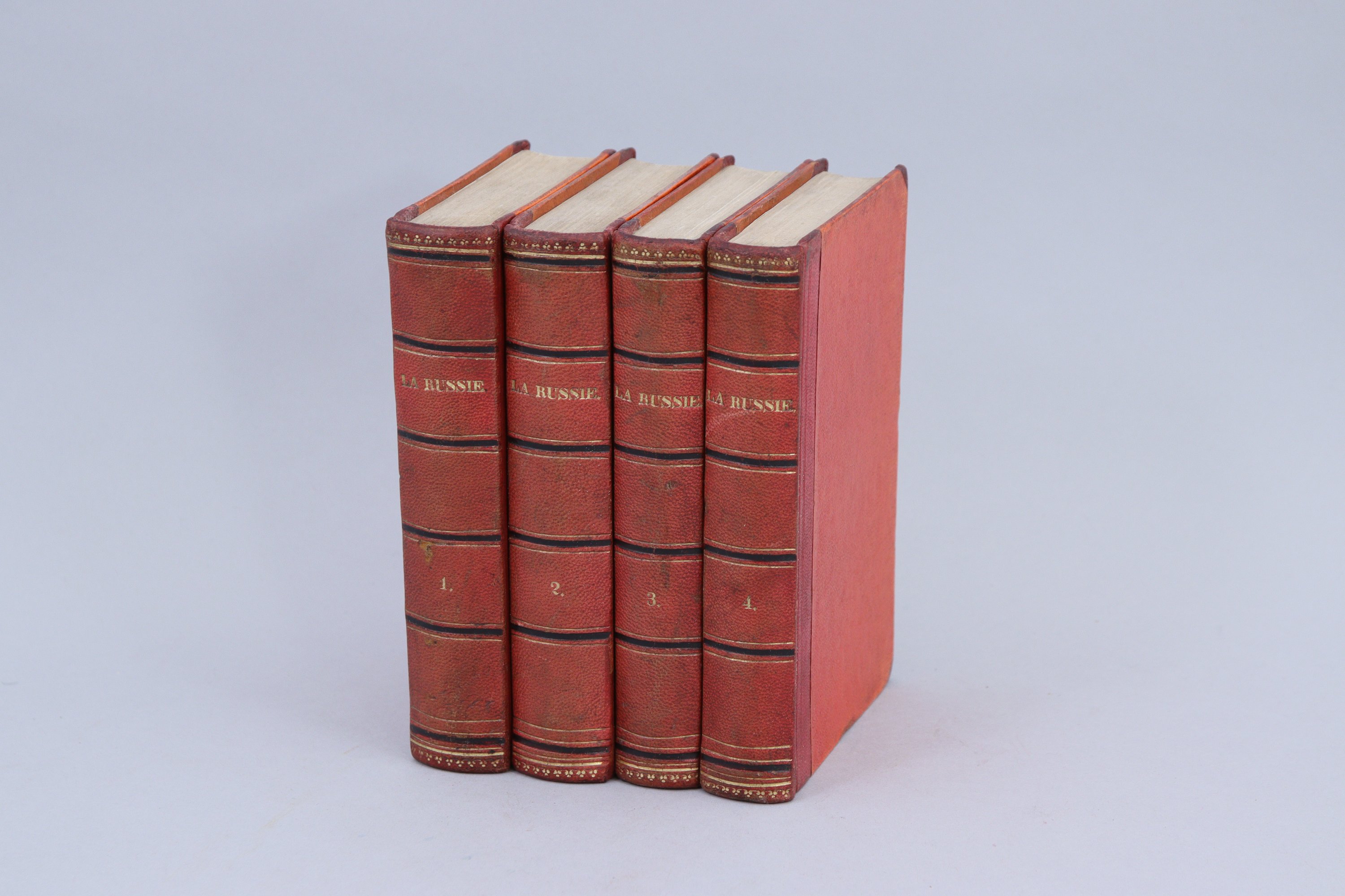 4 vol. in-16, 1/2 basane maroquinée rouge. Reliure du temps. 411, 398, 357 et 372 pages. (Tache d'encre rouge dans la marge de tête des pages 26 à 42 du tome IV.)