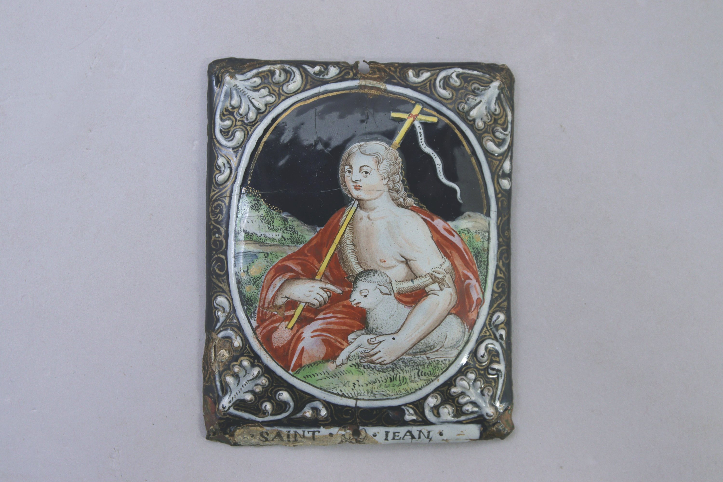 avec rehauts dor représentant dans un médaillon Saint Jean-Baptiste accompagné dun agneau ; rinceaux rocailles dans les écoinçons ; inscription à la partie inférieure SAINT IEAN. Contre-émail violacé.