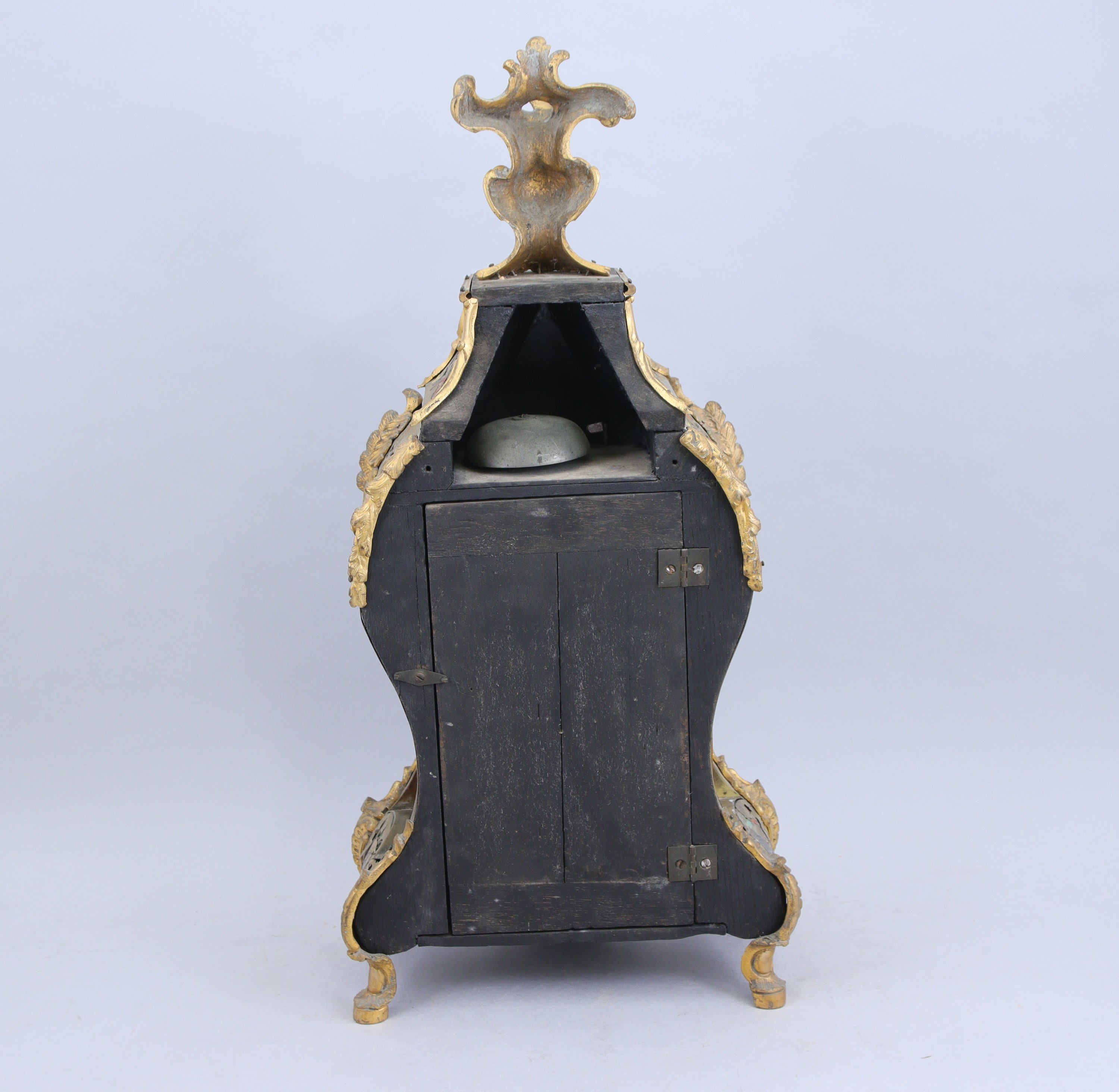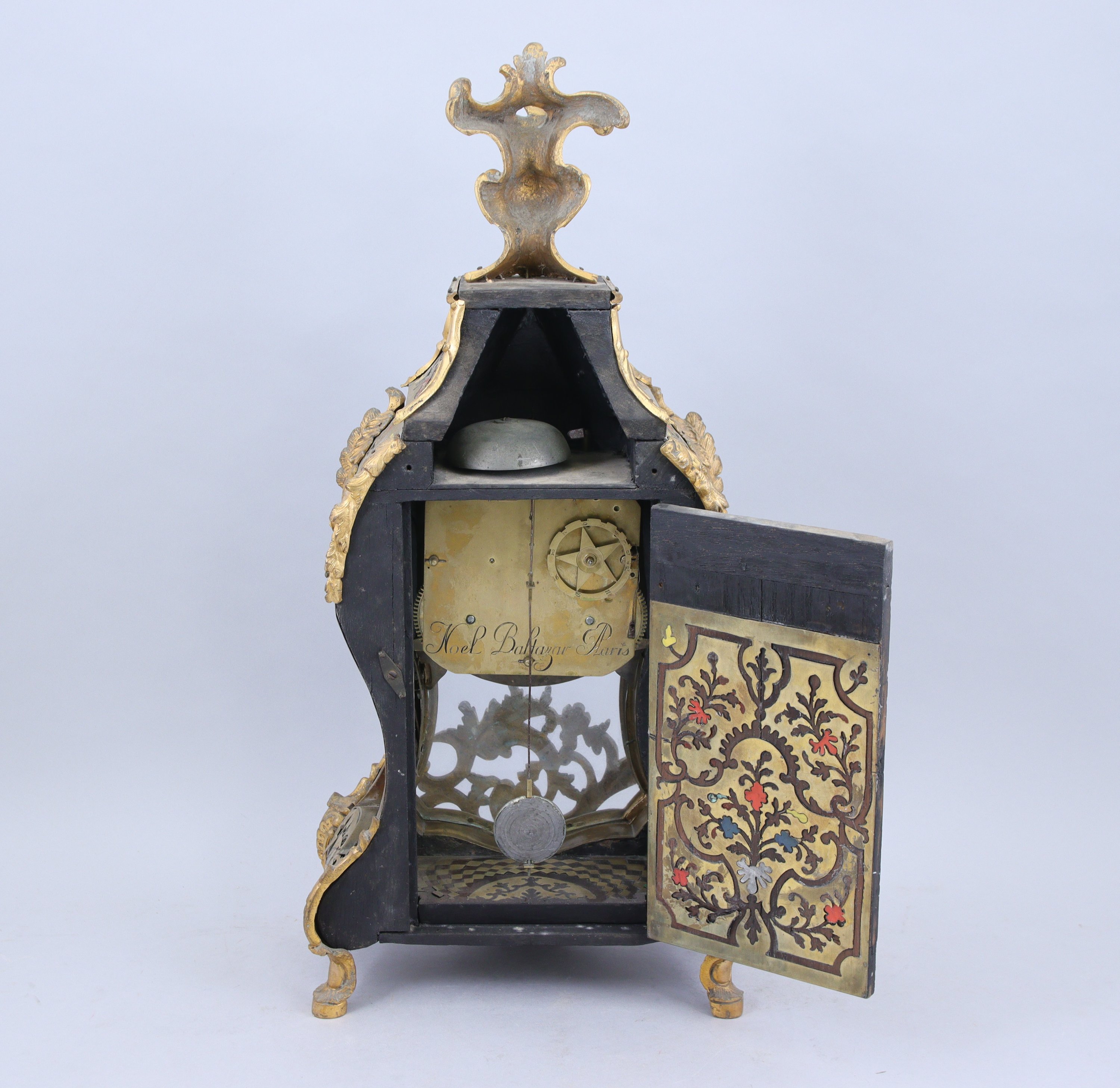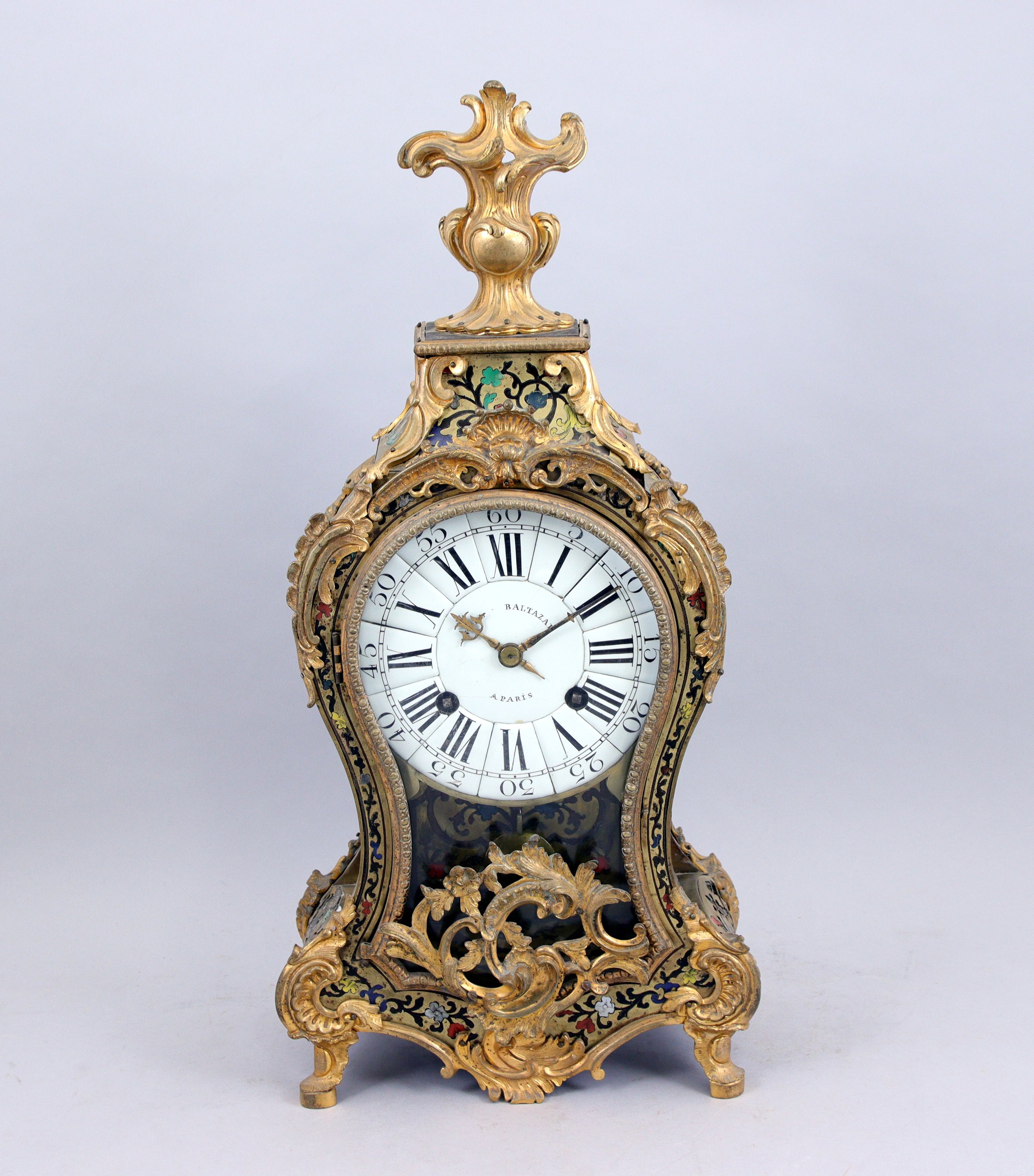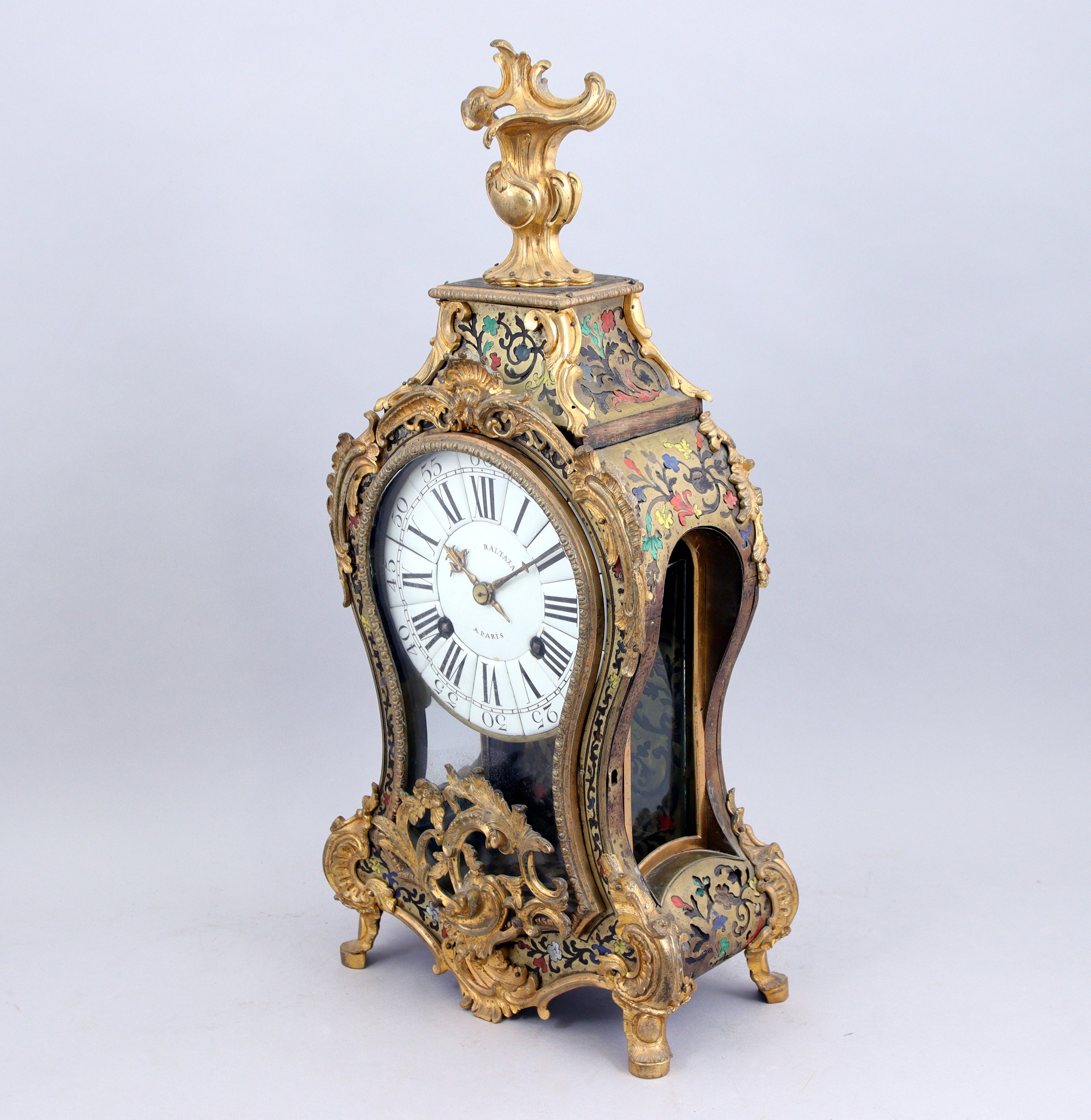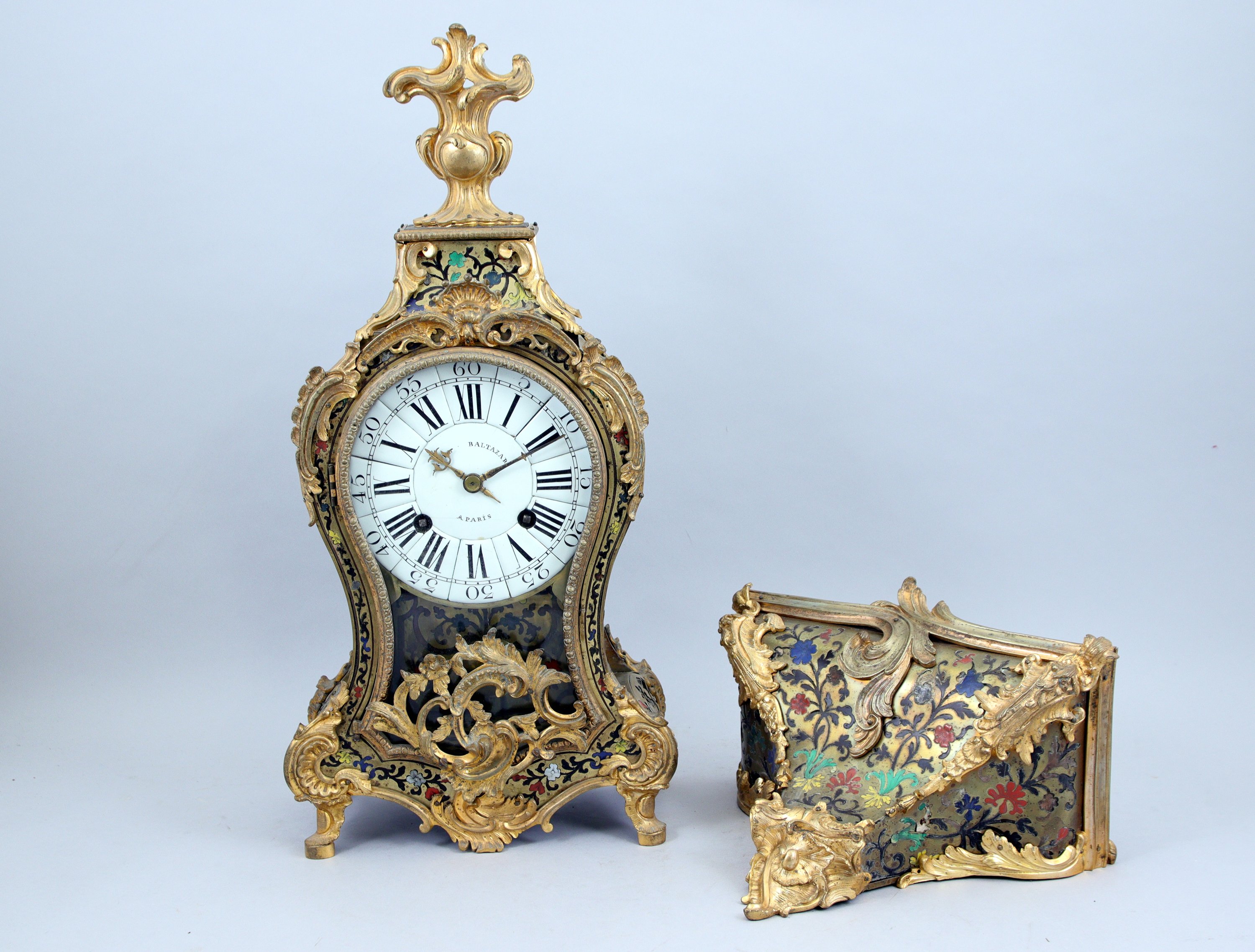 de forme violonnée en marqueterie "Boulle" de laiton, écaille, corne polychrome gravée de fleurs et branchages et riche ornementation de bronze doré. Le cadran émaillé blanc indique les heures en chiffres romains, les minutes en chiffres arabes. Le cartel est coiffée d'une flamme végétale, l'entourage du cadran à décor de motifs végétaux et de coquilles.
