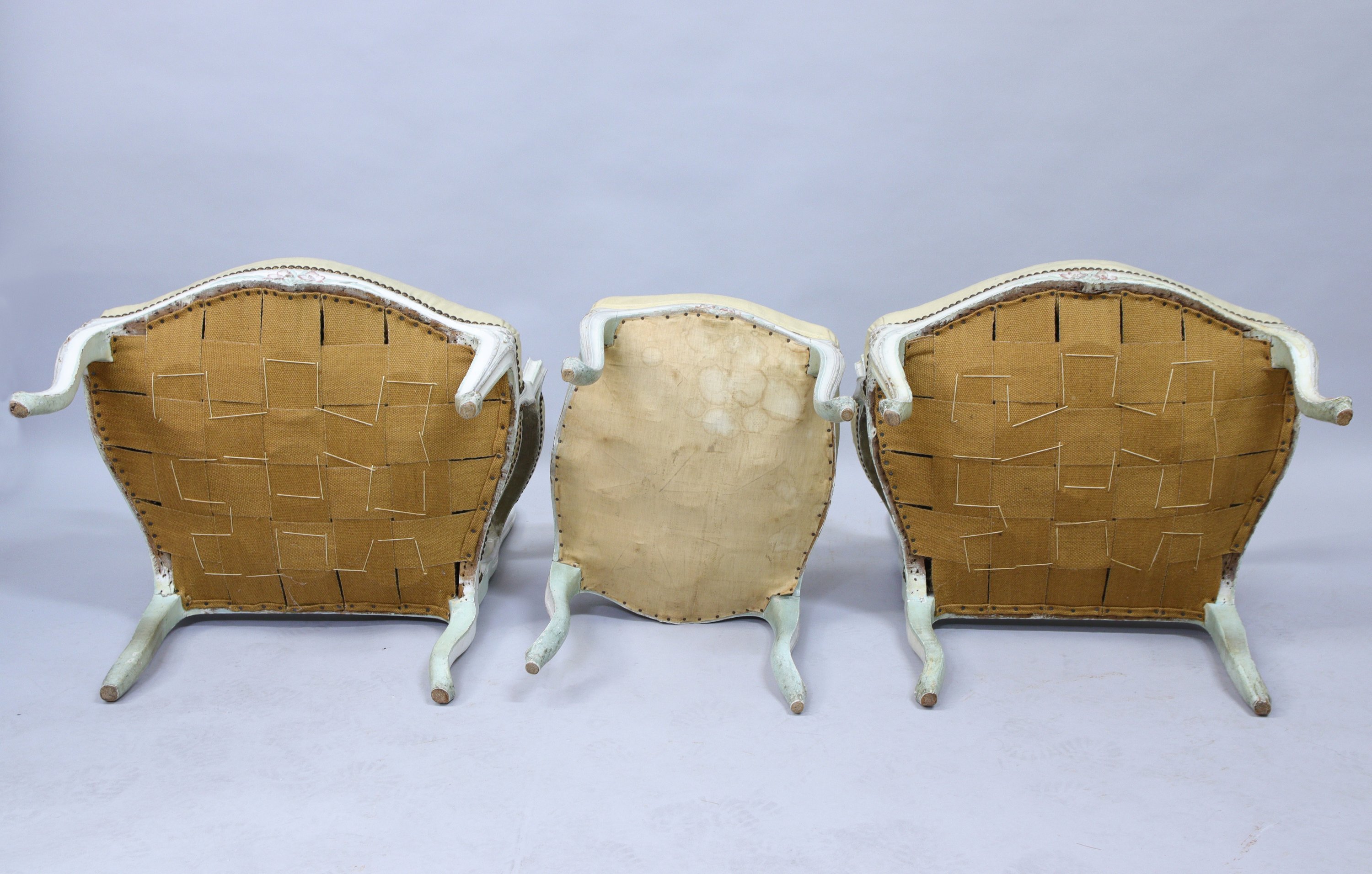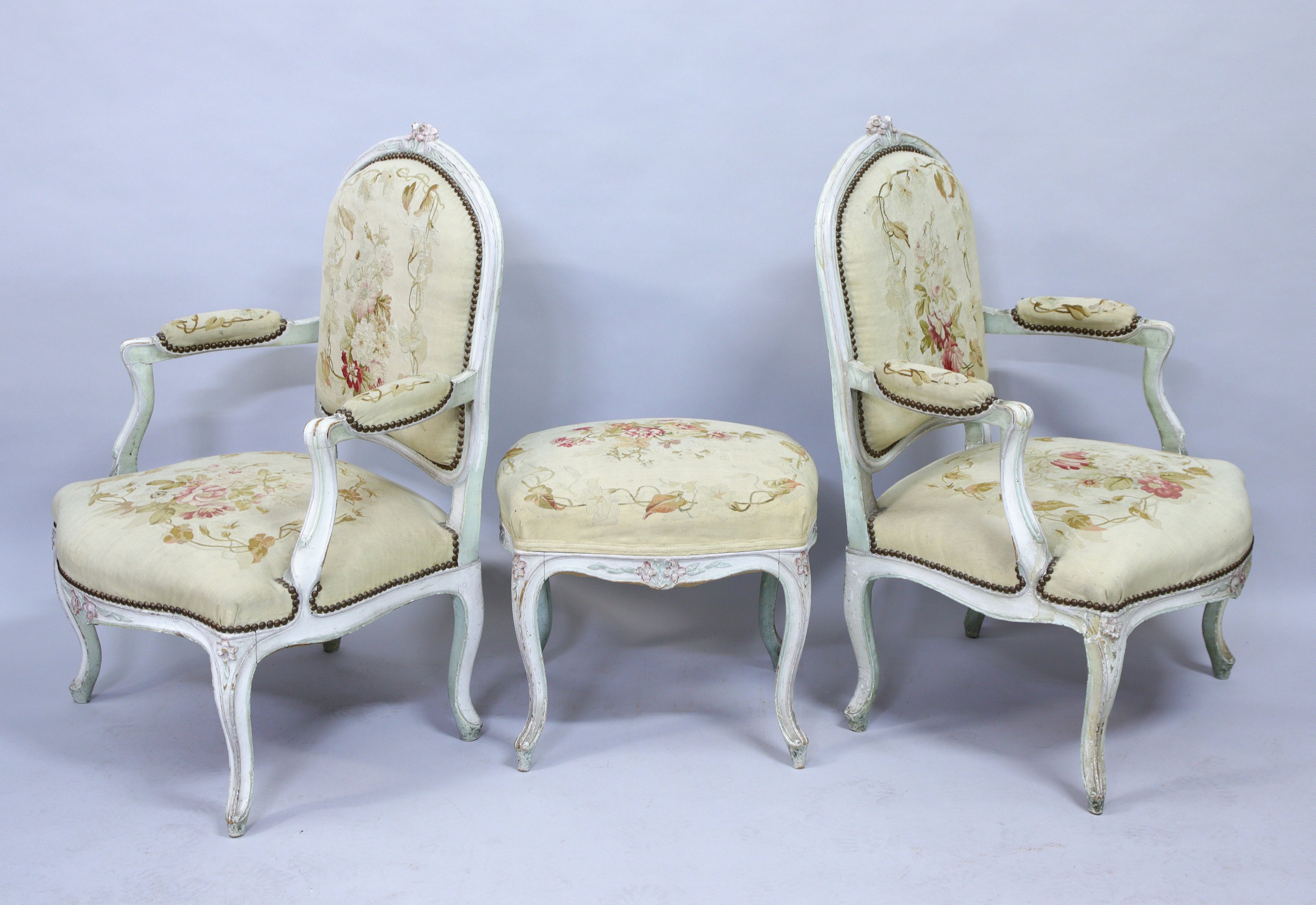 en hêtre mouluré, sculpté et laqué polychrome. L'amortissement et la ceinture à décor de fleurettes épanouies, les accotoirs à manchettes. Ils reposent sur quatre pieds cambrés.