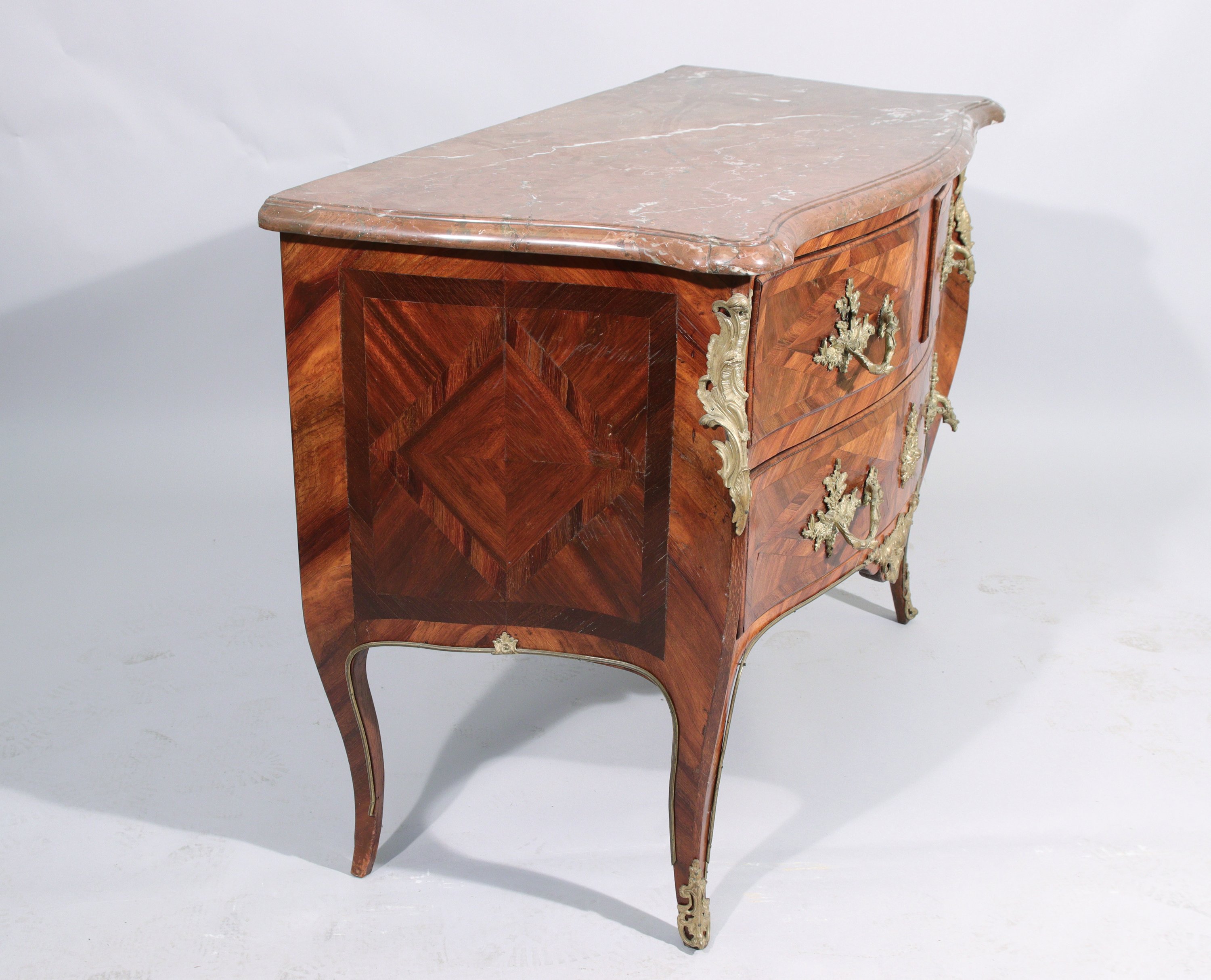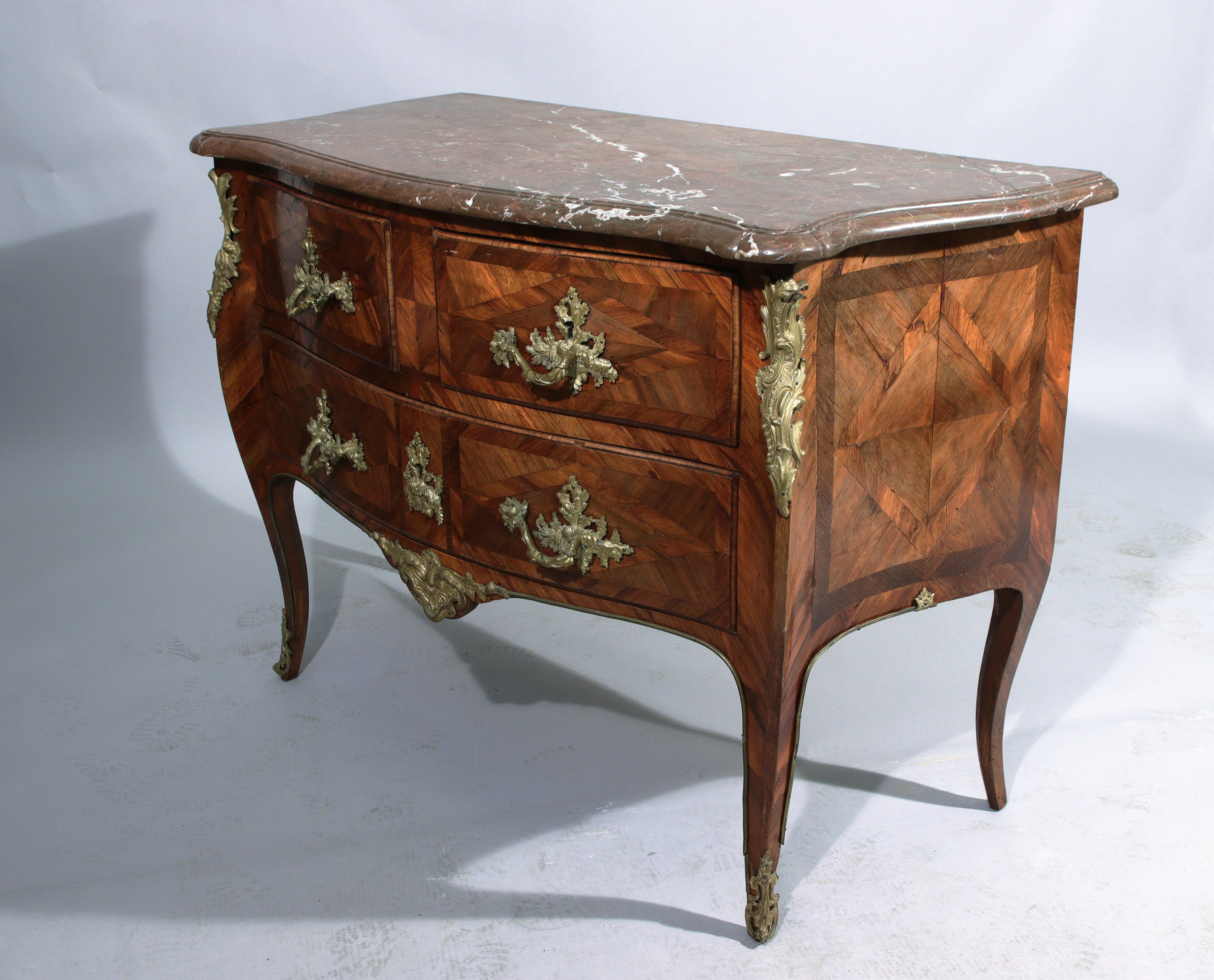 en marqueterie de bois de violette, la façade galbée ouvrant par trois tiroirs sur deux rangs décorés d'une marqueterie de losange. Les montants galbés se prolongent par quatre pieds courbés. Riche ornementation de bronze doré comme poignées de tirage fixes décorées de feuilles et prise en forme de tronc d'arbre simulé, chutes d'angle, sabots et tablier.
