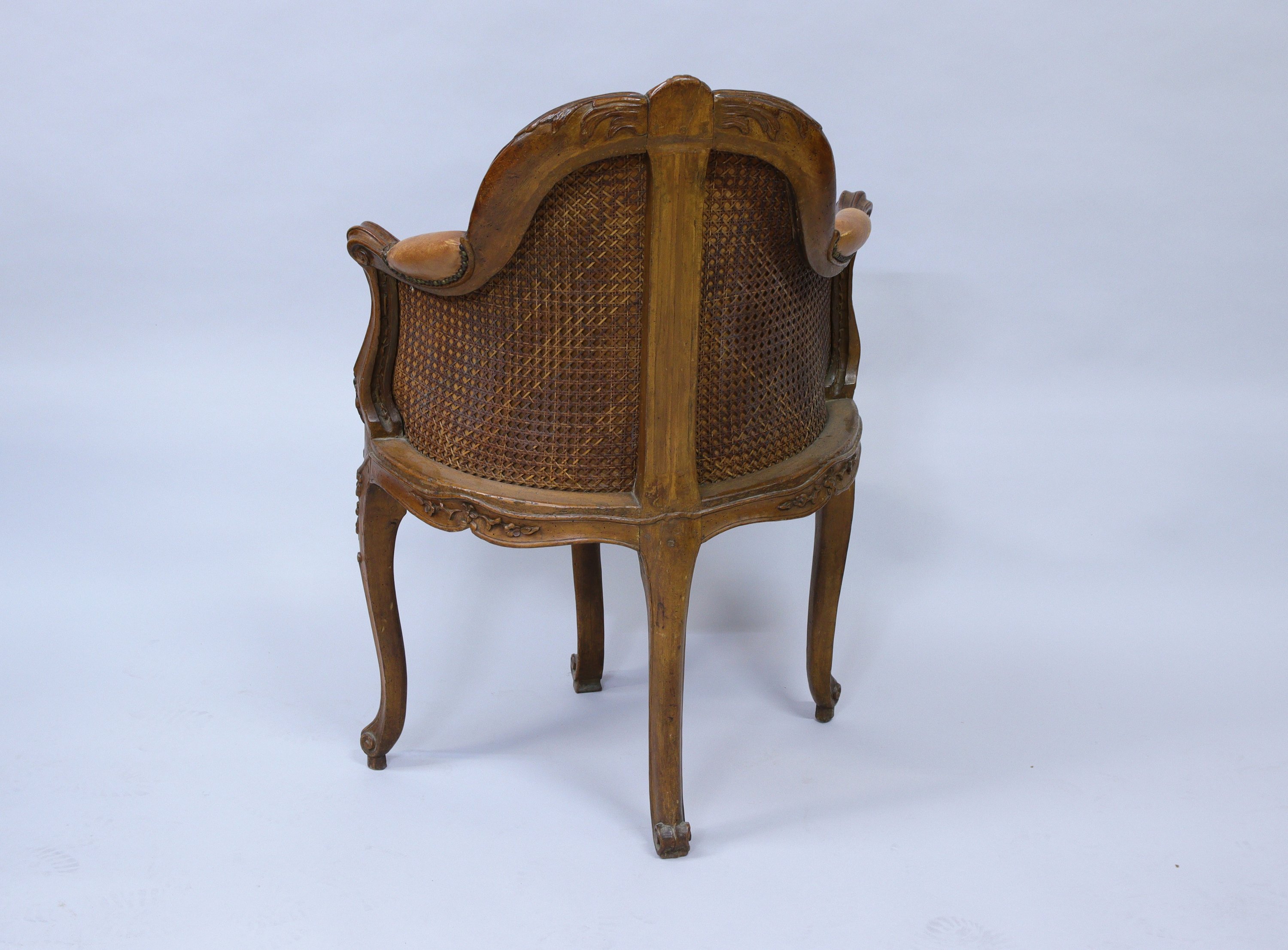de forme galbée, en bois mouluré et sculpté. Le dossier de forme gondole est décoré à l'amortissement de feuilles d'acanthe entourant un cartouche rocaille. Les accotoirs à manchettes reposent sur des consoles mouvementées. La ceinture à ressaut reprend le décor supérieur. Il repose sur quatre pieds cambrés terminés en enroulement.