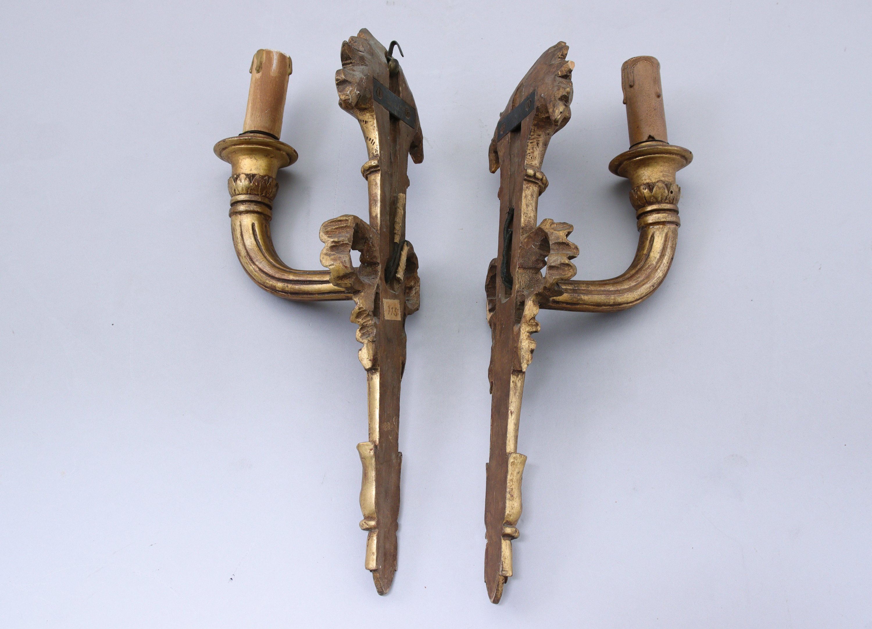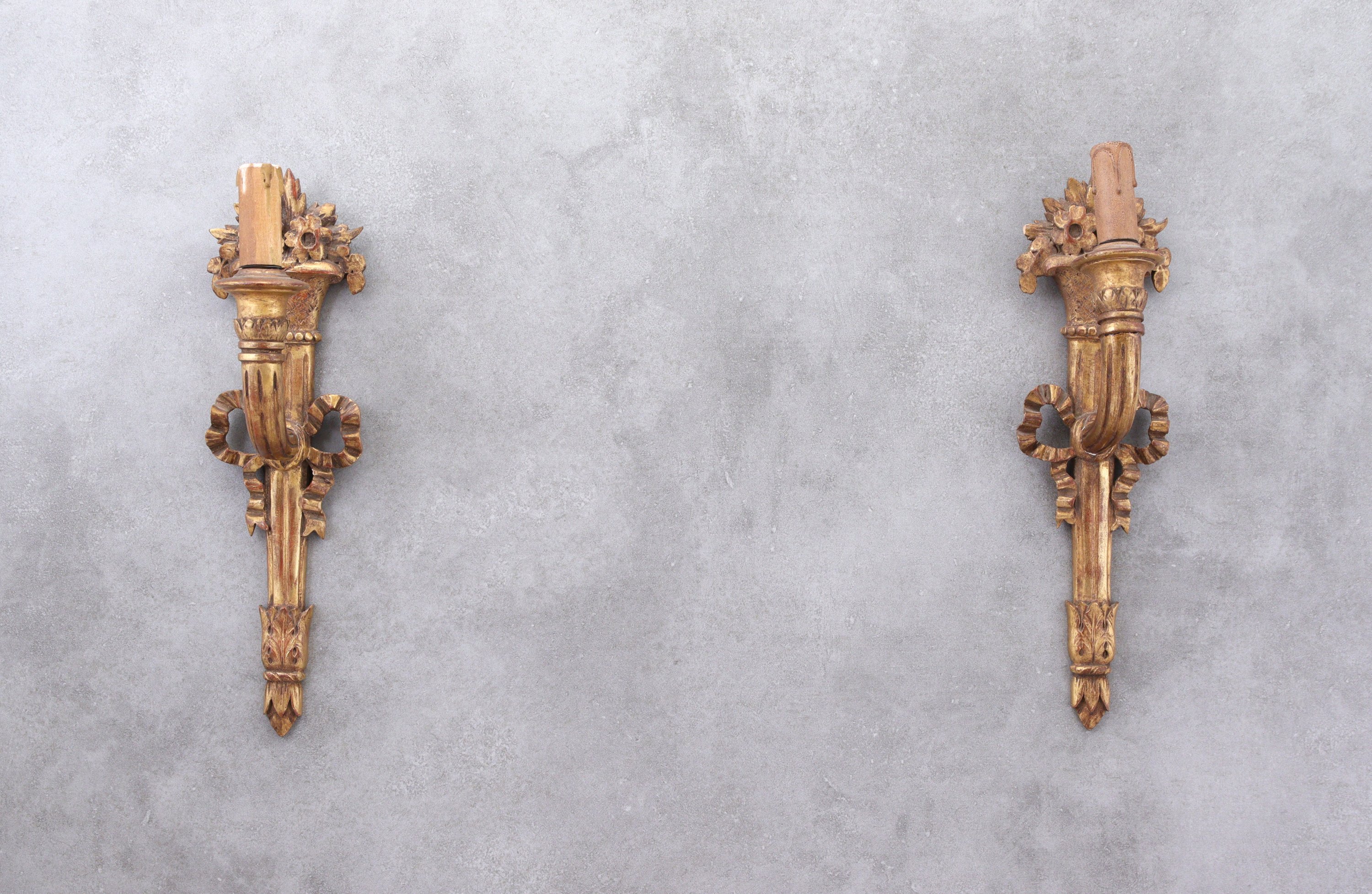 en bois doré à une lumière coiffée d'une panière fleurie supportée par un carquois cannelé et décoré d'un noeud enrubanné. La partie inférieure présente une graine et feuilles d'acanthe.