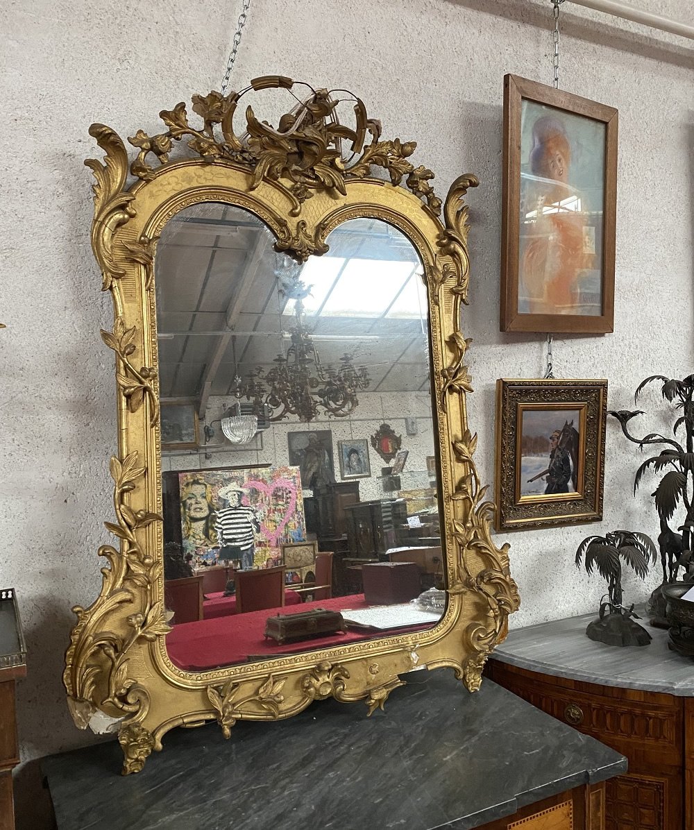 en bois et stuc doré, mouluré, gravé et sculpté de forme violonée. La partie supérieure présente une coquille ajourée au décor feuillagé se prolongeant sur les côtés par des feuilles d'acanthe et branches de laurier.