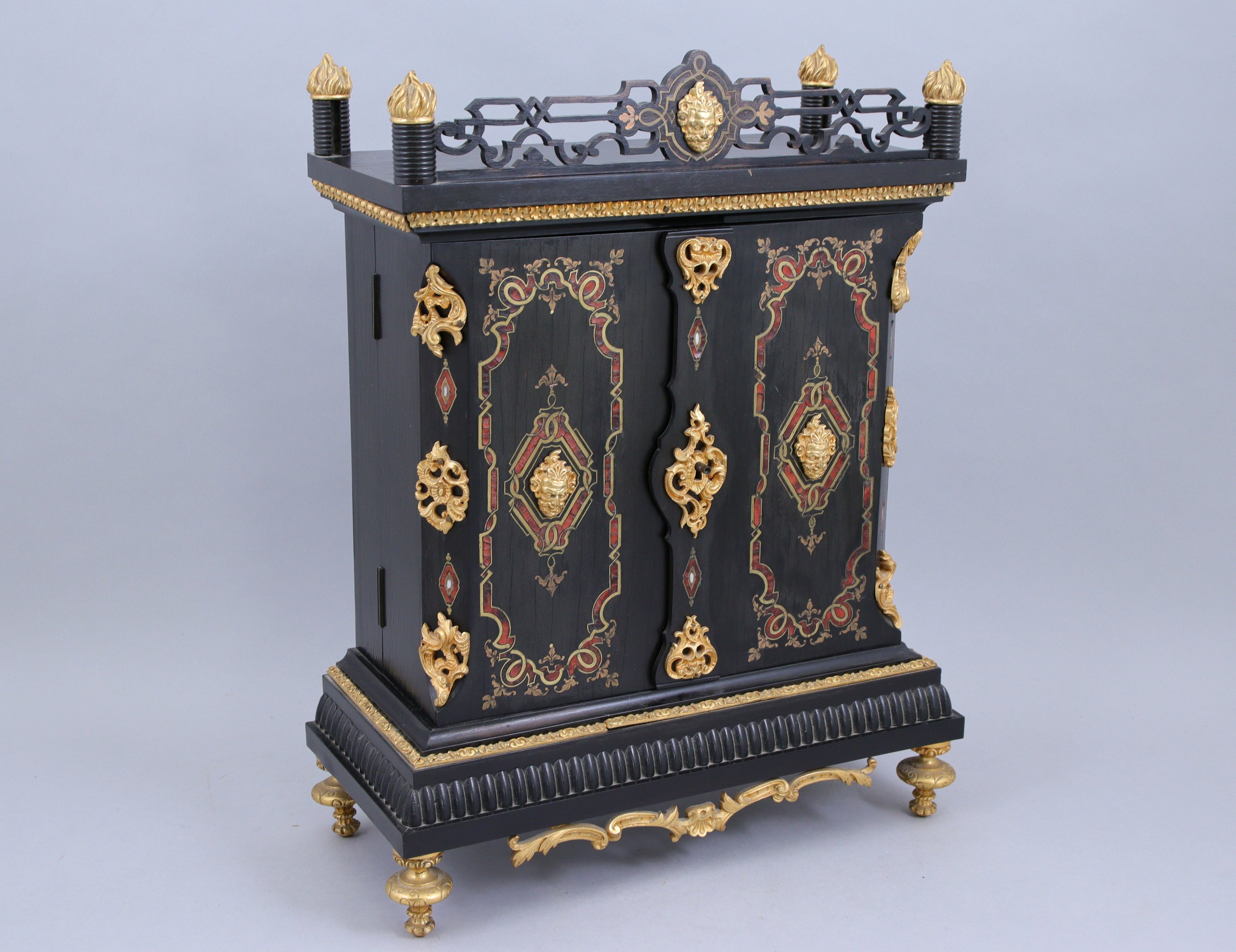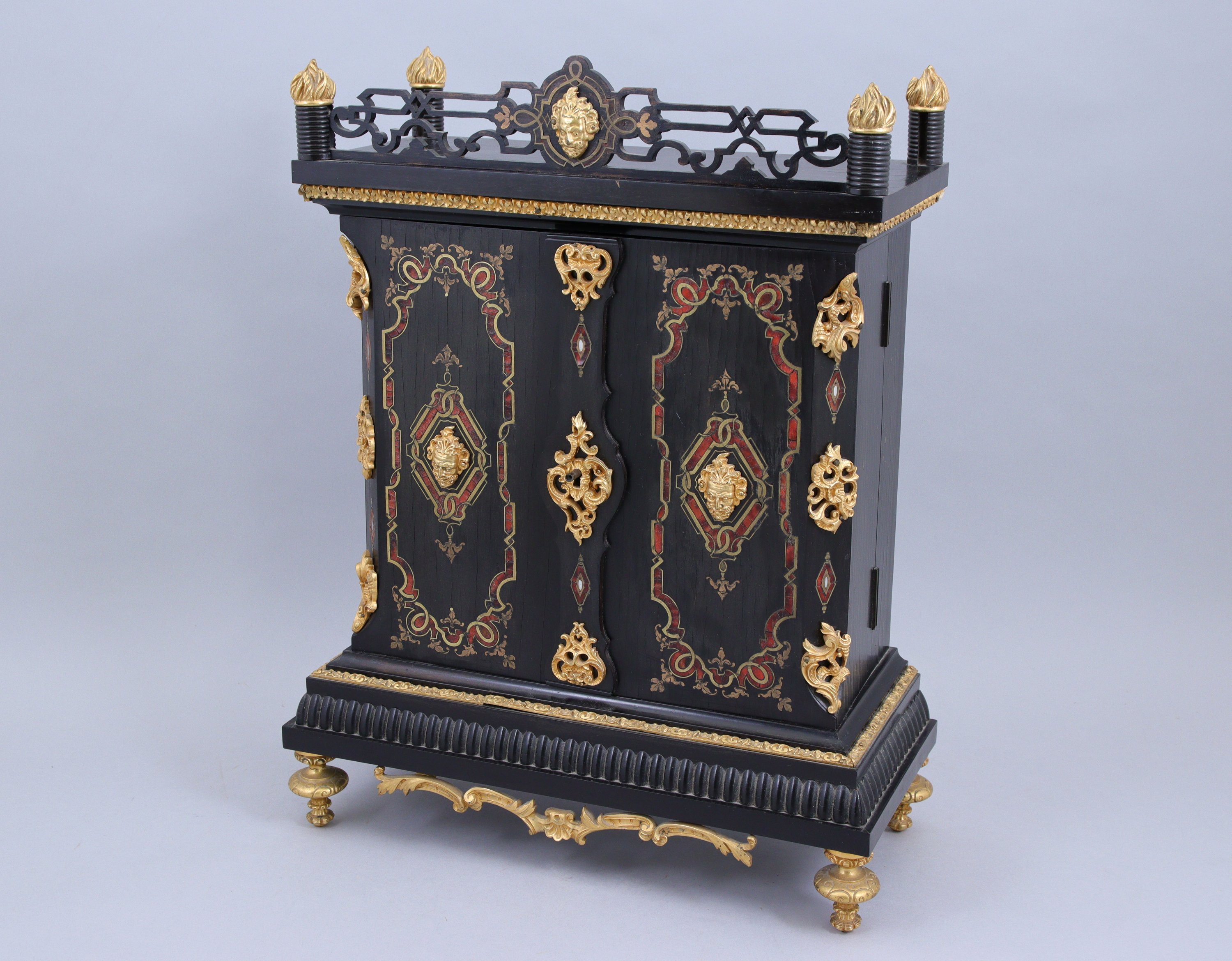 en bois noirci ouvrant en façade par deux portes décorées de mascarons dans des encadrements de laiton et écaille teintée rouge à motifs de rinceaux. Elles découvrent un nécessaire à écrire avec classeur à courrier, porte-crayons, encrier en verre et calendrier de janvier 1844. Il est orné en partie supérieure de quatre feux et d'un mascaron entouré de frises ajourées. Repose sur quatre pieds toupies. Entrée de serrure, piétement, chutes et tablier en métal doré.