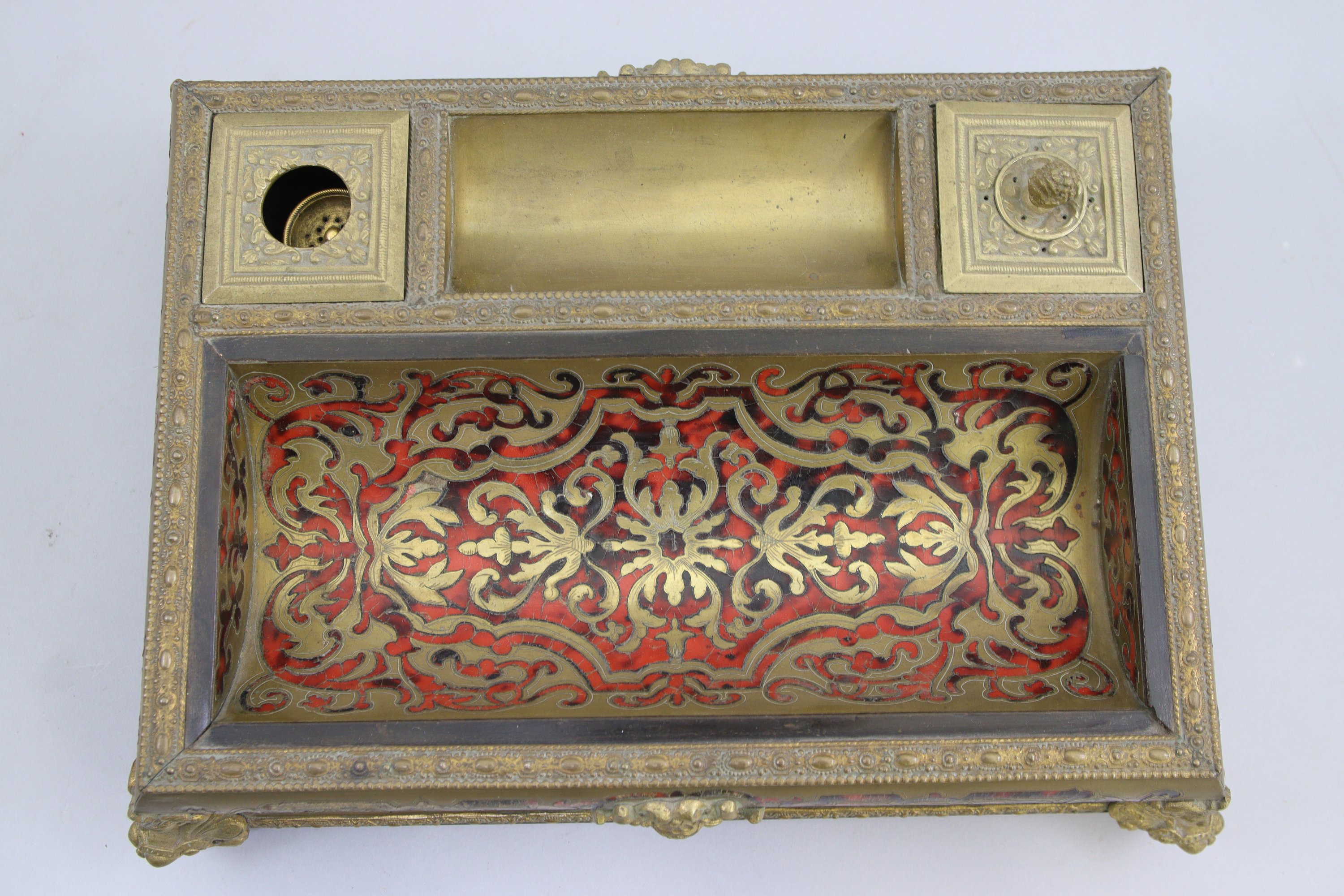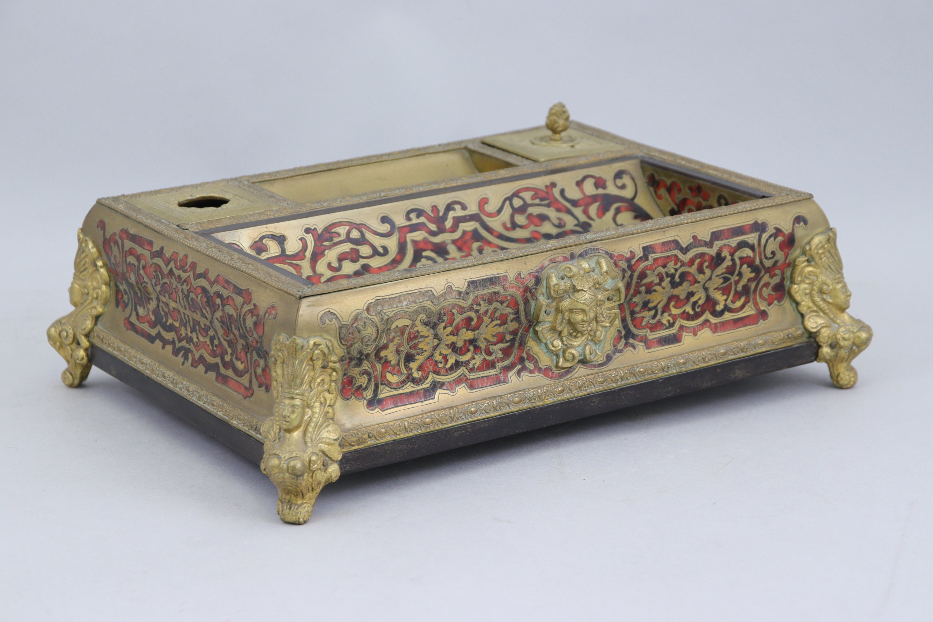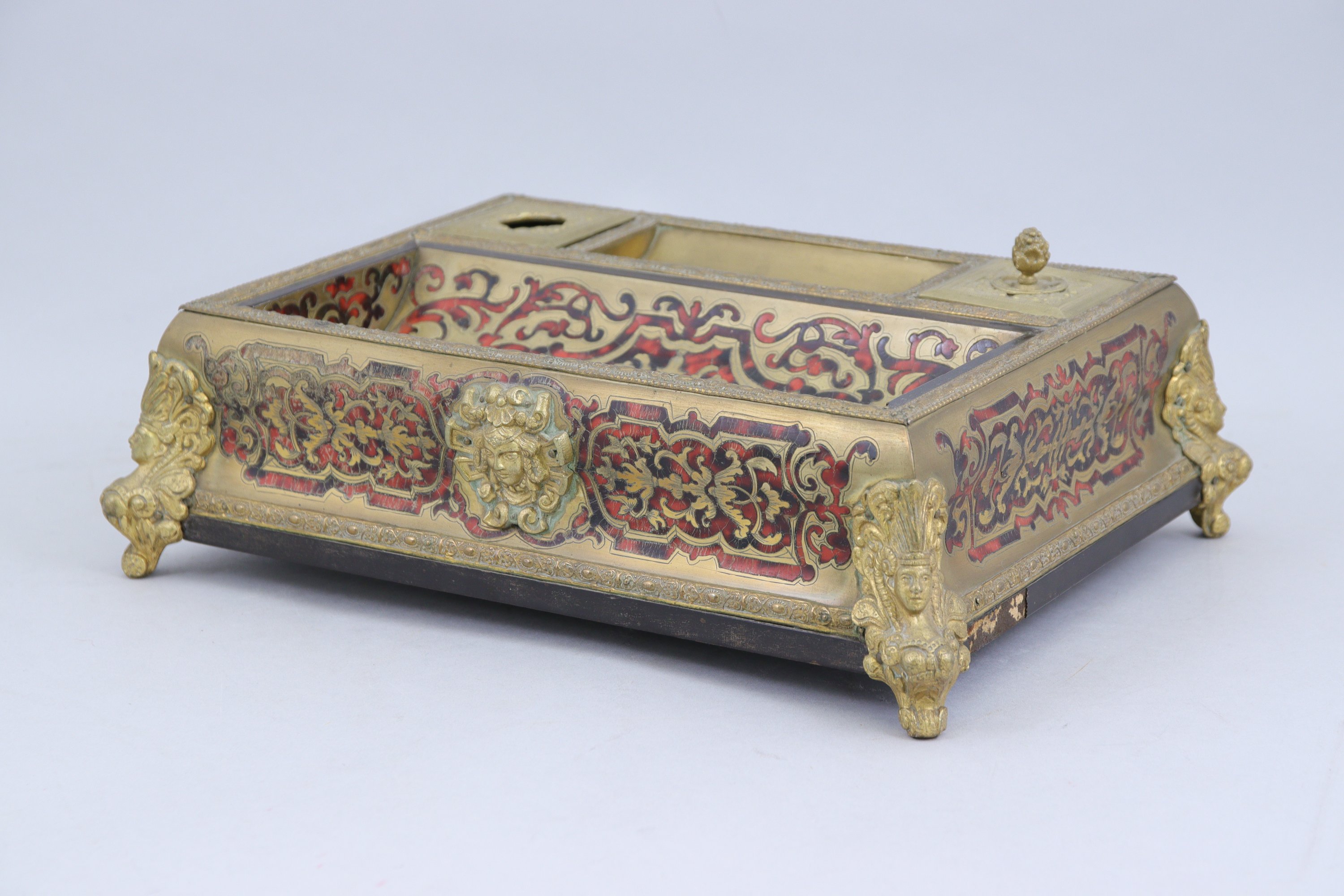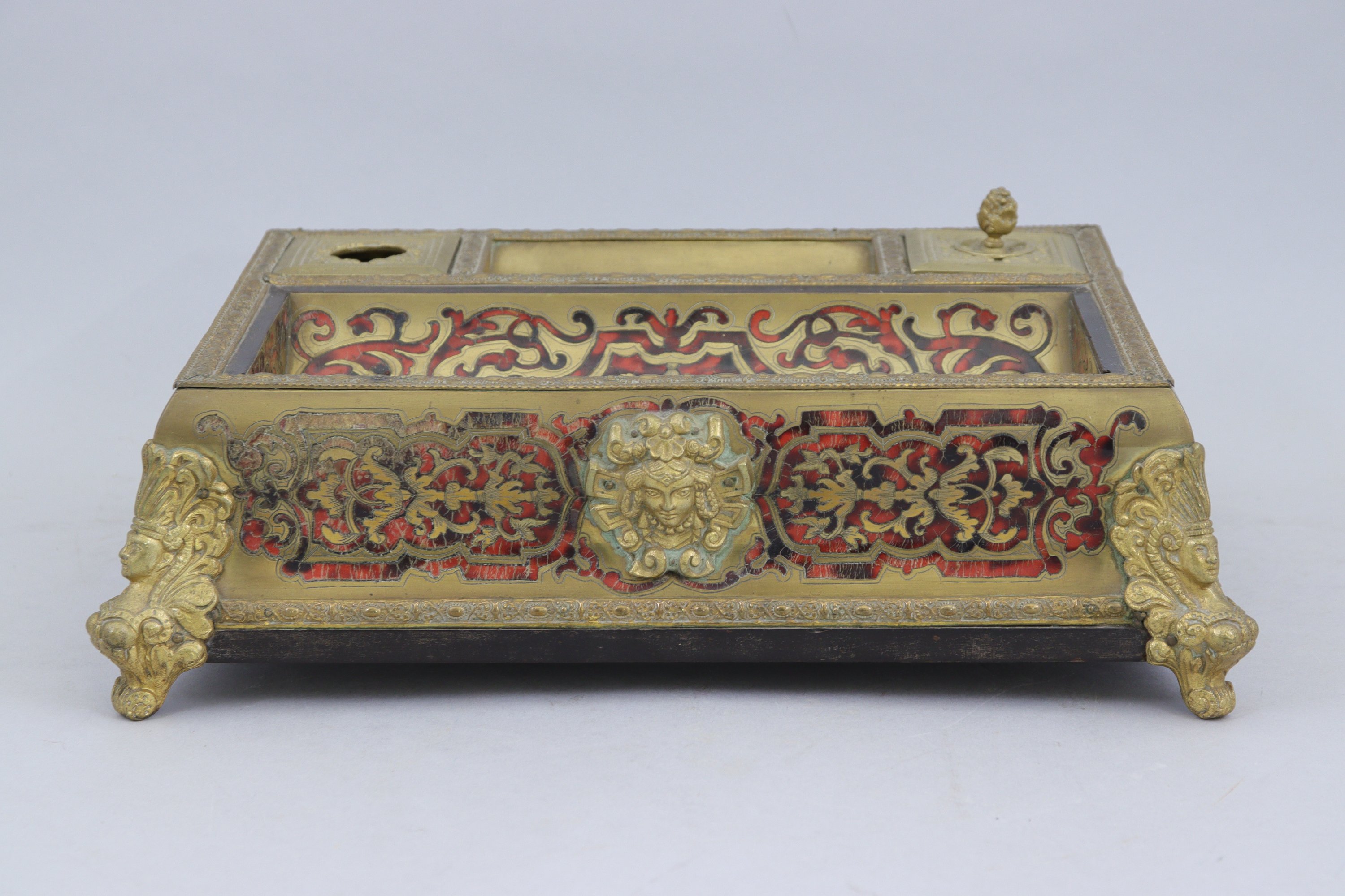 d'écailles teintées rouge et laiton sur fond de bois laqué noir décoré de rinceaux sur toutes les faces. Emplacements pour encrier, sablier et plumier. Riche ornementation de bronze doré dont quatre pieds en forme d'espagnolettes.