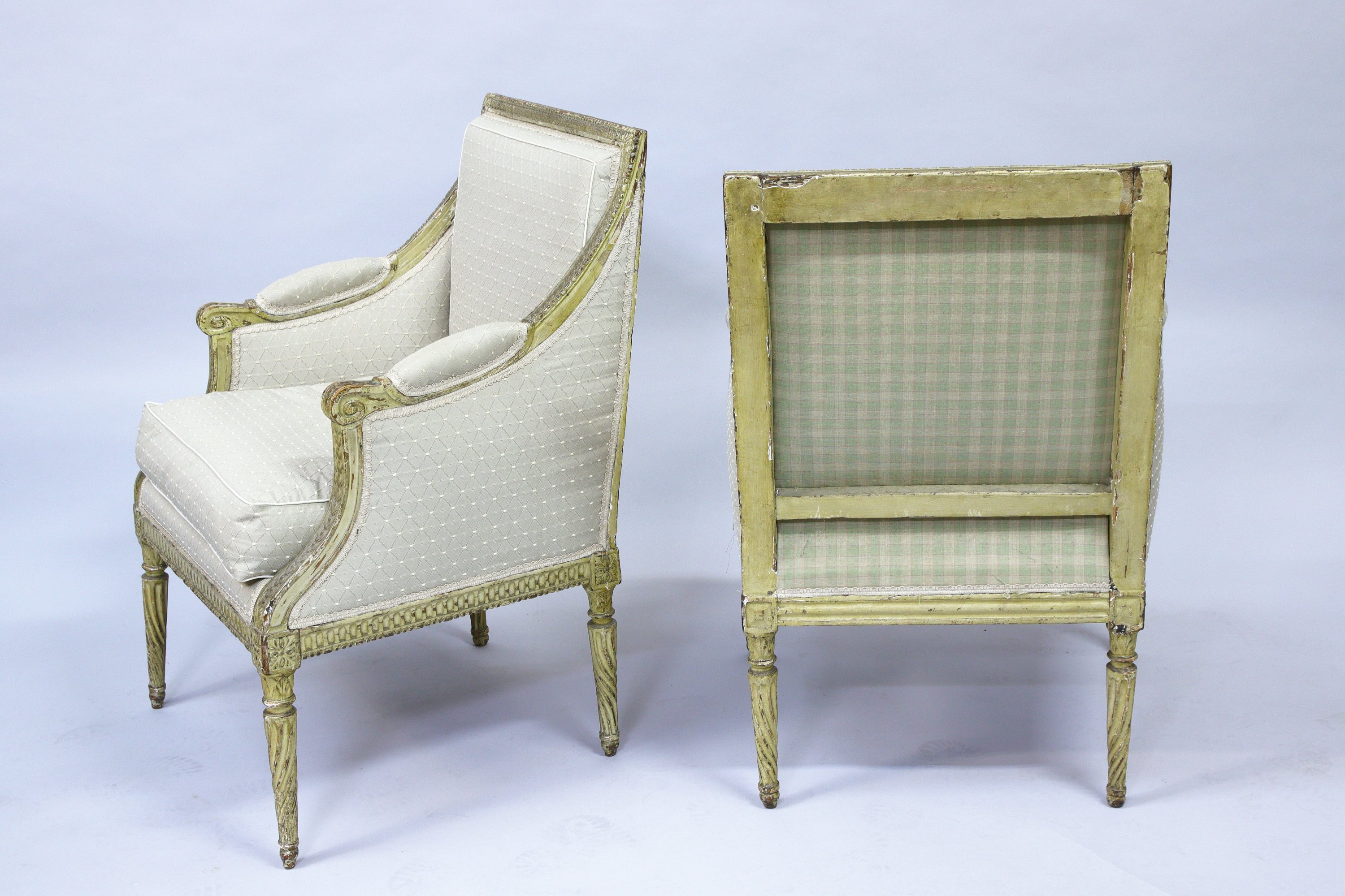en bois laqué blanc, mouluré et sculpté. Le dossier rectangulaire à décor de frises de perles et piastres, les accotoirs à manchettes, les suppports d'accotoirs en console reprenant le décor du dossier. Les dès de raccordement sont sculptés de fleurettes épanouies. Elles reposent sur quatre pieds torsadés de section ronde.