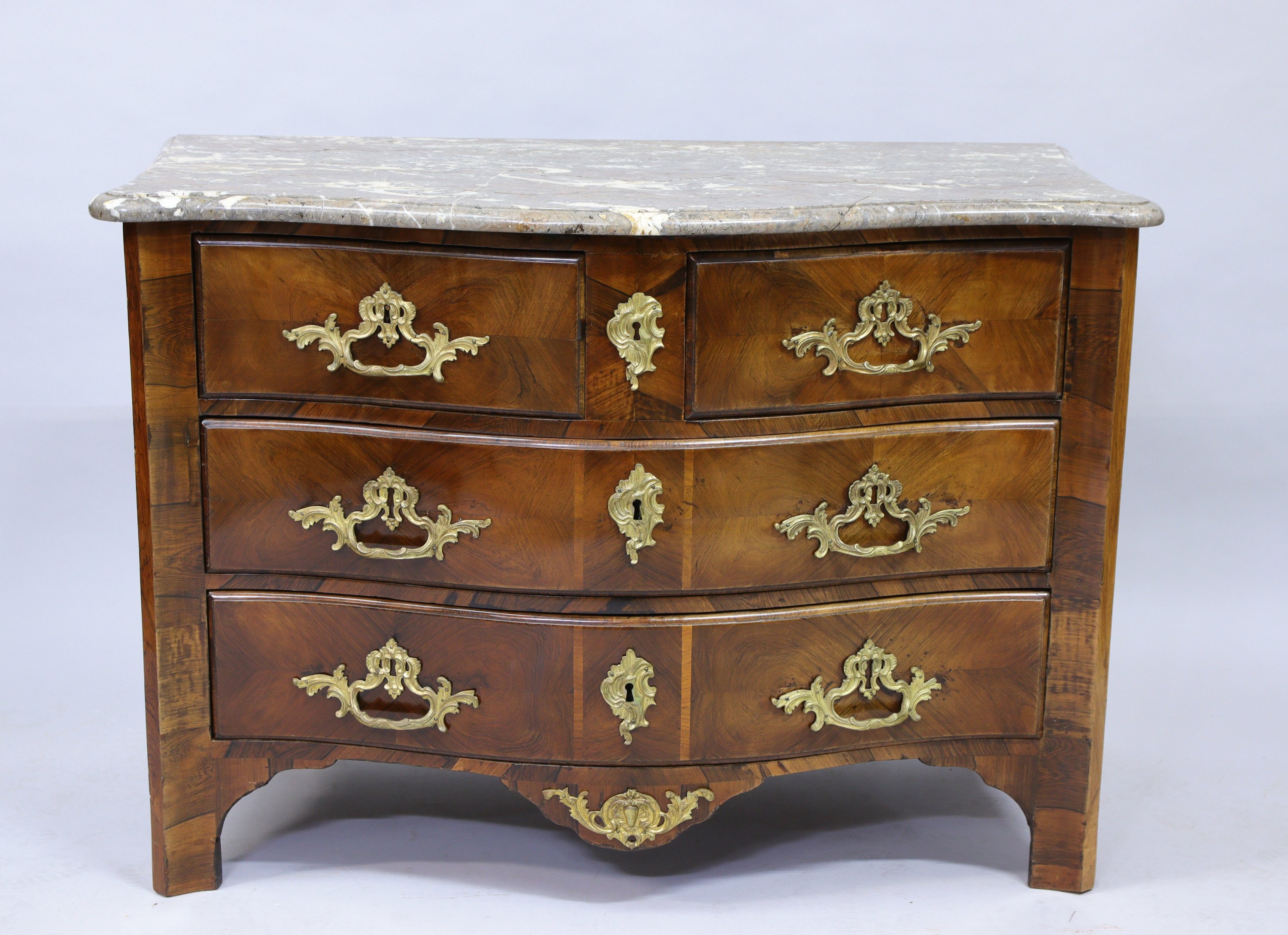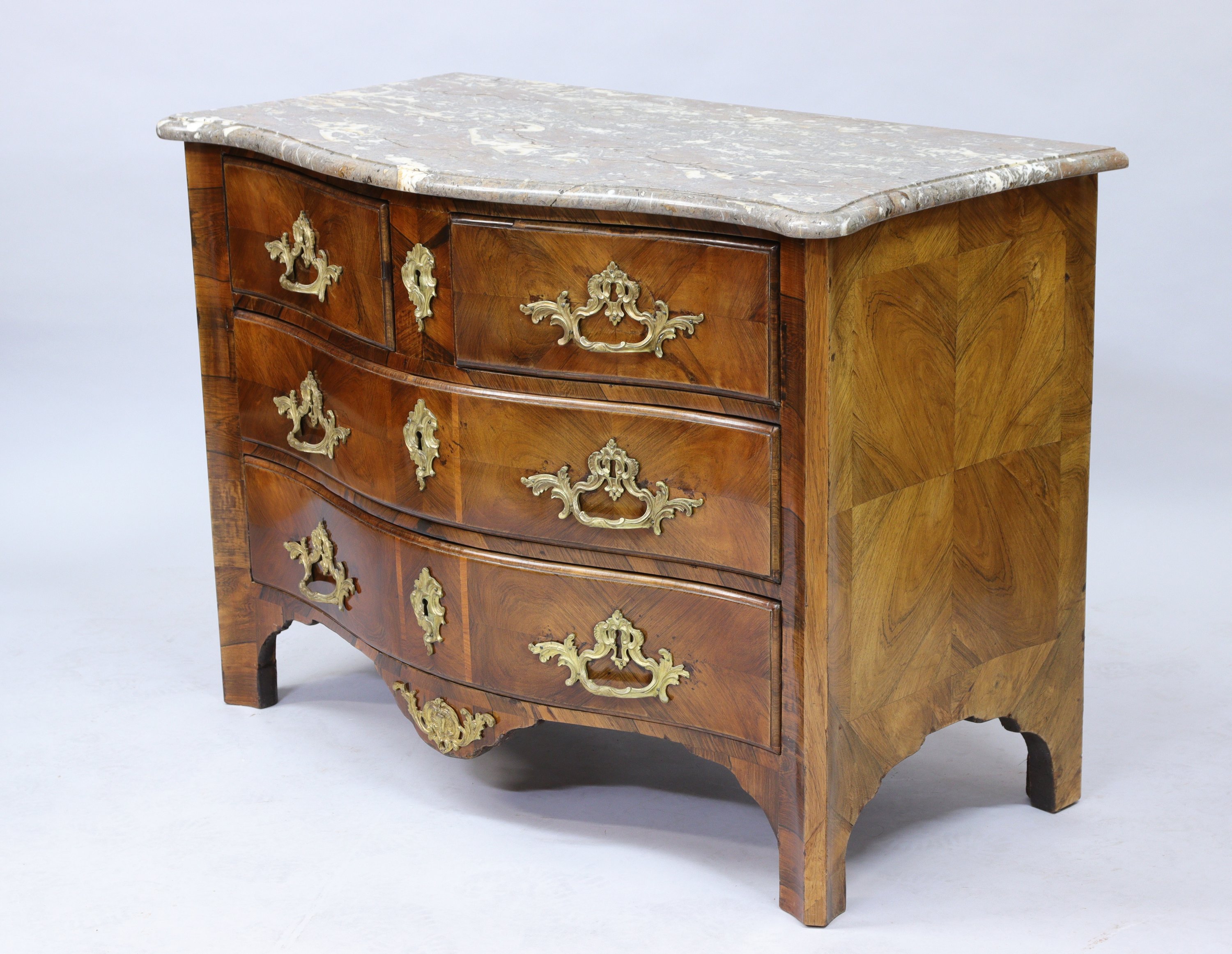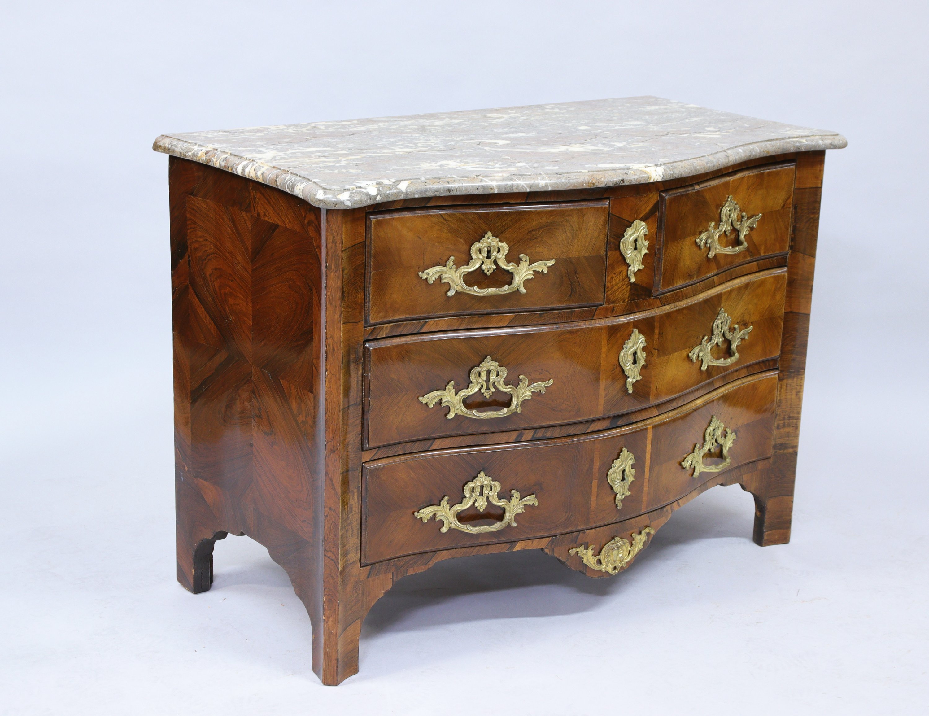 en bois de placage ouvrant par quatre tiroirs sur trois rangs. La façade à décor d'une marqueterie en X, les côtés en ailes de papillon. Les montants légèrement pincés. Quatre pieds droits.