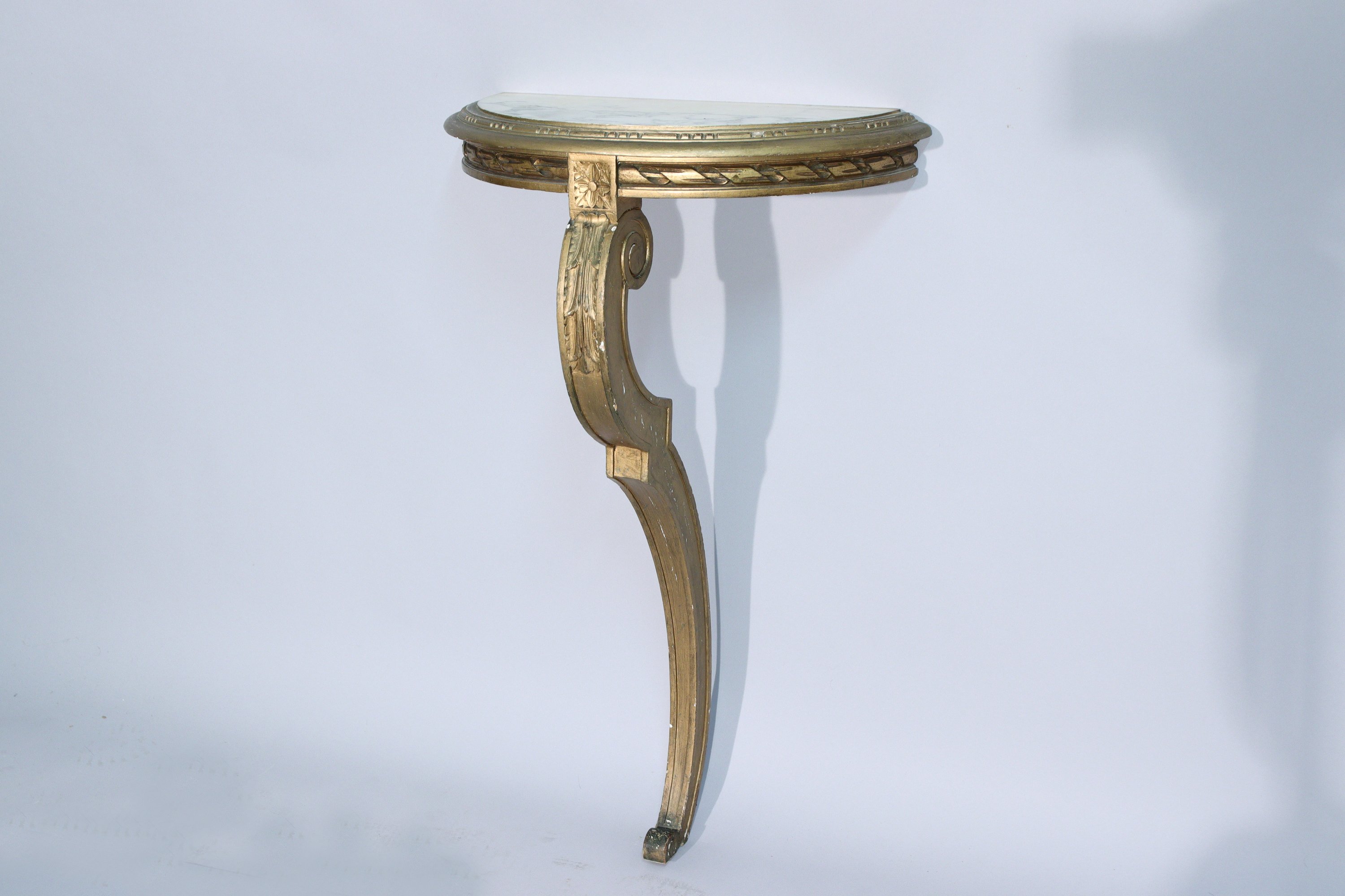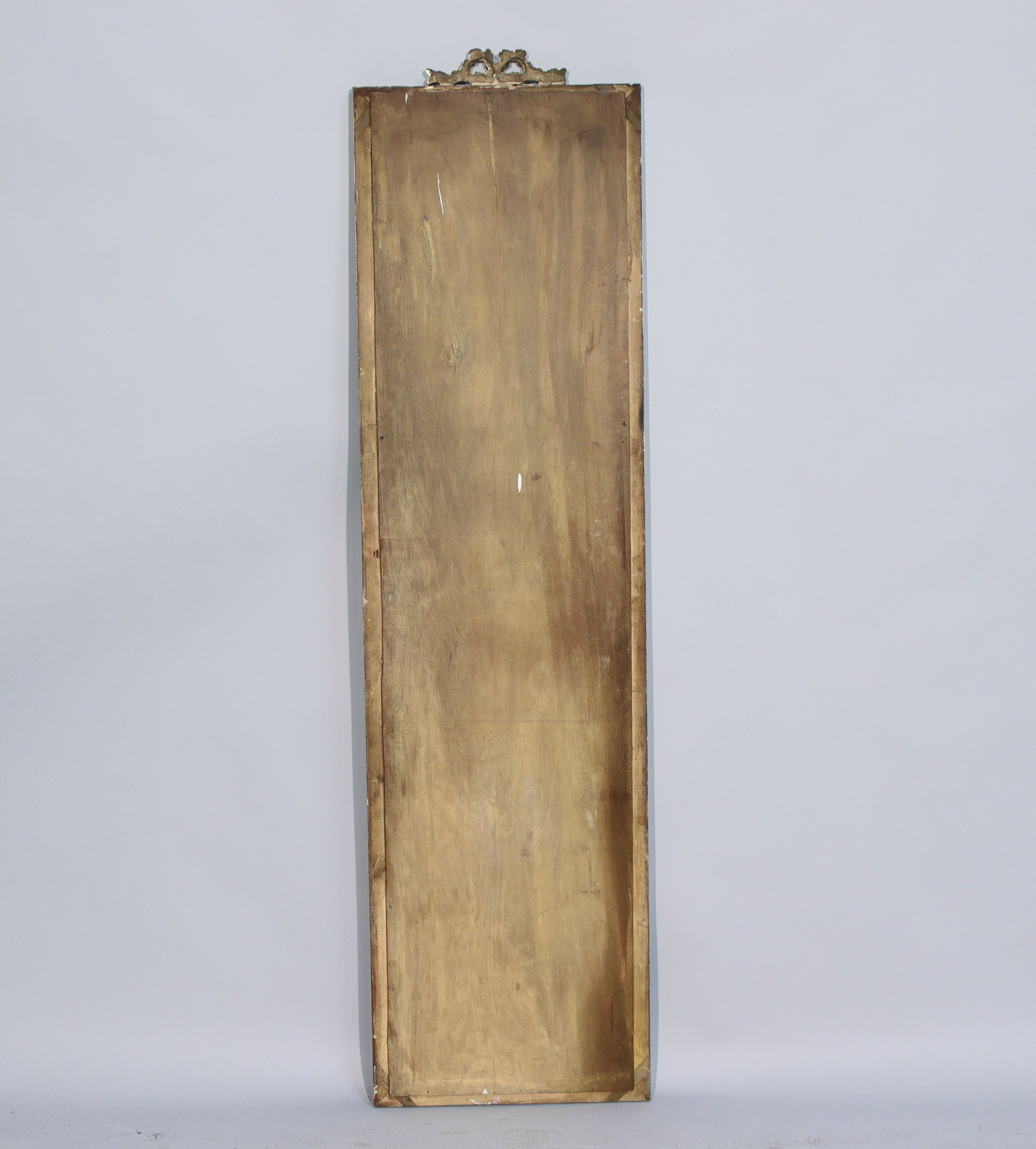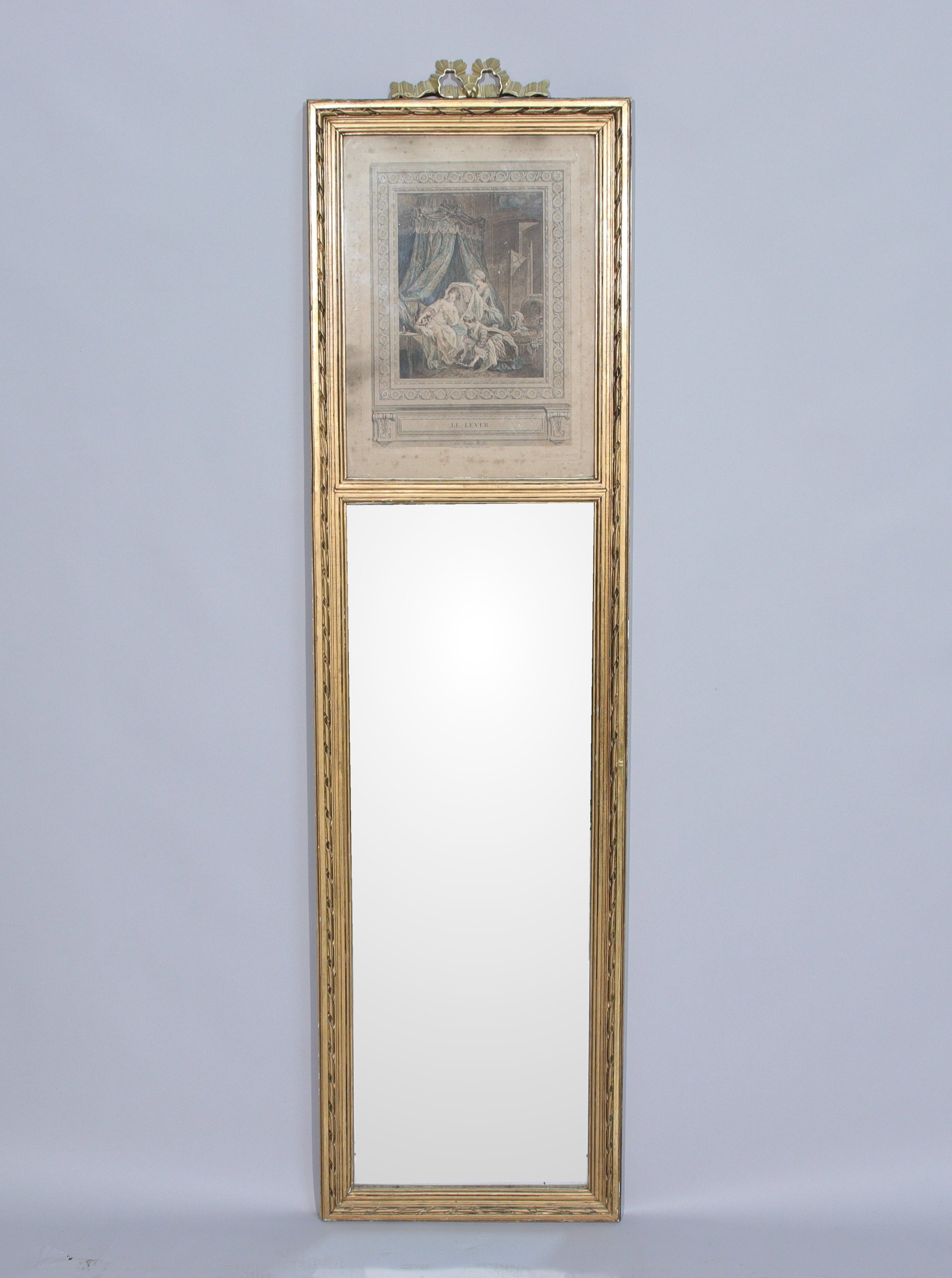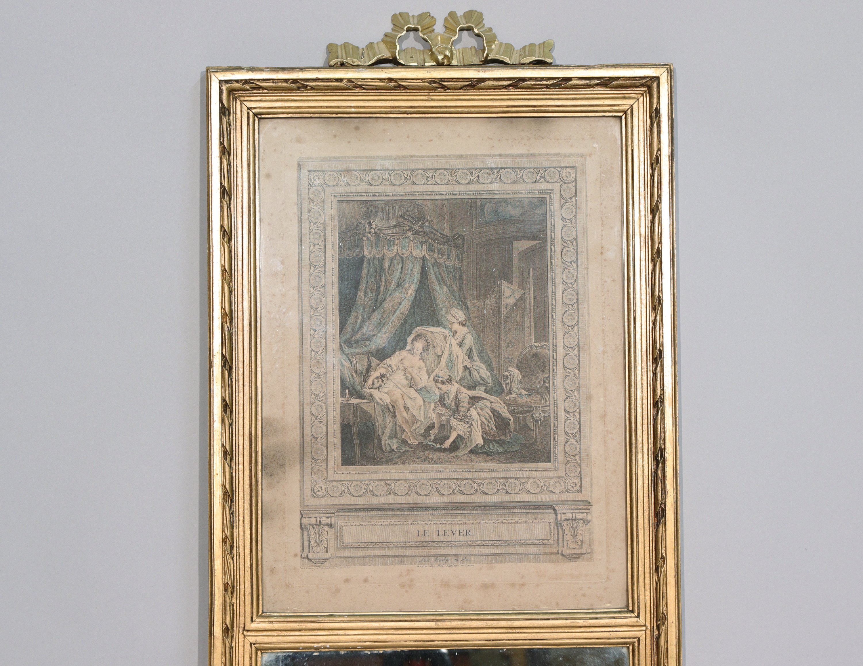 en bois redoré à décor de feuilles d'acanthe et de frises géométriques, dessus de marbre blanc. Le trumeau est orné d''une gravure "Le Lever" sous un miroir encadré de boiseries à décor de rubans noués en bois redoré.