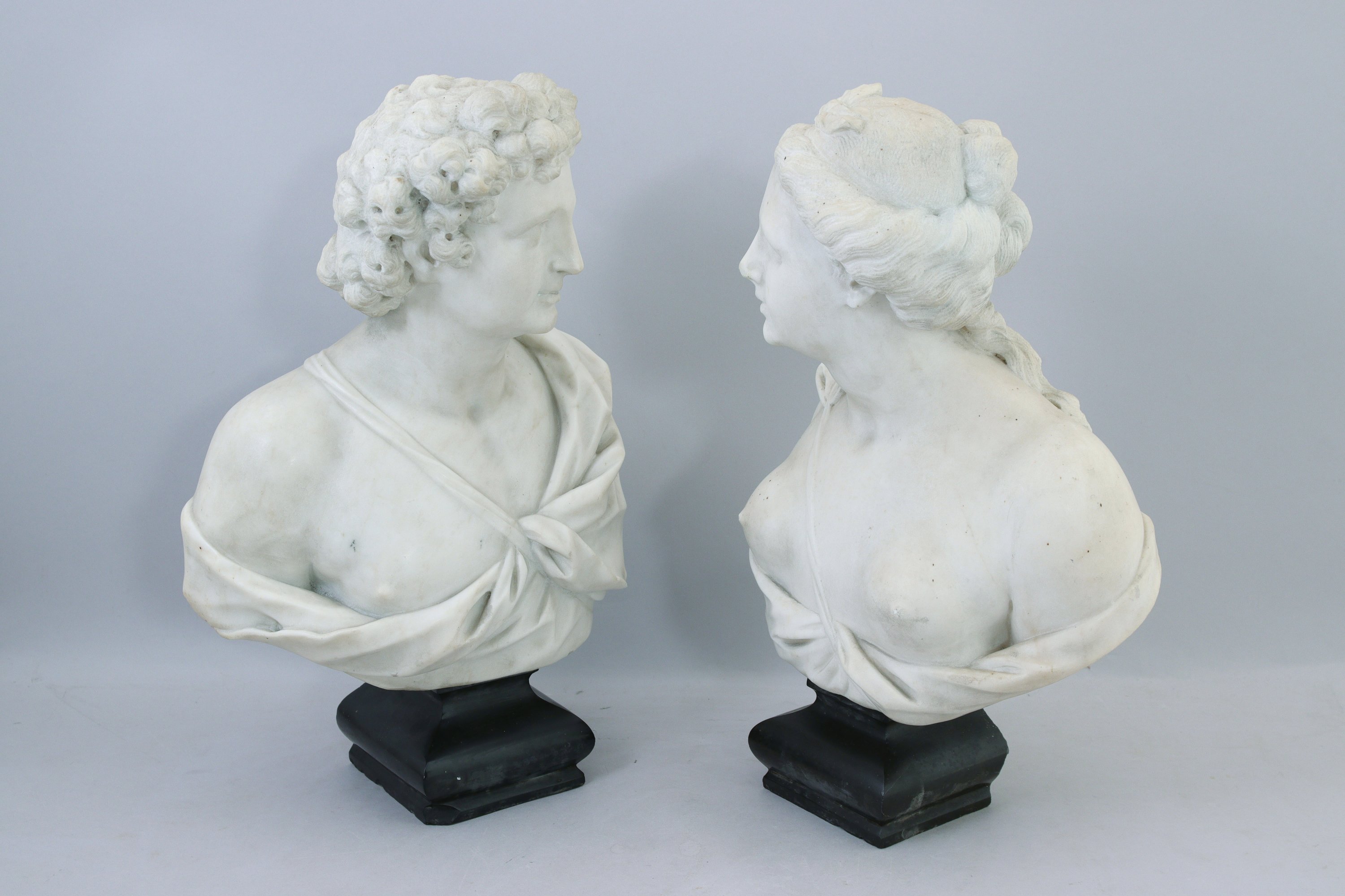 Paire de bustes en marbre blanc, sur socle de marbre noir figurant la déesse de la chasse et le dieu Apollon.