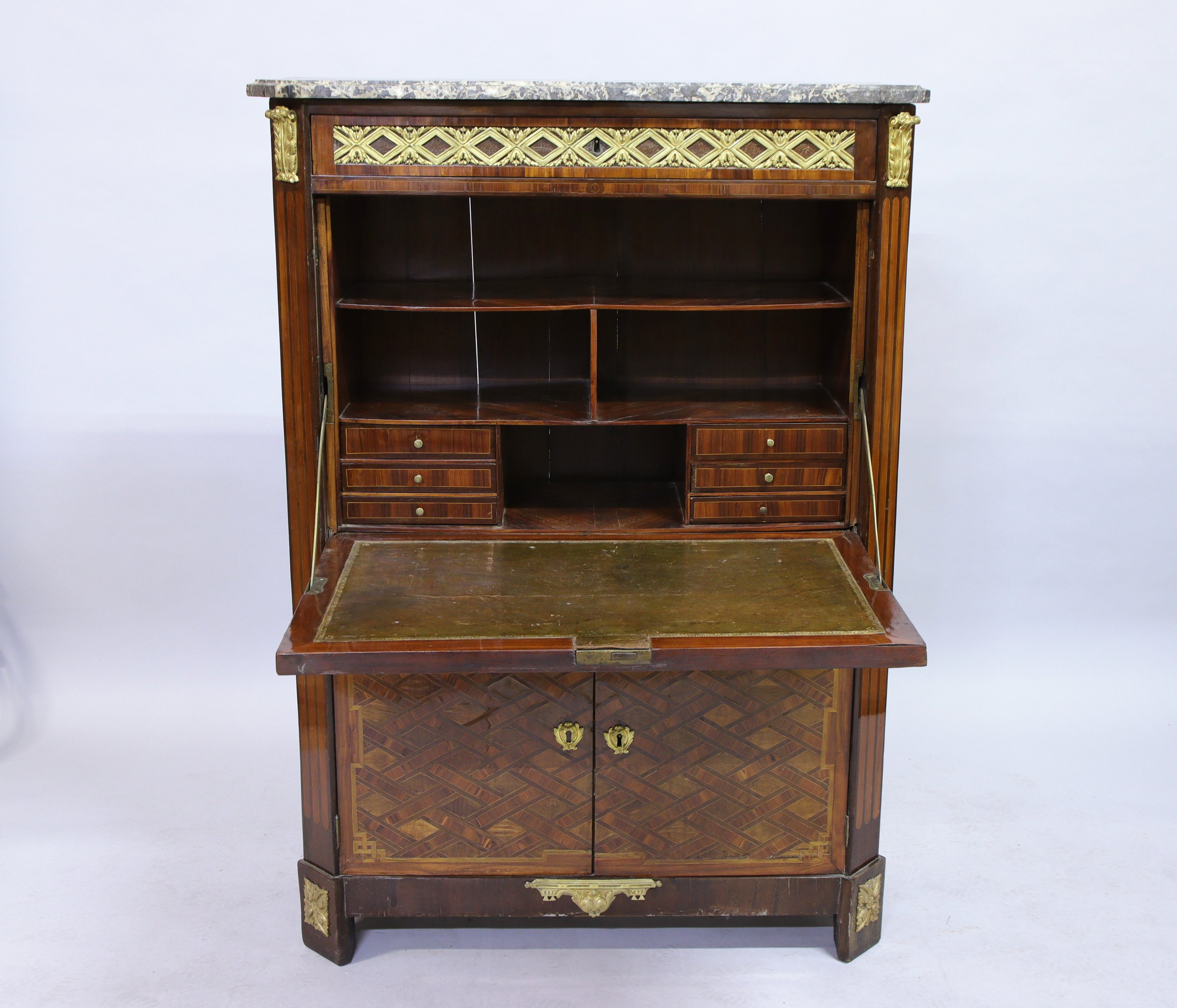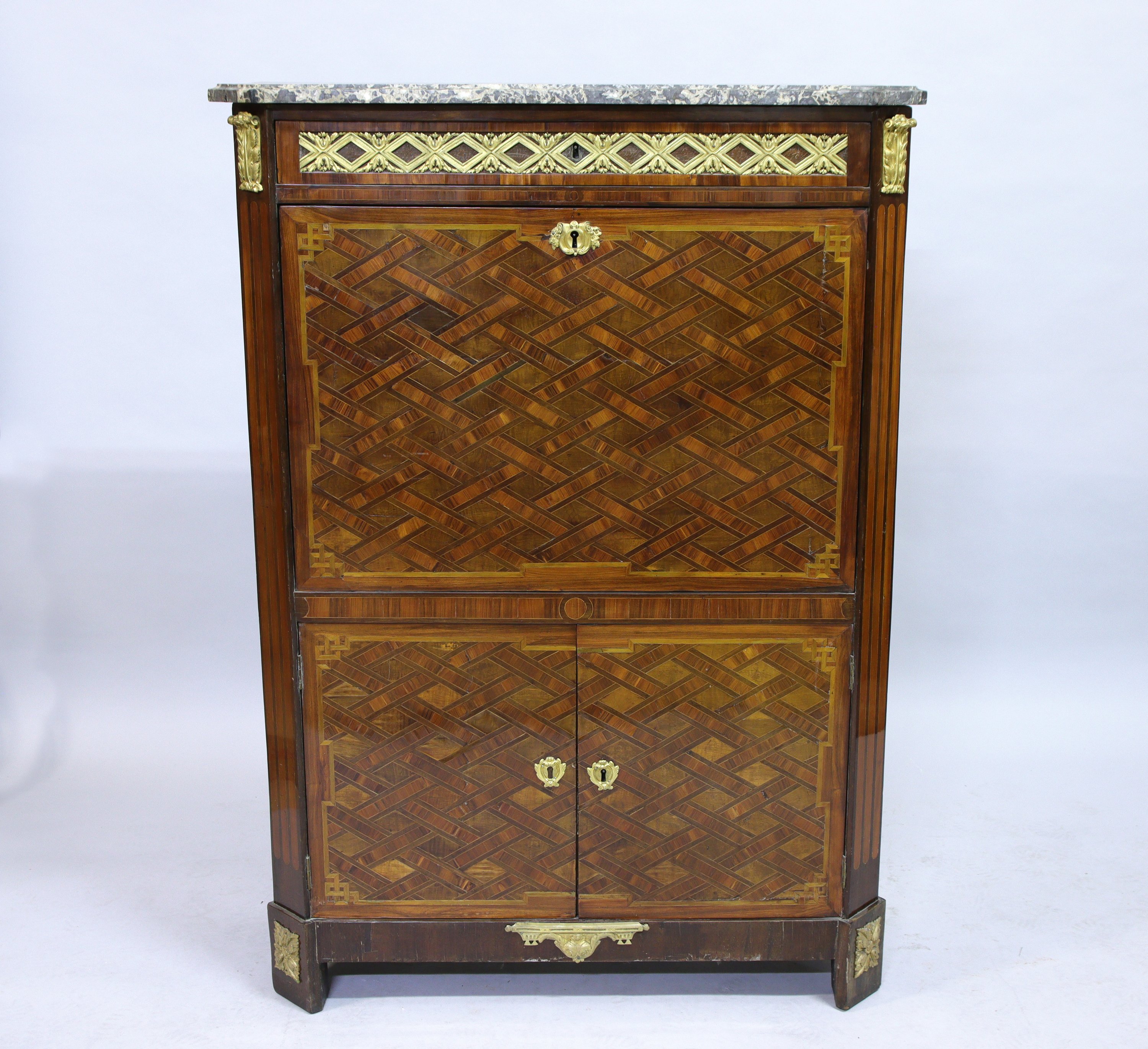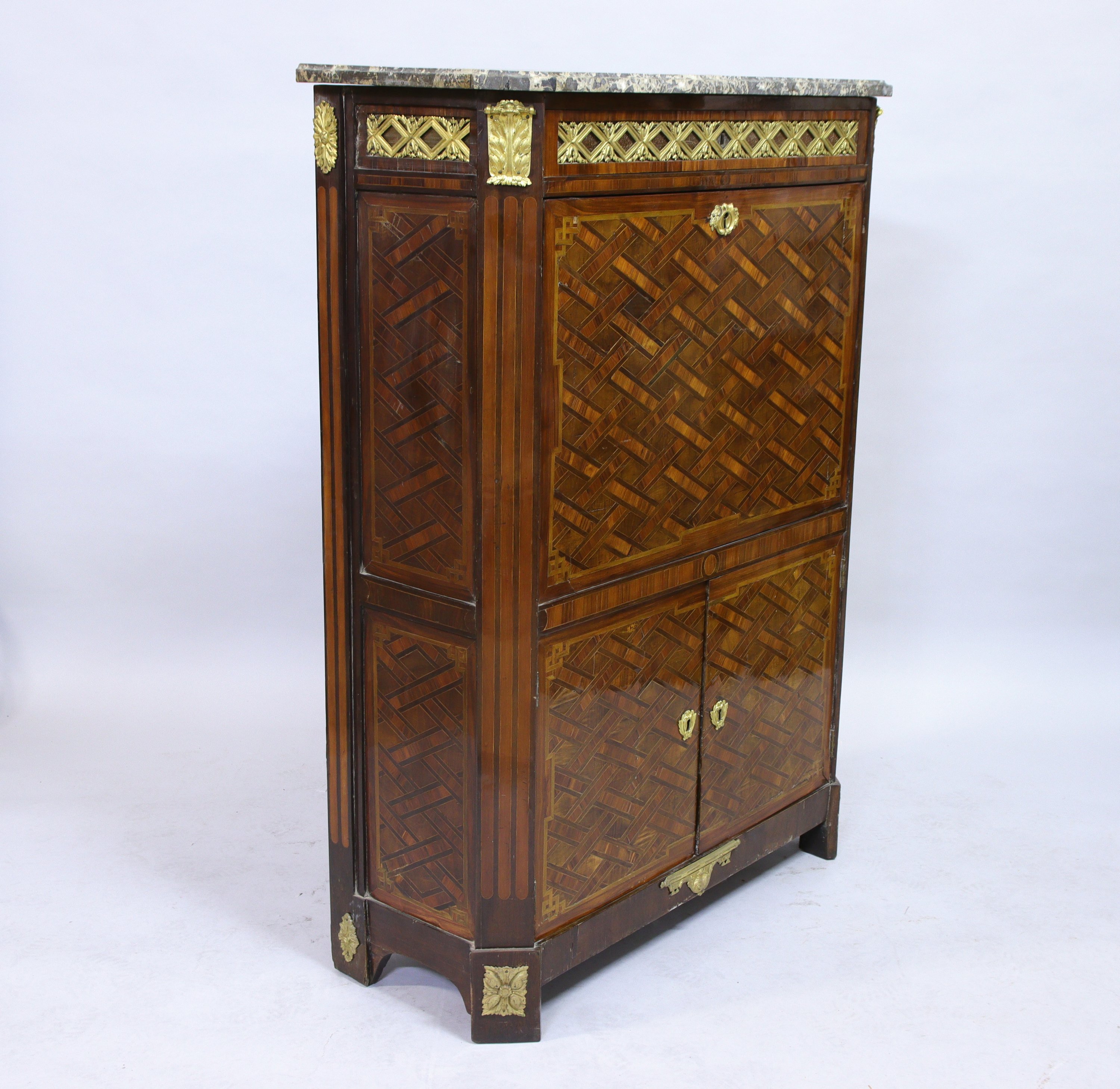 en placage de bois de rose et amarante. Il ouvre en façade par un tiroir surmontant un abattant qui découvre six tiroirs sur deux rangs et quatre compartiments. Deux vantaux en partie inférieure. La façade présente un décor de croisillons dans un encadrement aux angles rentrés. Dessus de marbre gris Sainte-Anne.